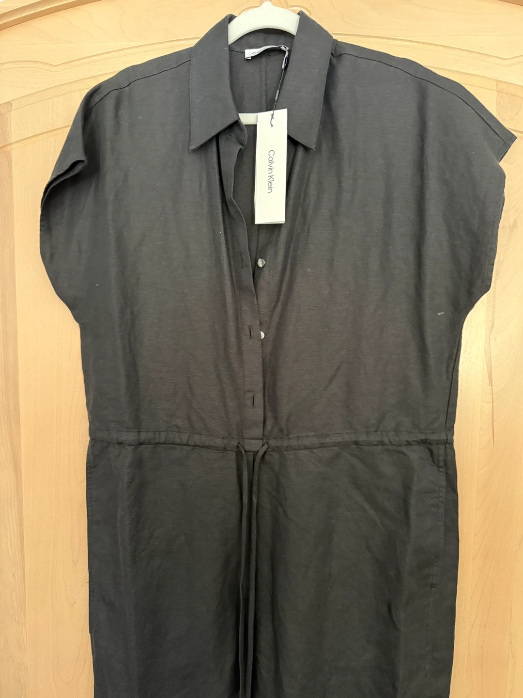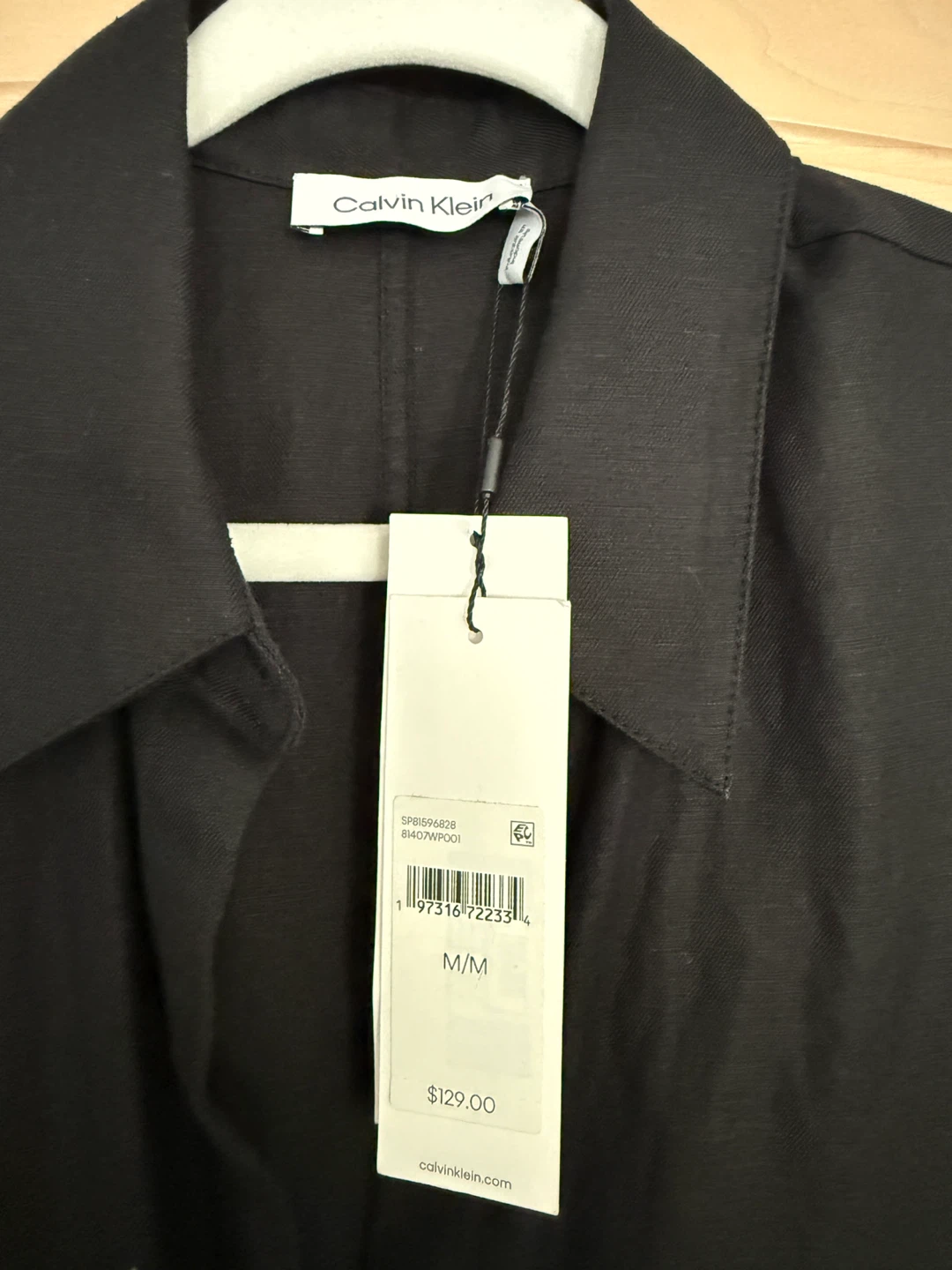 This is a brand new Calvin Klein black jumpsuit in size M/M. The original price on the tag is $129.00. It's a stylish and comfortable piece that would be a great addition to any wardrobe!