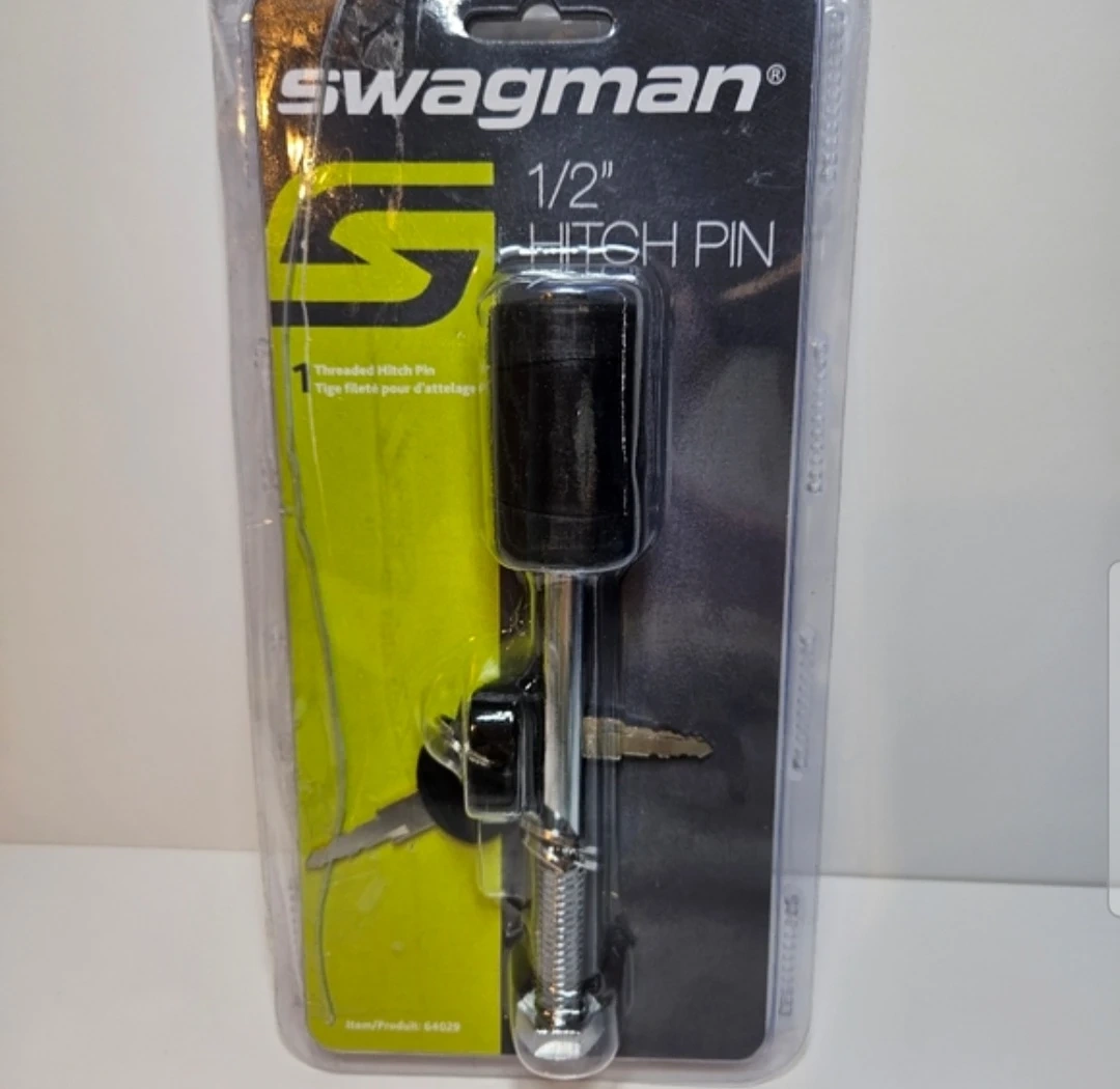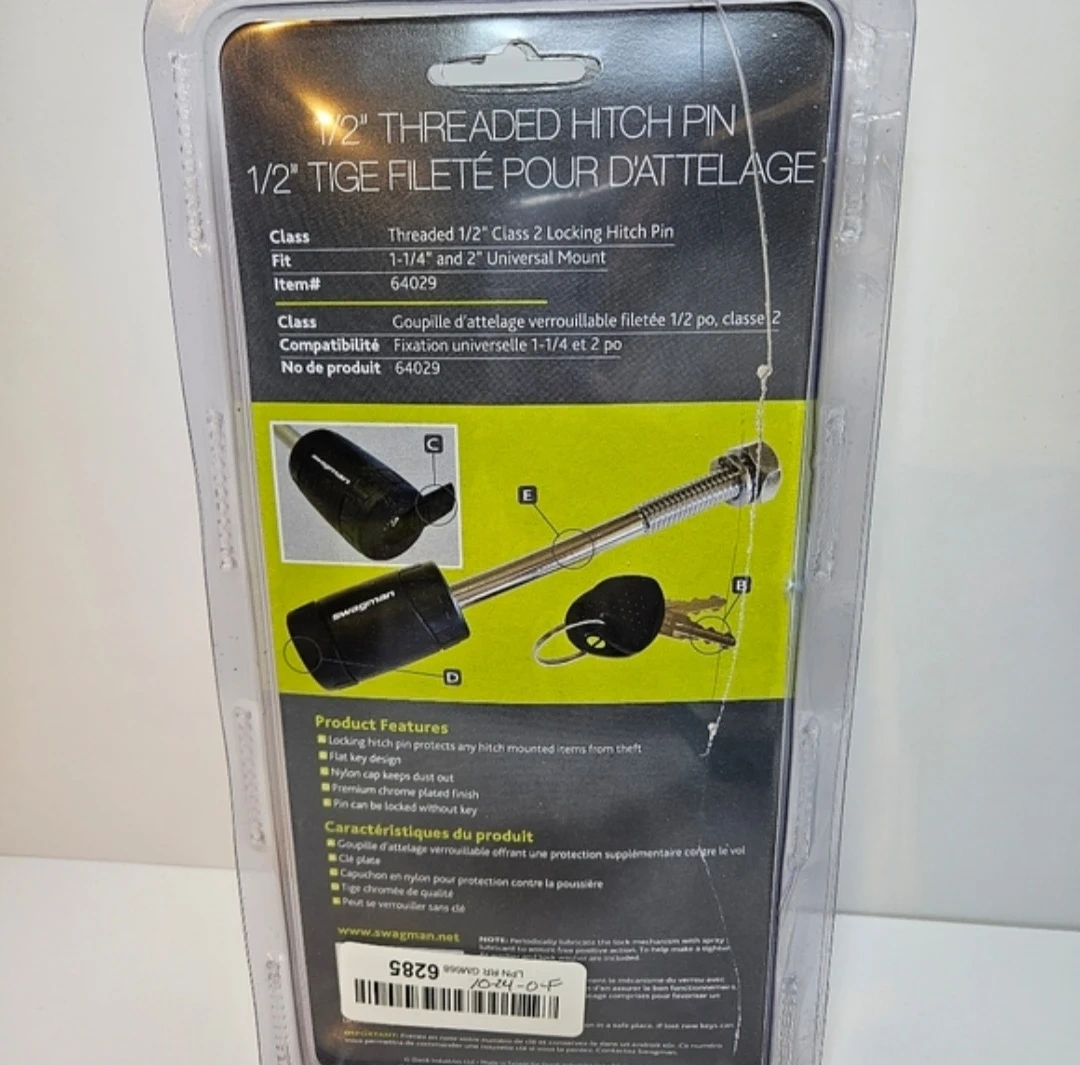 Selling a brand new Swagman 1/2" Threaded Class 2 Locking Hitch Pin! It fits 1-1/4" and 2" Universal Mounts. The item number is 64029. The locking hitch pin protects any hitched mounted items from theft. It has a key design and a nylon cap to keep dirt out. It also has a premium chrome plated finish and the pin can be locked without the key