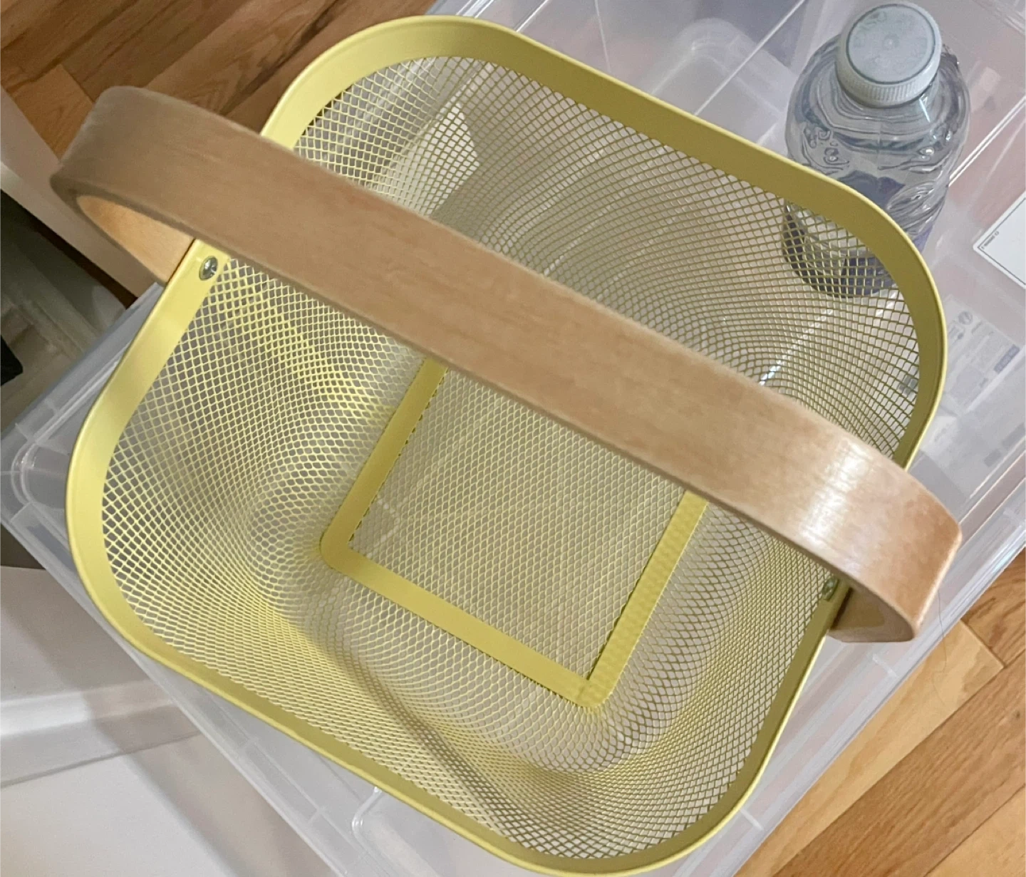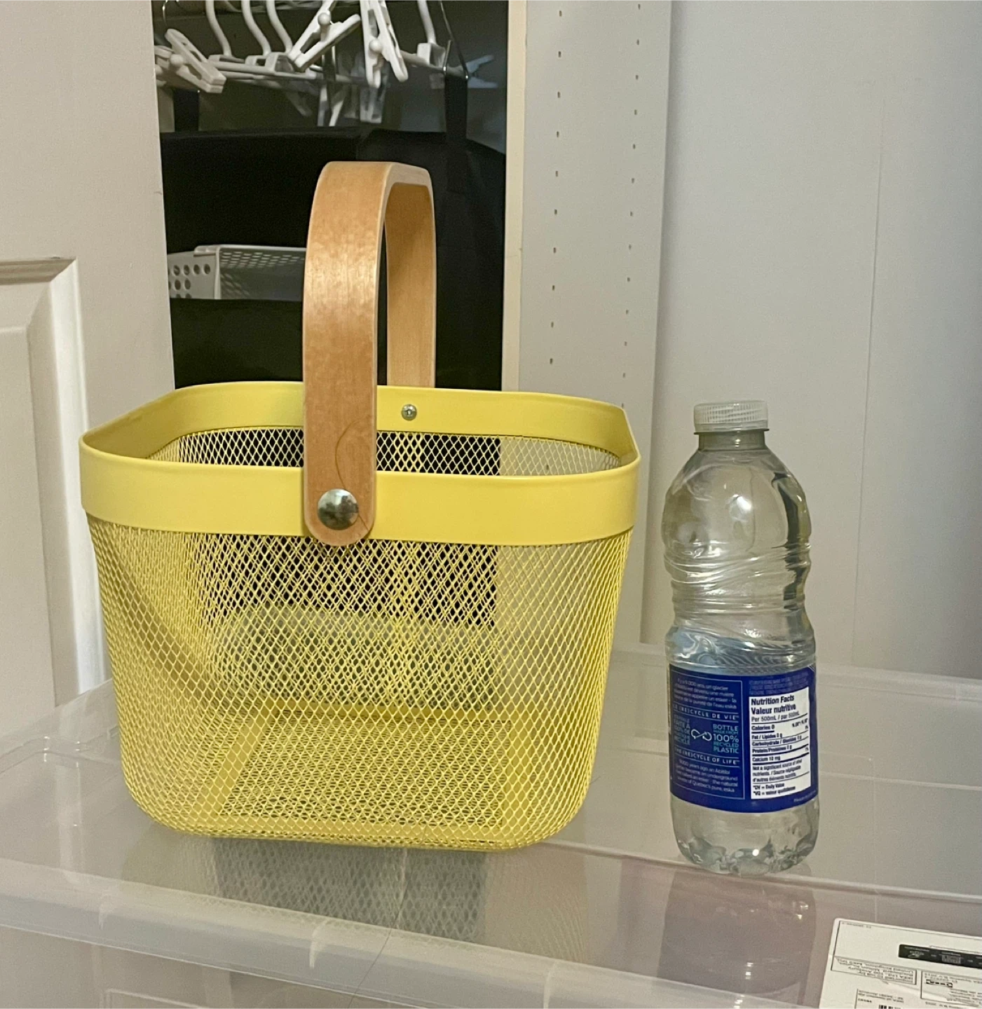 Selling a cute yellow IKEA Risatorp basket! It's in great condition and perfect for storage or carrying items around the house. The wooden handle adds a nice touch!