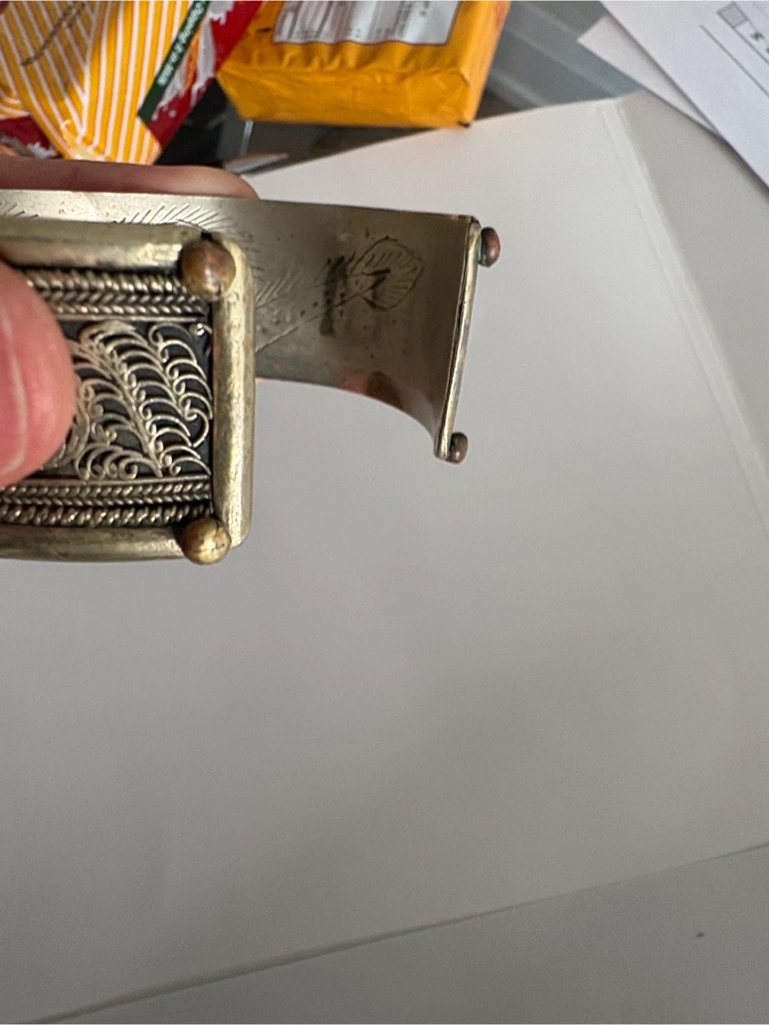 Selling a unique vintage antique cuff bracelet with intricate silver-tone detailing. It has a beautiful, ornate design and is in good condition. Perfect for adding a touch of vintage charm to any outfit!