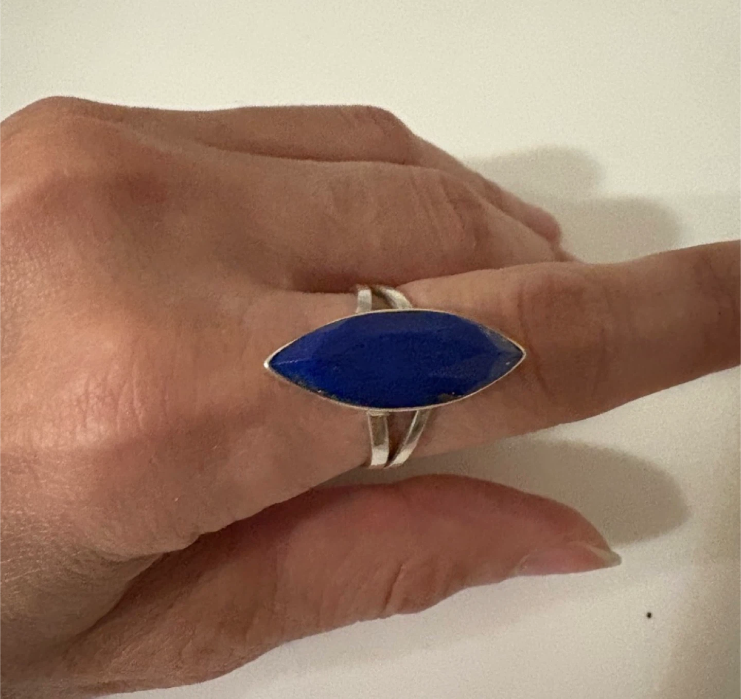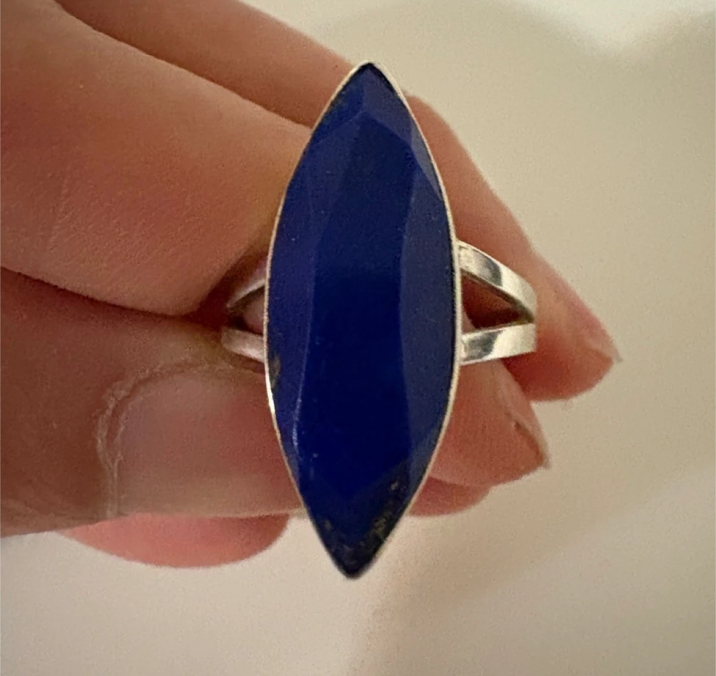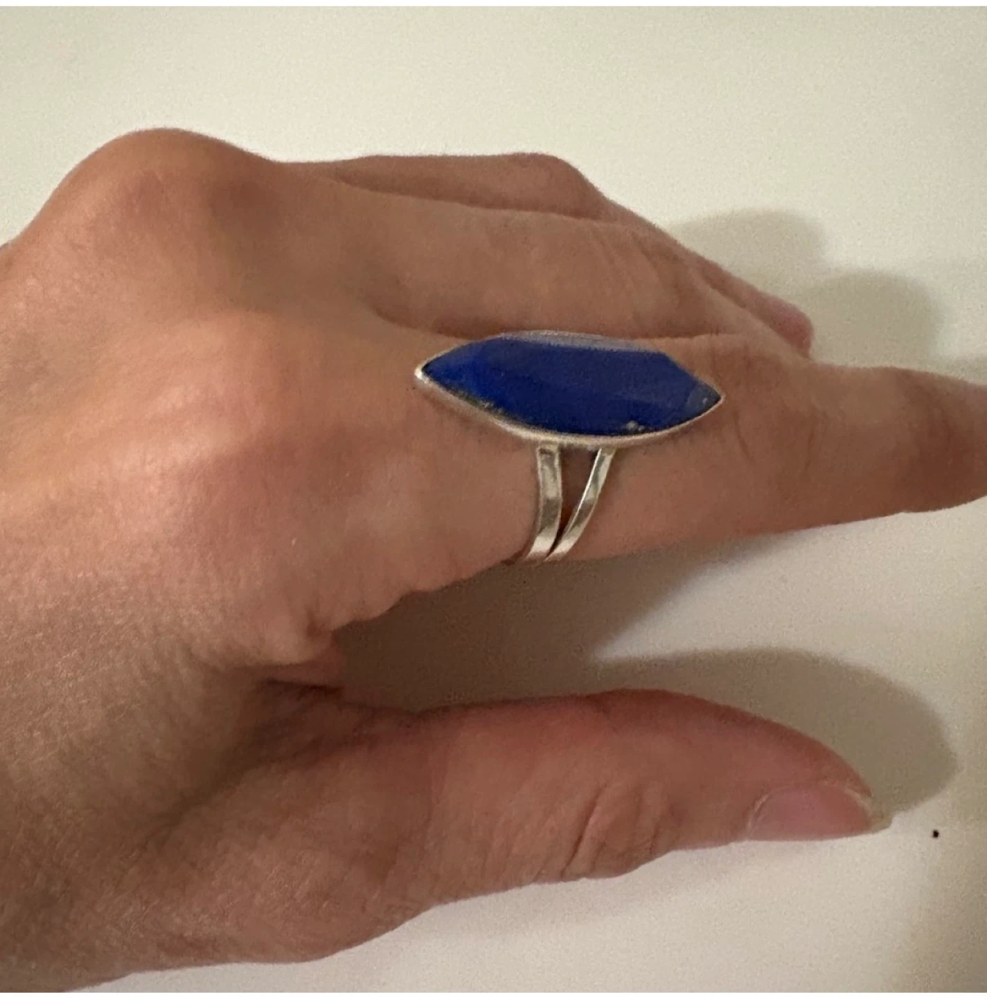 Here's a beautiful sterling silver ring featuring a lapis lazuli stone. The ring is marked with '925', indicating its sterling silver composition. It has a unique and elegant design that would make a lovely addition to any jewelry collection!