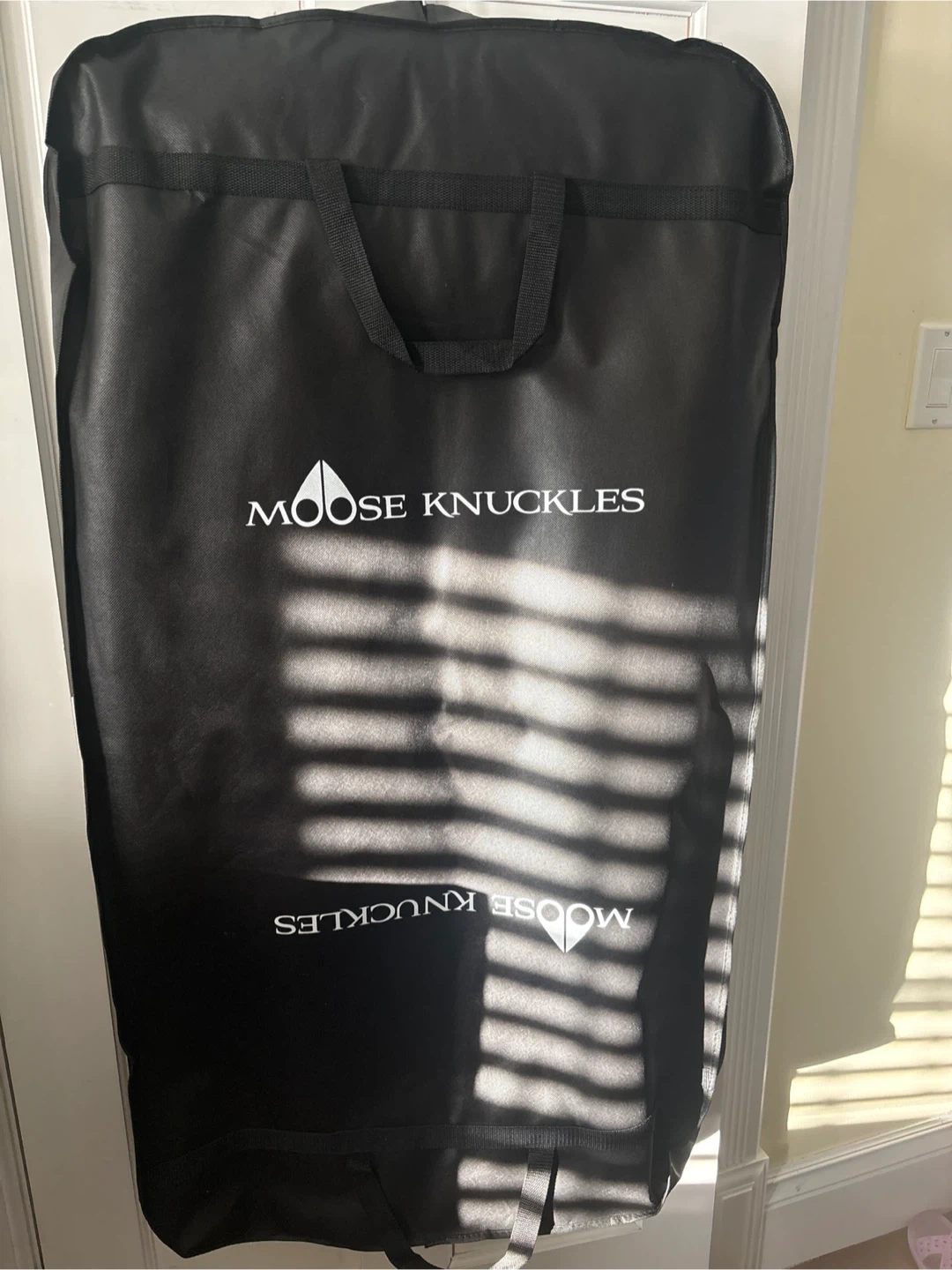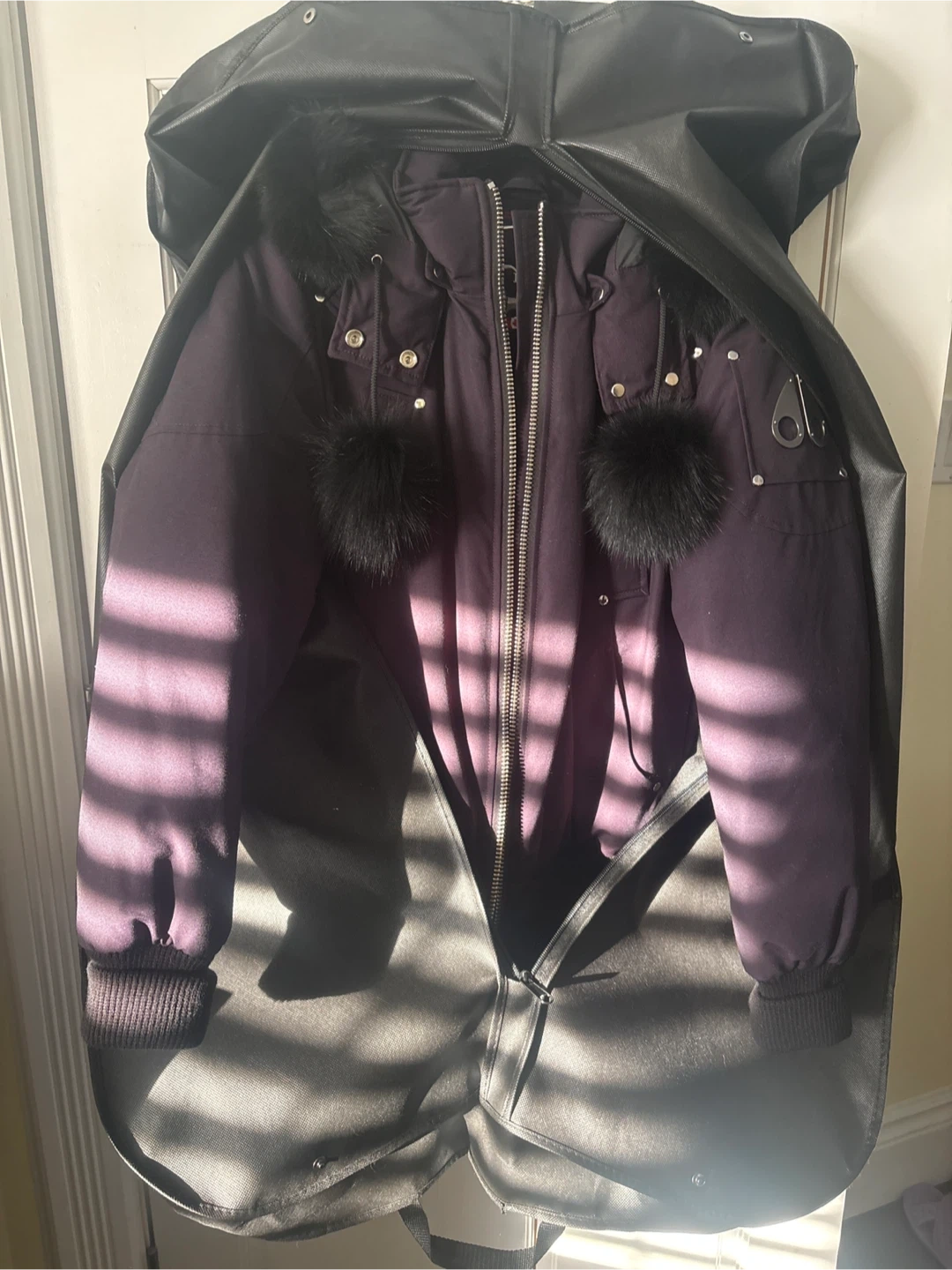 Selling a Moose Knuckles down-filled bomber jacket in size small. It comes with a bag for storage. The jacket features a stylish design with fur trim and detailed accents. Perfect for staying warm and fashionable during the colder months
