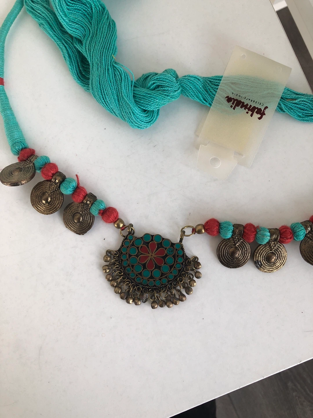 A beautiful Fabindia necklace featuring turquoise and red accents! It's a unique piece that will add a pop of colour to any outfit. Check out my other postings for combo deals and great discounts.
