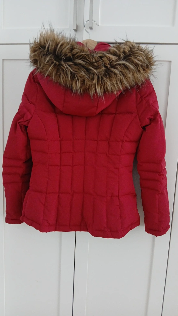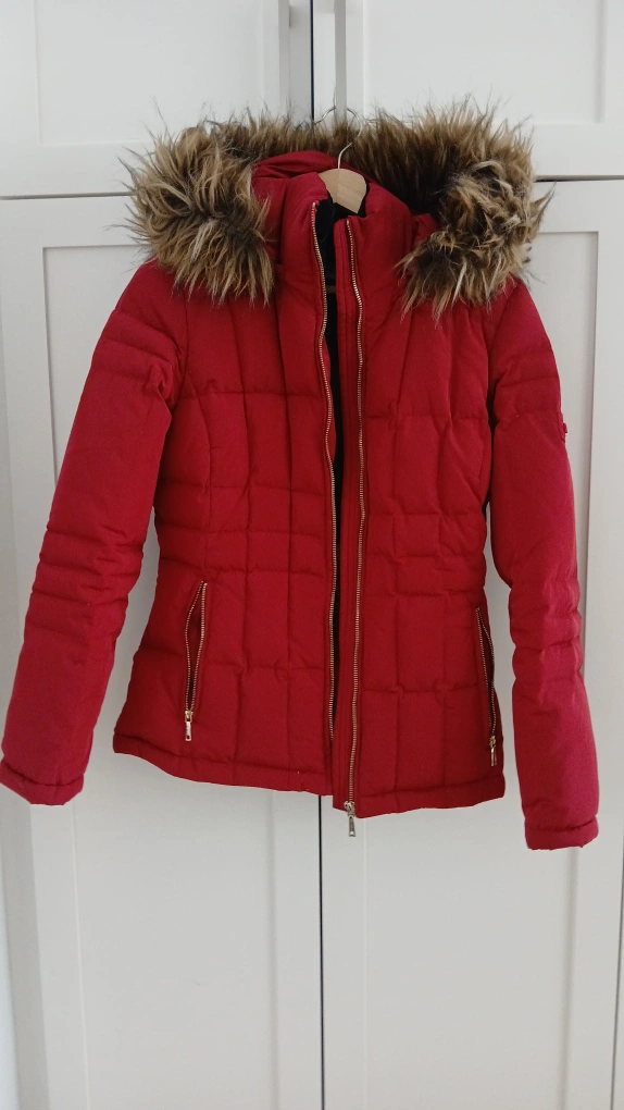 Selling a Calvin Klein red puffer jacket in size XS. It has a fur-trimmed hood and a cozy lining. Great for staying warm and stylish!
