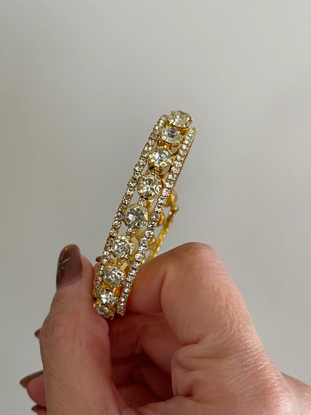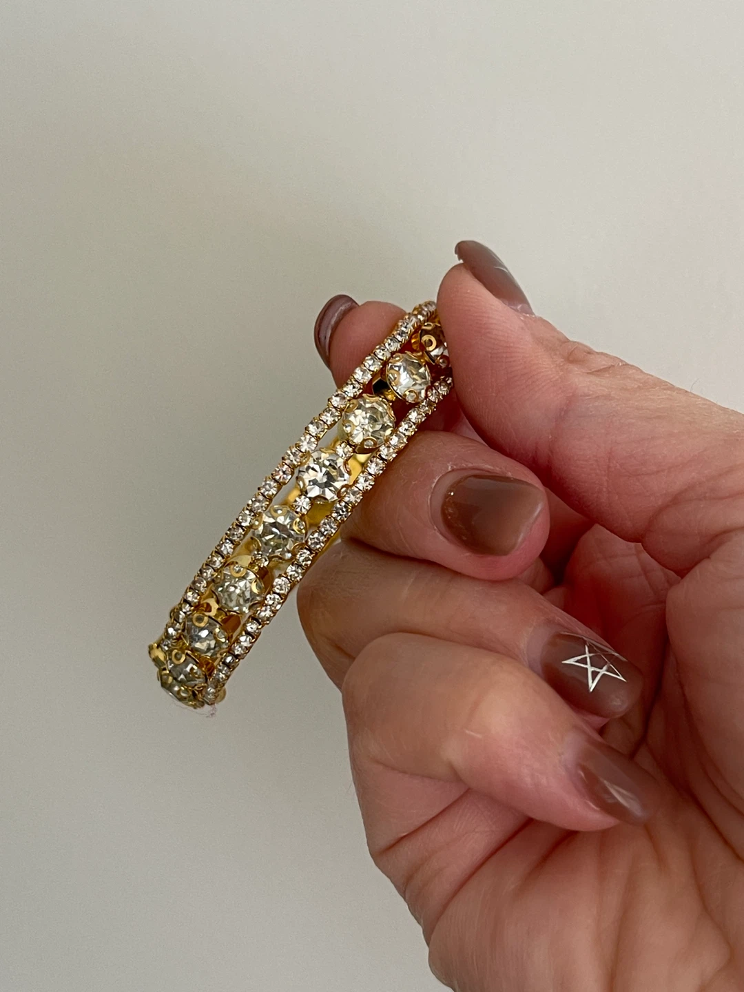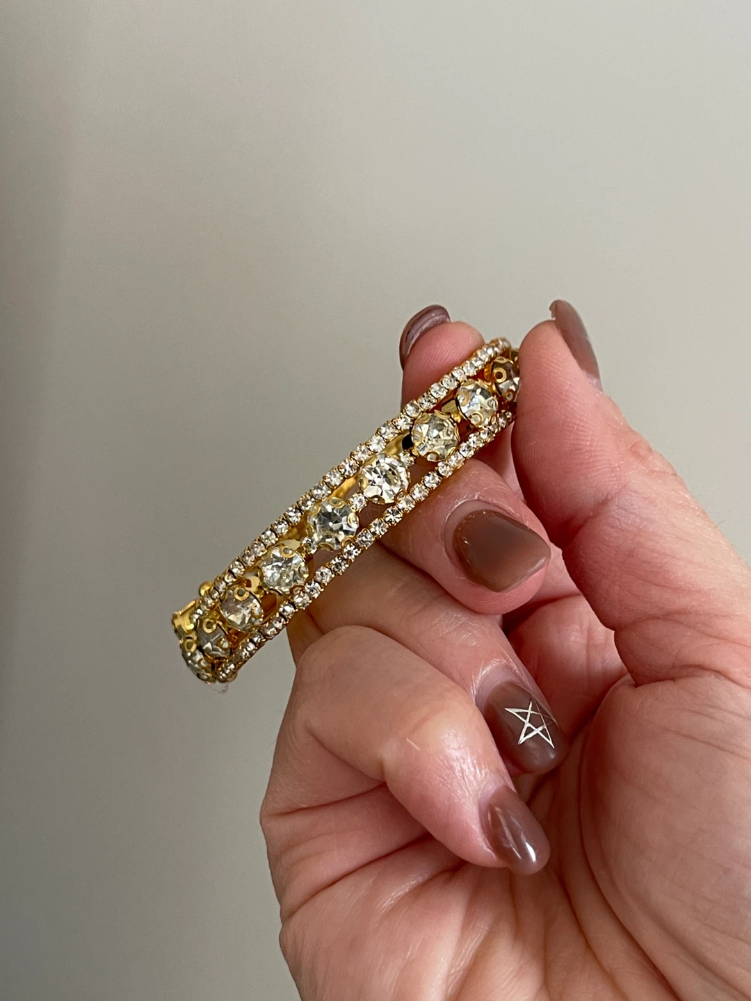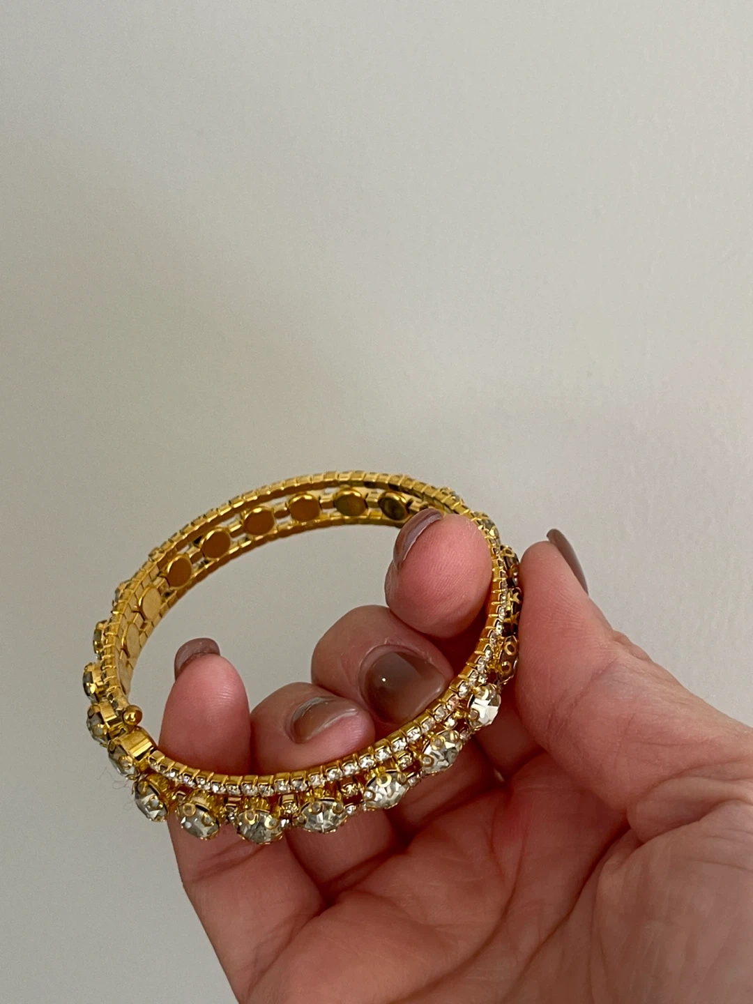 Selling a lovely gold-tone bangle adorned with sparkling rhinestones! It's in great condition and ready to add a touch of elegance to your outfit