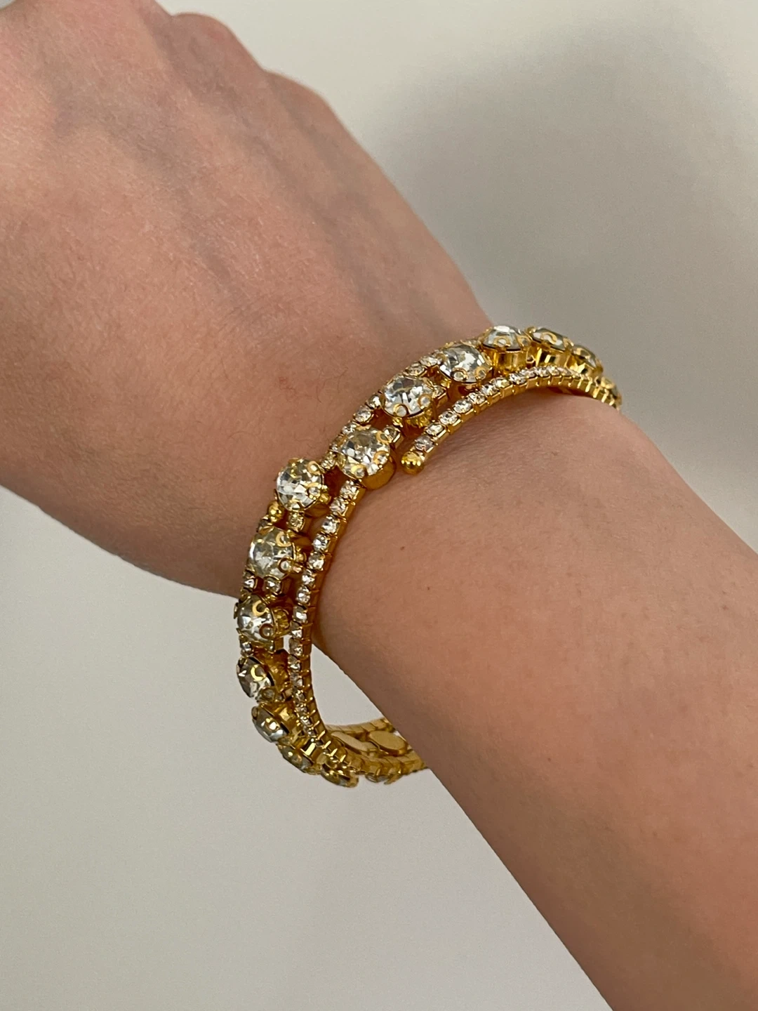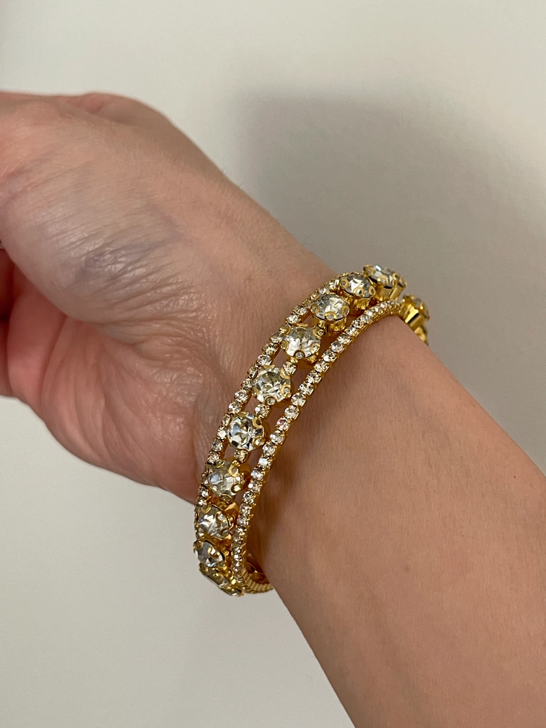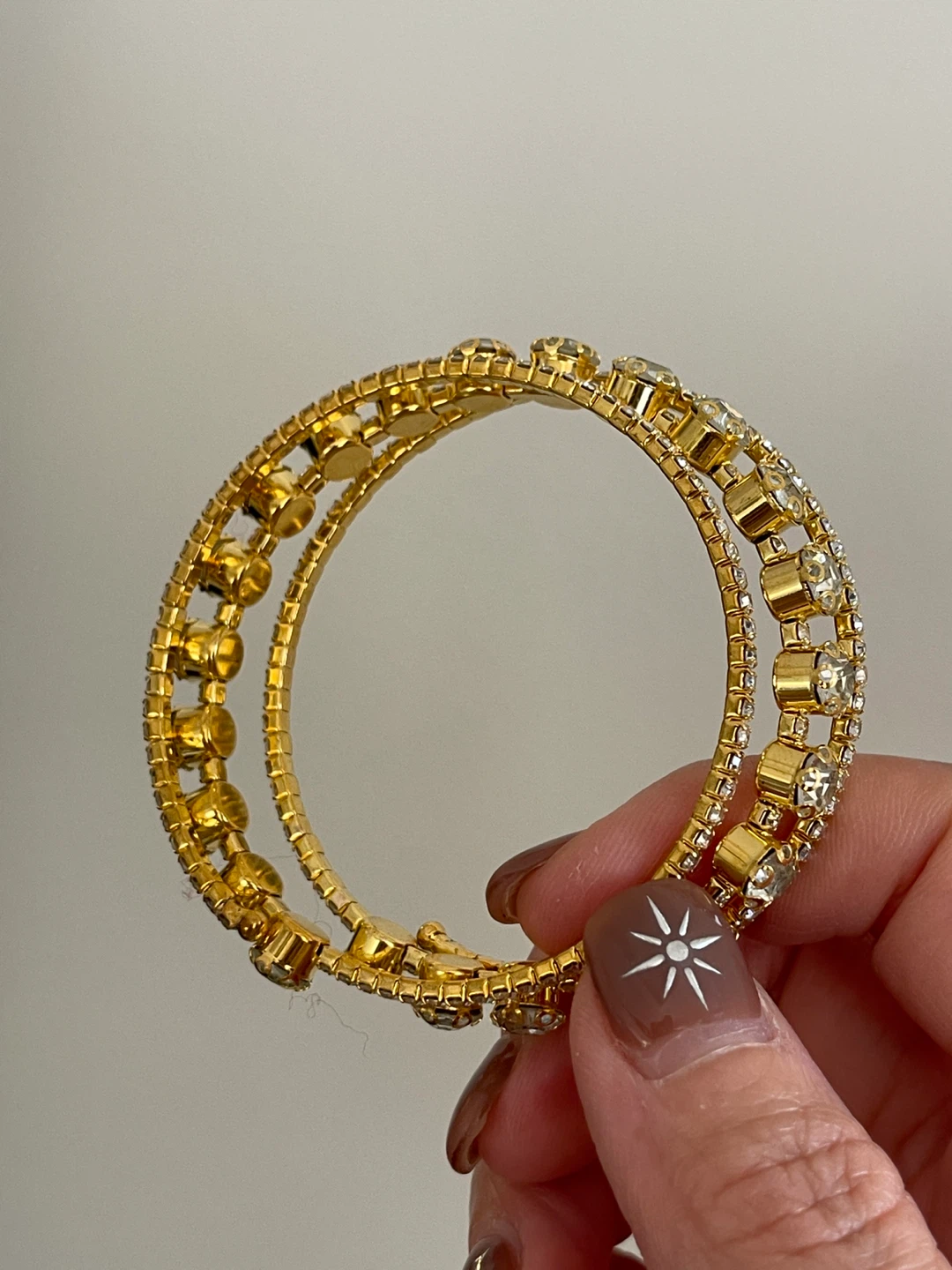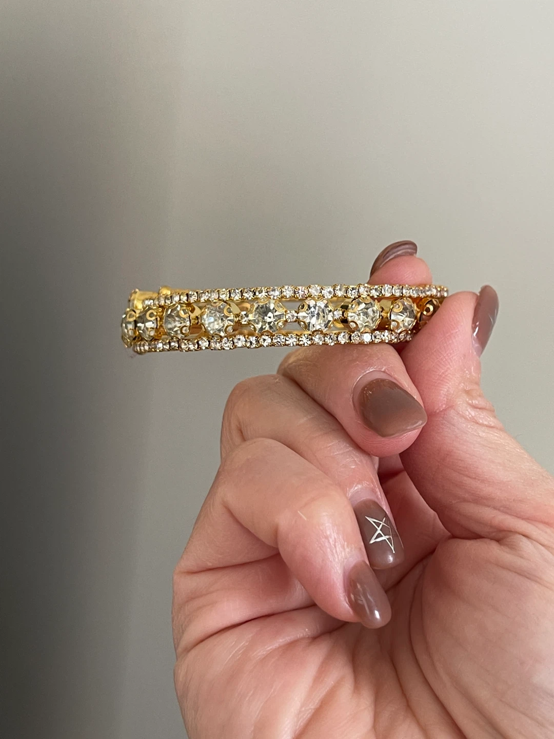 Selling a lovely gold-tone bangle adorned with sparkling rhinestones! It's in great condition and ready to add a touch of elegance to your outfit
