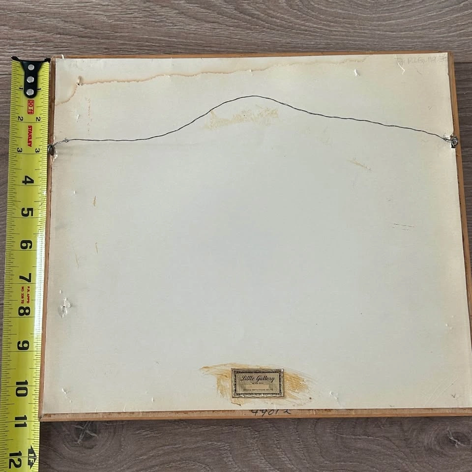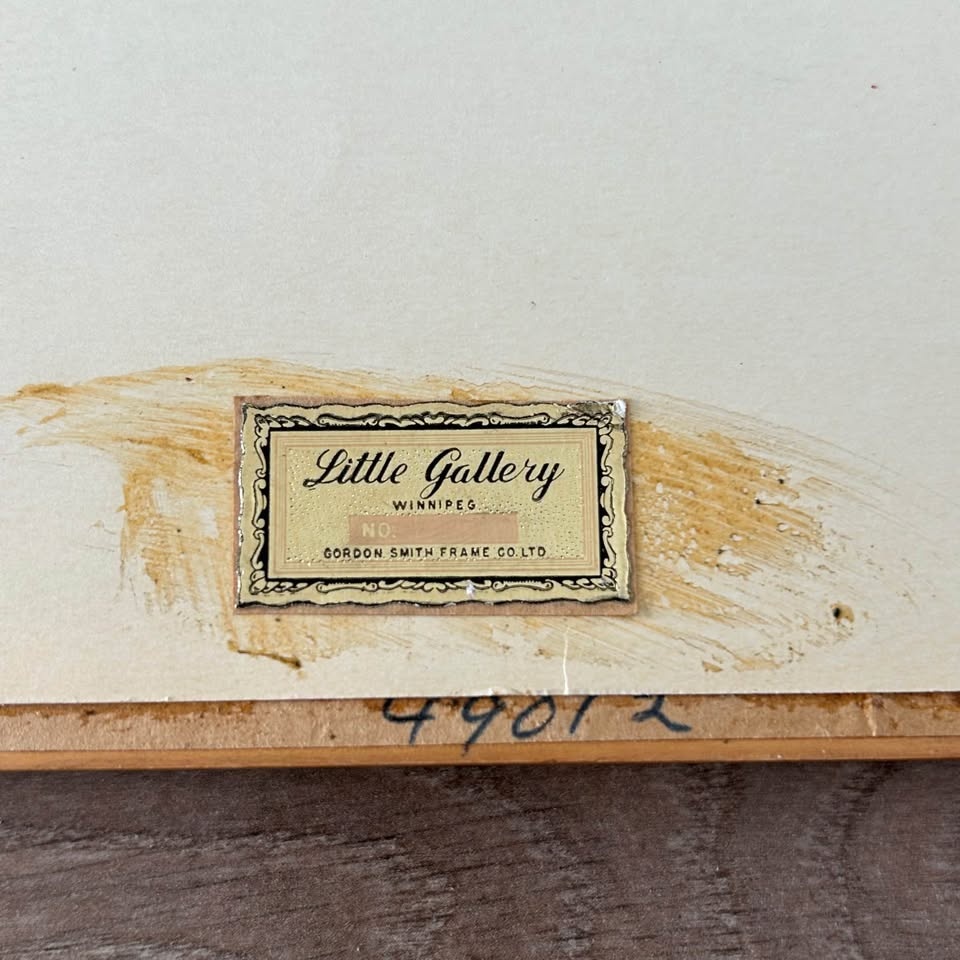 Framed in a vintage mid-century style frame, with a Little Gallery (Winnipeg) label on the back, adding provenance and collectible appeal.