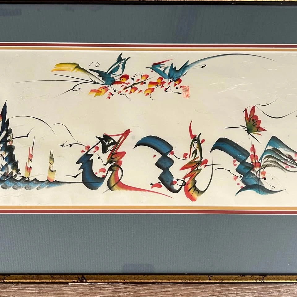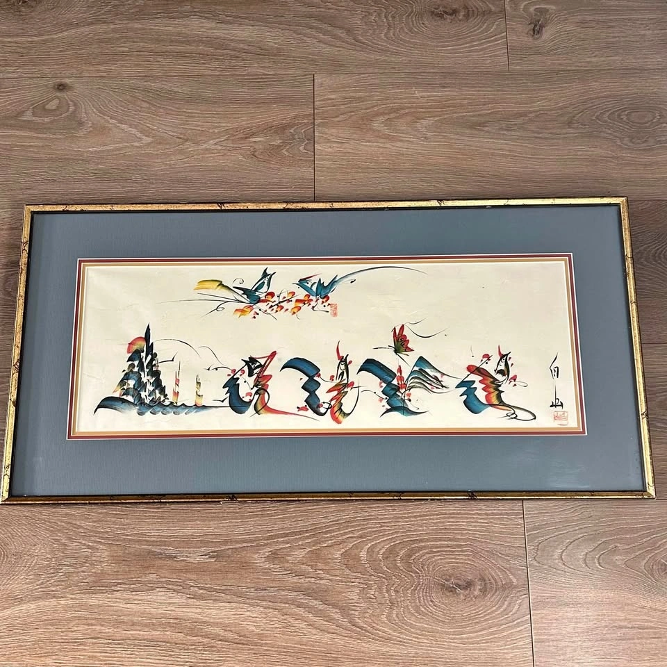 Original Asian Brush Painting – Framed Art, Birds & Calligraphy