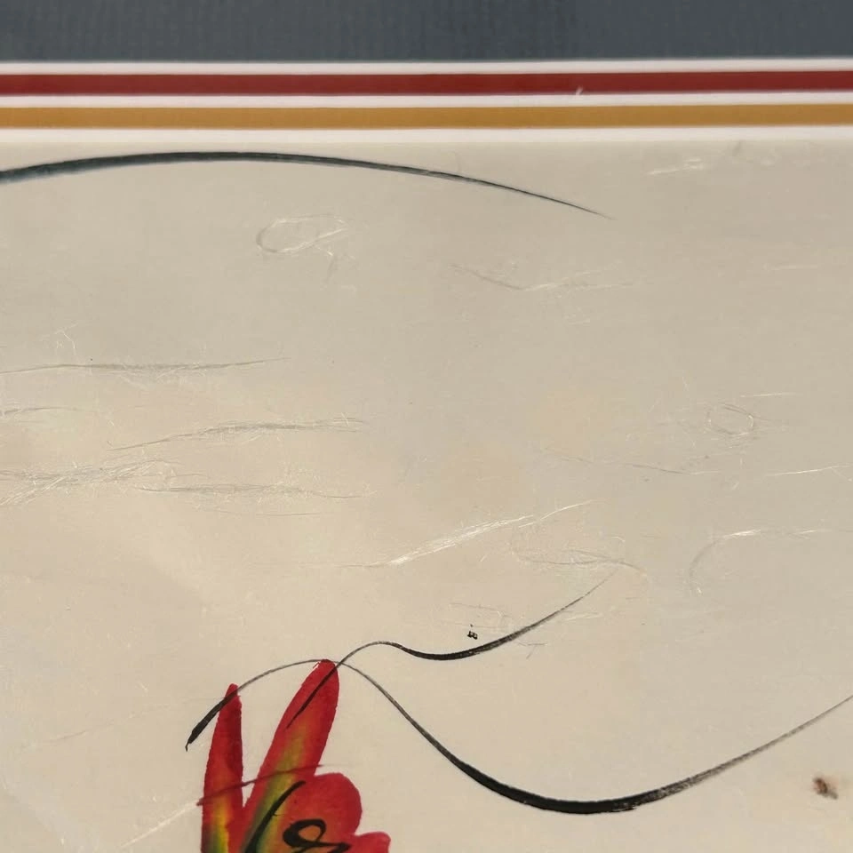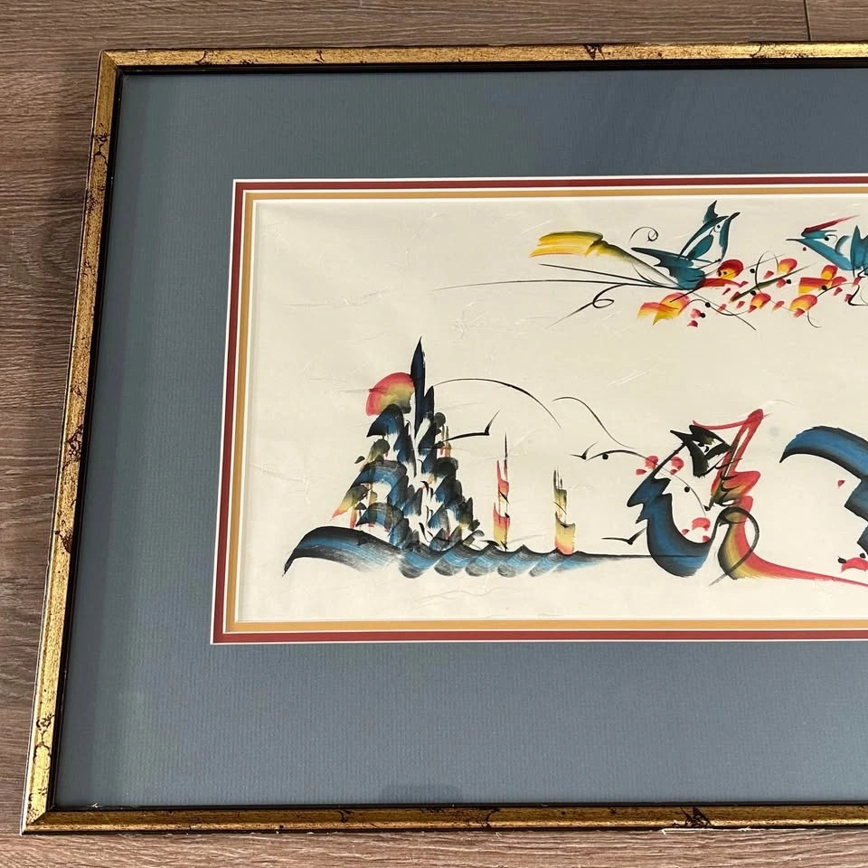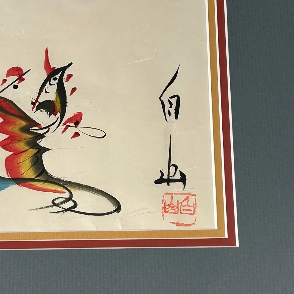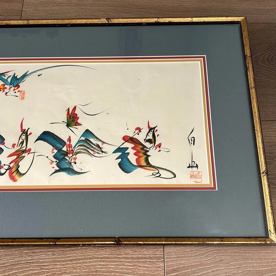 Professionally framed in a vintage gold-tone frame with layered matting, giving it a refined presentation and making it ready to display. A striking decorative piece perfect for collectors of Asian art or anyone looking to add a touch of elegance and color to their home.