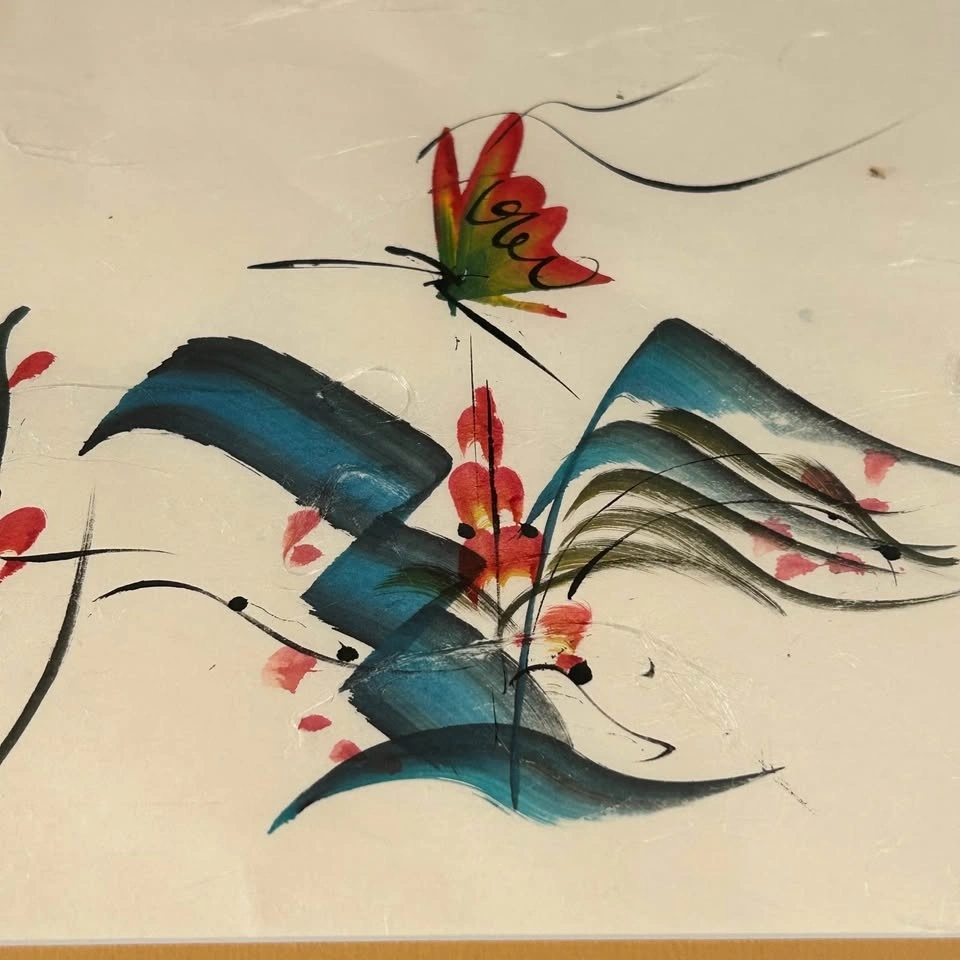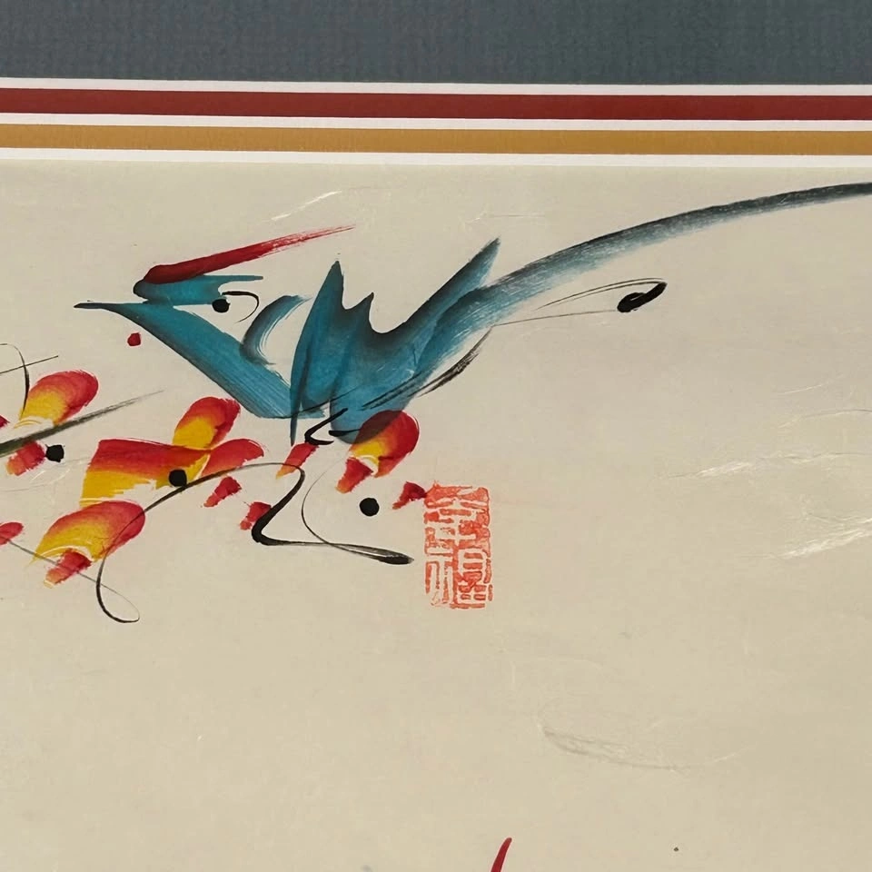 Beautiful original Asian brush painting featuring expressive birds, flowing abstract forms, and traditional calligraphy. The artwork is created with ink and watercolor on textured paper and includes artist seals, adding authenticity and charm.