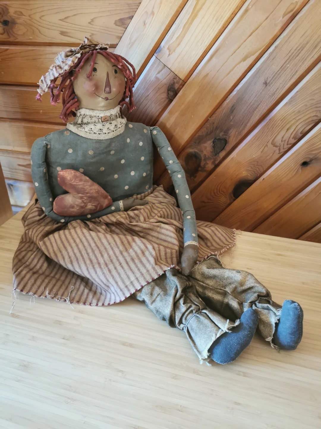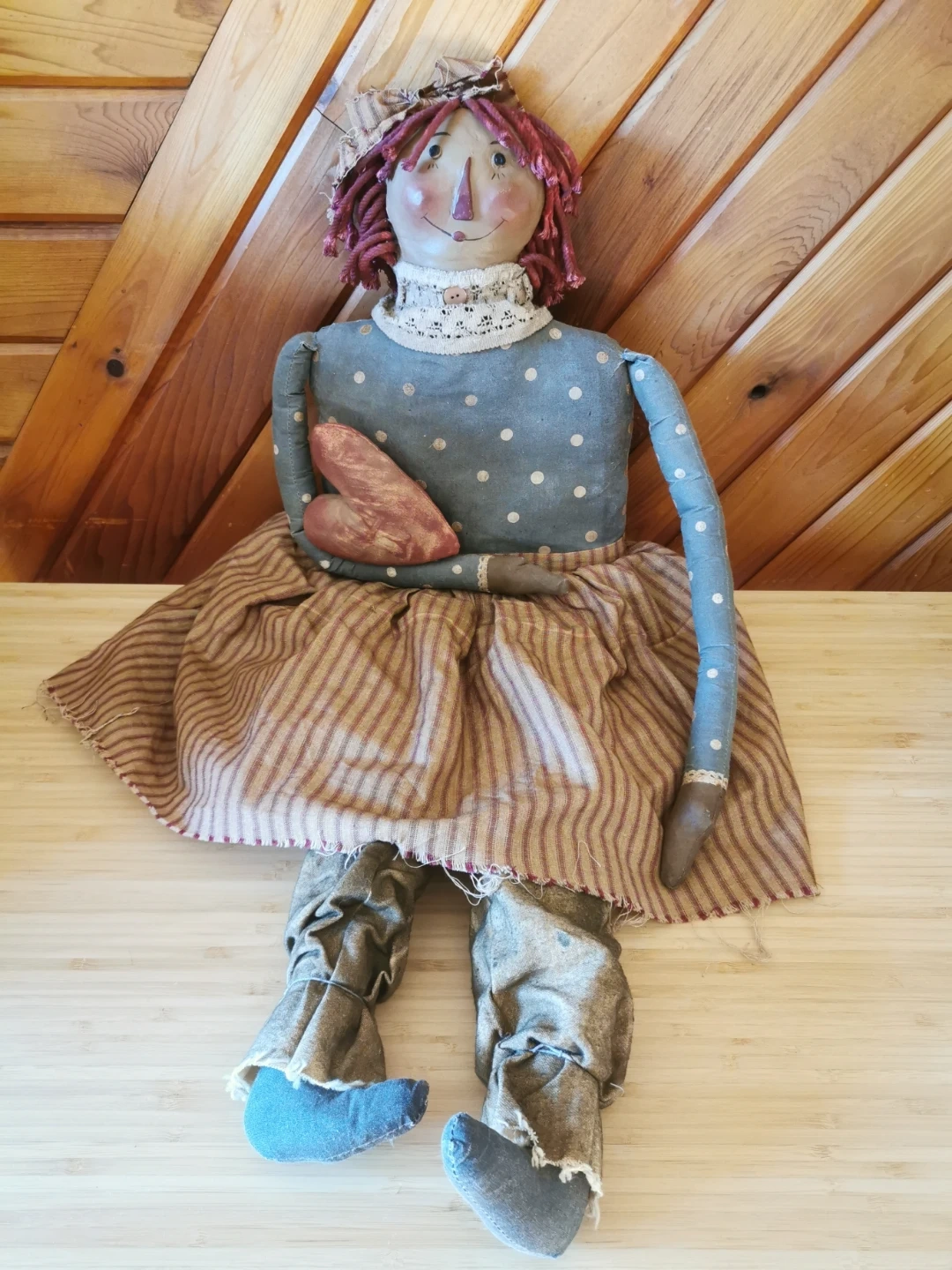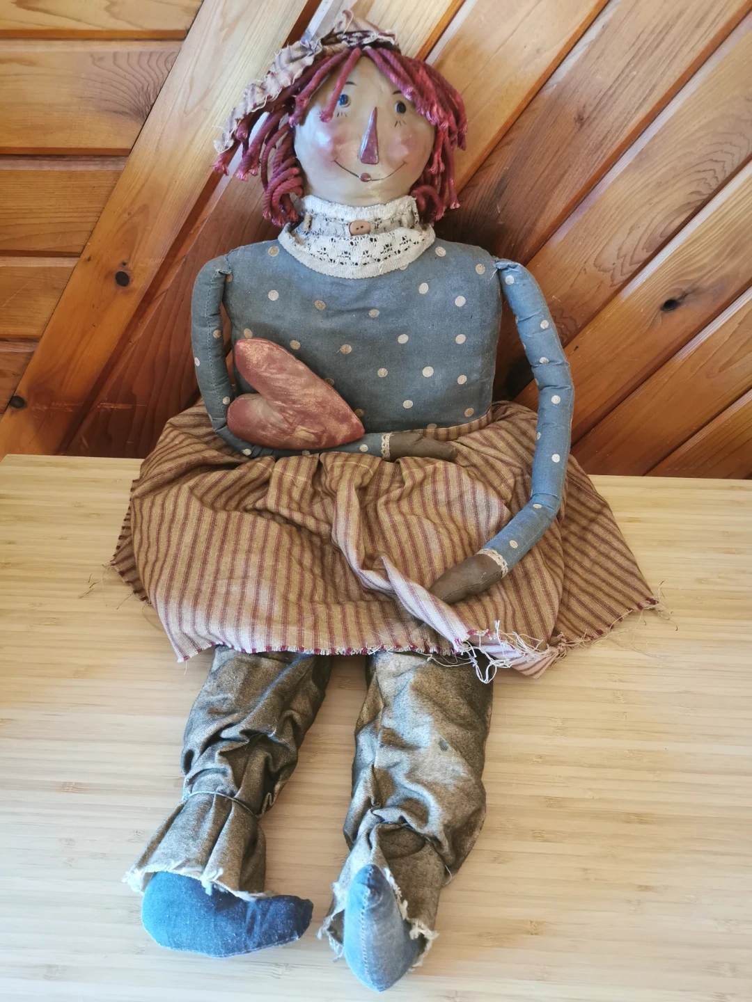 Gorgeous Vintage Handmade Raggedy Doll. Her beautiful hand-painted kind face and timid smile, blushing cheeks, carefully designed clothes and hair bow, dangling feet, long beautiful arms holding a big heart will make you fall in love with her beauty and charm. She is very unique, quite tall, about 22 inch and 10 inch wide. Beautiful Art Piece that will add charm to your rustic/country decor. Rare find.