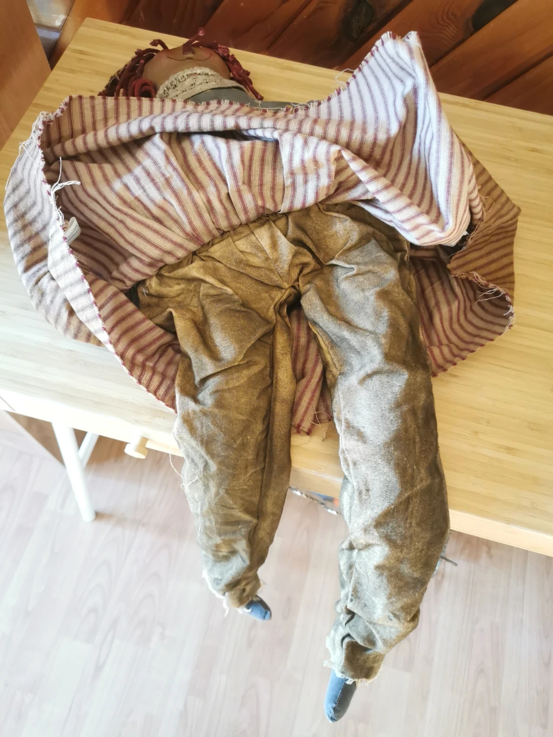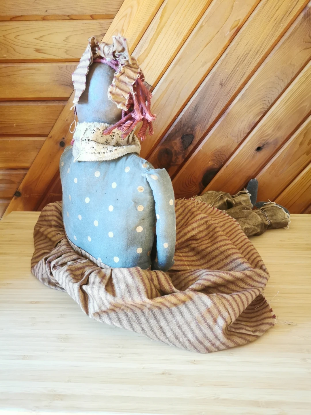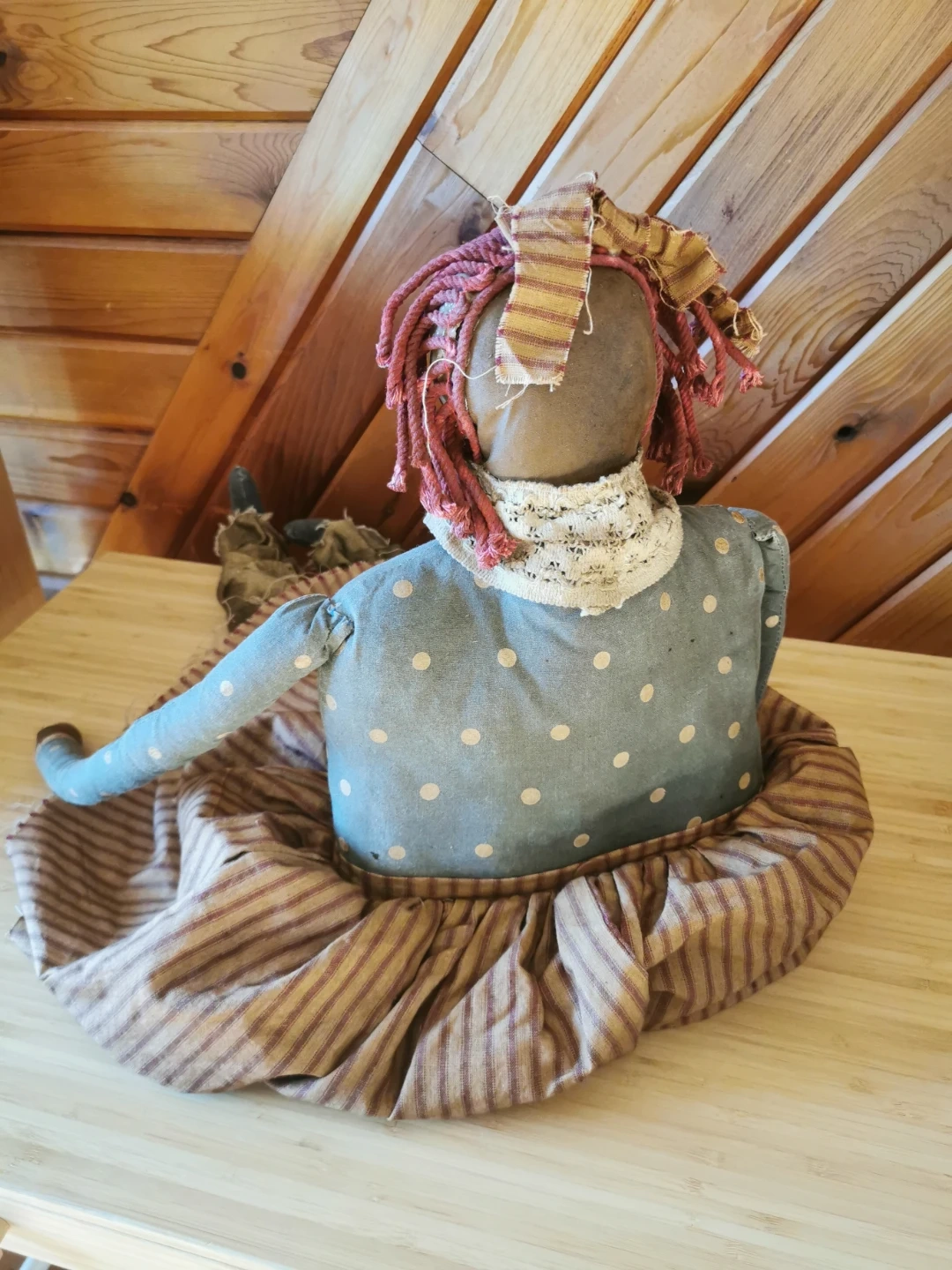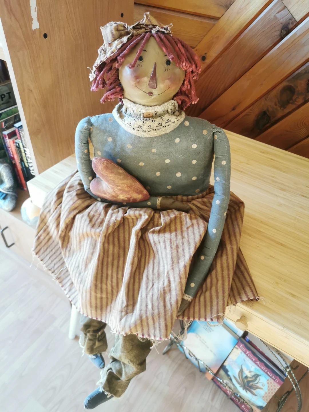Gorgeous Vintage Handmade Raggedy Doll. Her beautiful hand-painted kind face and timid smile, blushing cheeks, carefully designed clothes and hair bow, dangling feet, long beautiful arms holding a big heart will make you fall in love with her beauty and charm. She is very unique, quite tall, about 22 inch and 10 inch wide. Beautiful Art Piece that will add charm to your rustic/country decor. Rare find.