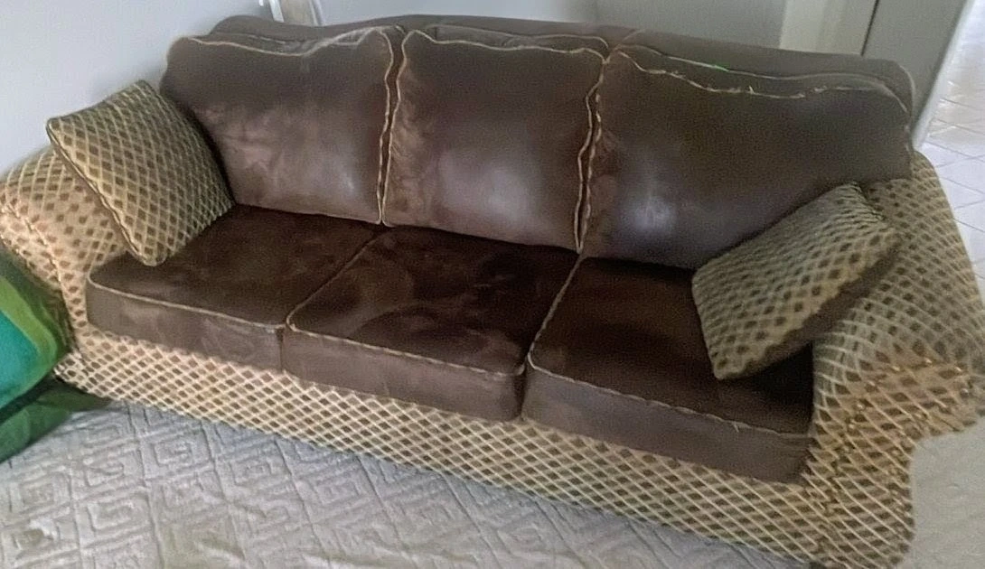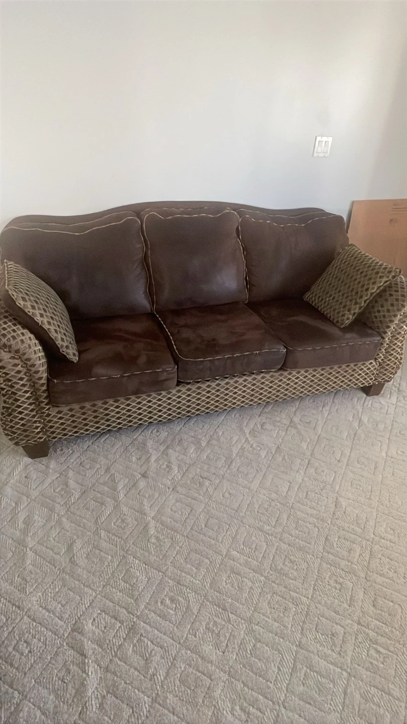 Selling a comfy brown 3-seater sofa. It's perfect for a living room or den. The sofa features patterned sides and comes with matching throw pillows. It has a classic design that would fit well in many homes