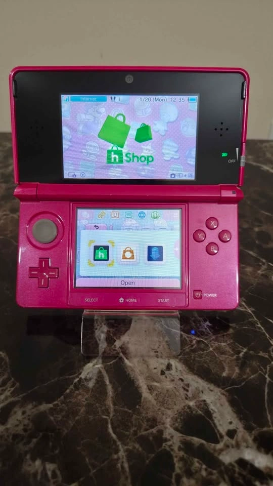 Fair condition 3DS console modded with hShop app (can download and install any game directly on the console for free), charger, metal stylus, 32gb high speed SD card with top game series & apps pre-installed.