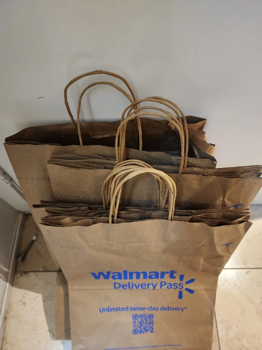 Aboit 50 brown paper grocery bags from Walmart. Some have sticky tops to seal the bag closed.