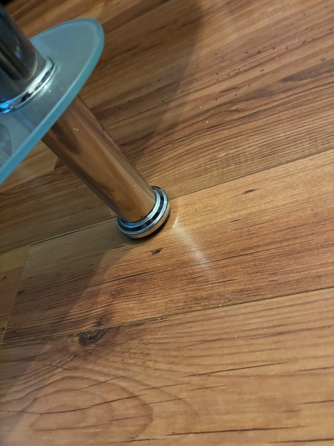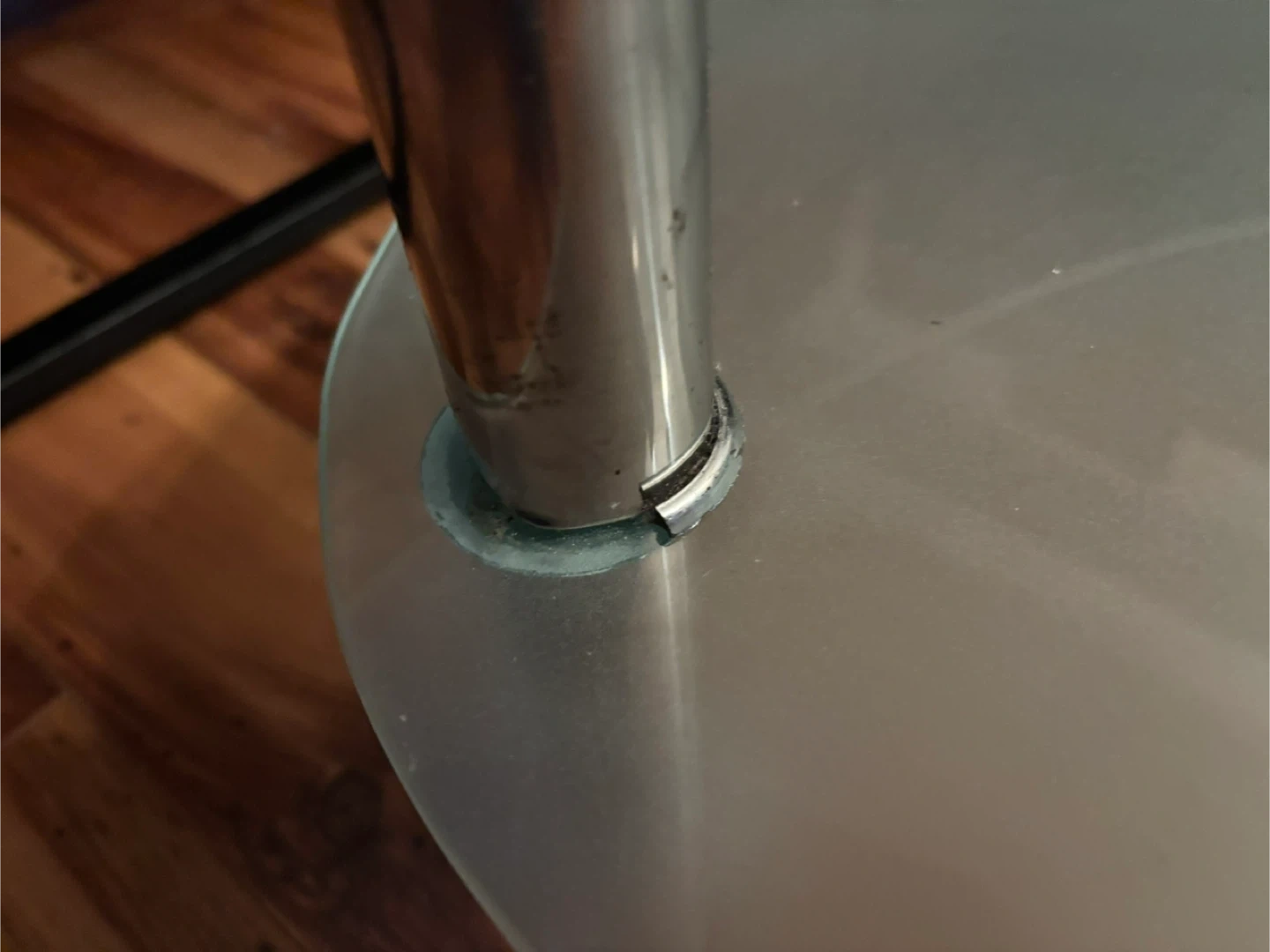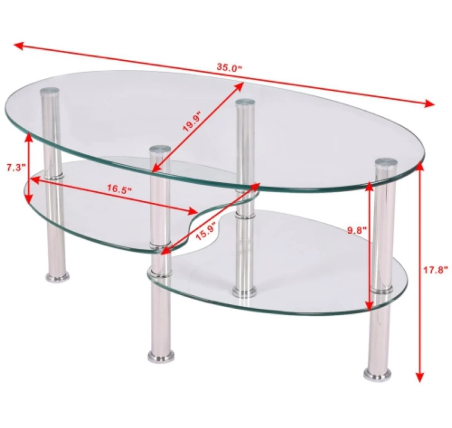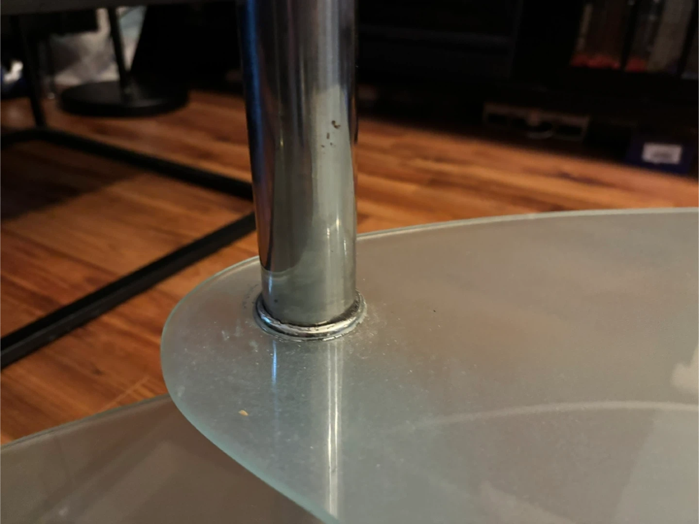 Selling this three-tier oval coffee table made of tempered clear and frosted glass with chrome-plated stainless steel legs. It’s in good condition with minor wear and tear.