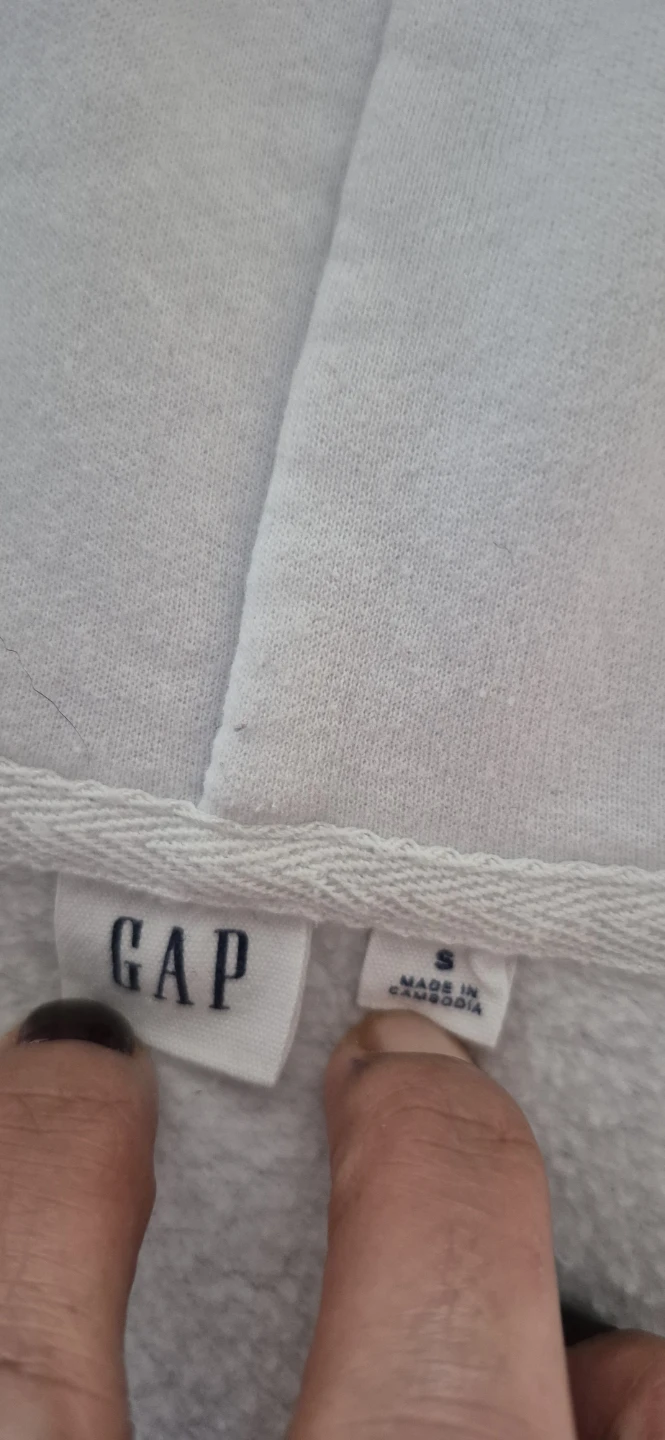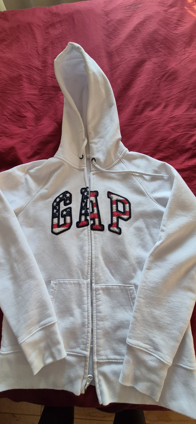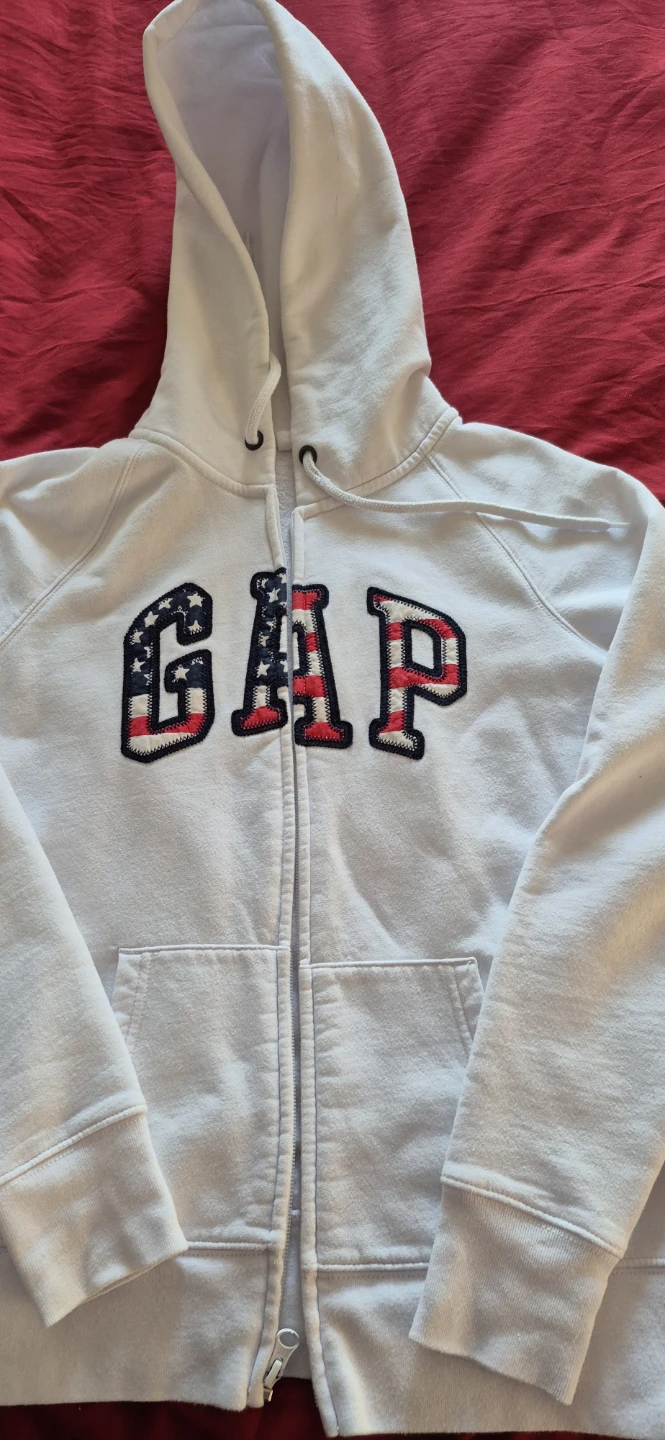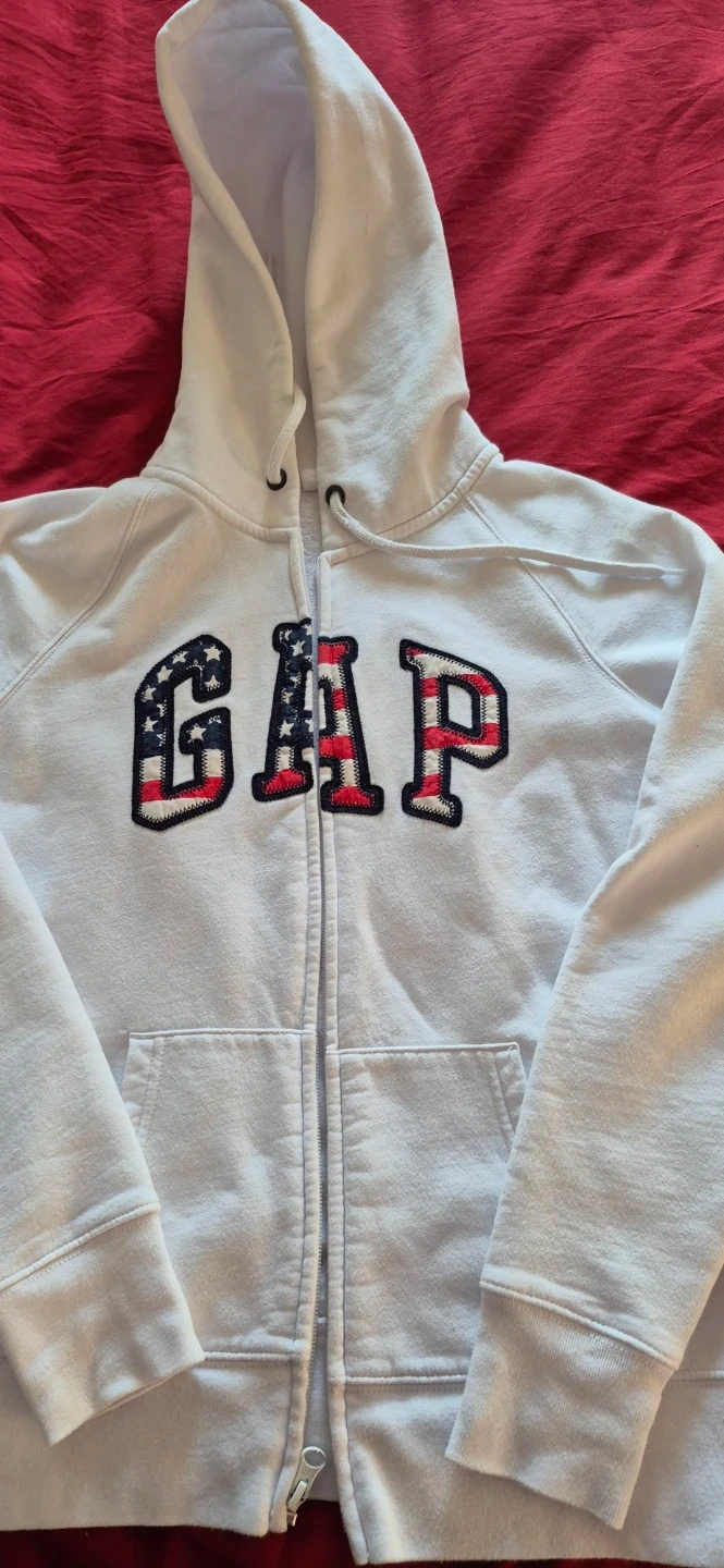 Selling a cute GAP zip-up hoodie in white! It's a size small and features the GAP logo with an American flag design. Perfect for layering or wearing on its own!