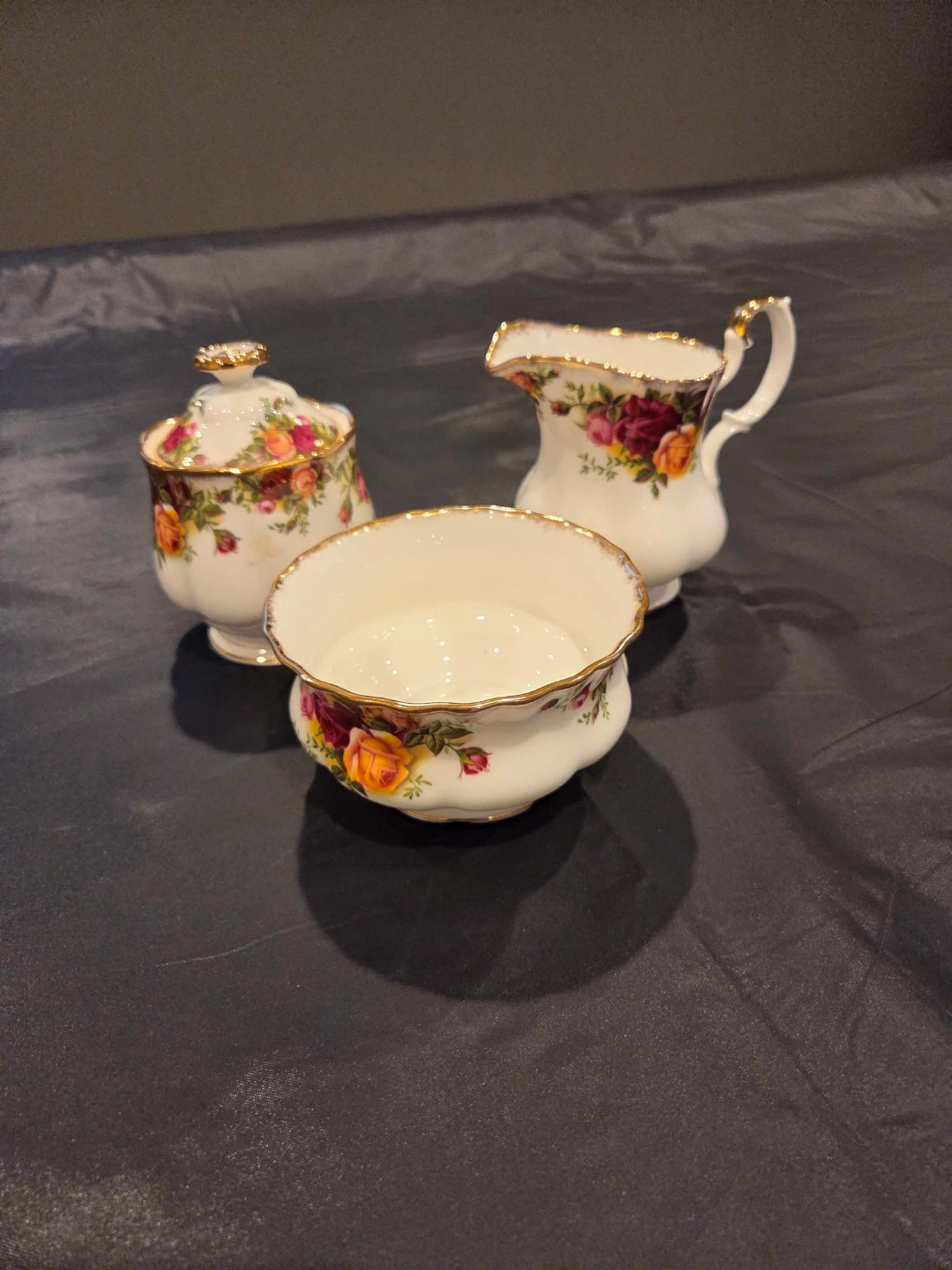 Selling a Royal Albert Old Country Roses cream and sugar set. It includes a sugar bowl with lid, a creamer, and an open sugar bowl. The set features the classic Old Country Roses pattern with roses and gold trim. Perfect for adding a touch of elegance to your tea time