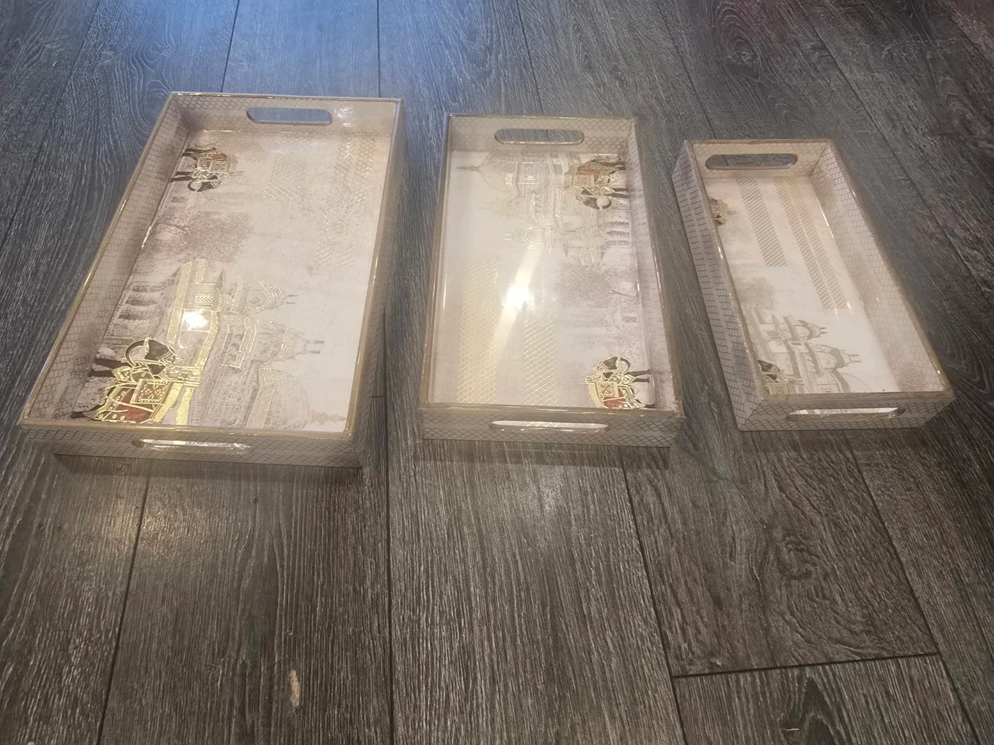 Here's a set of three decorative serving trays! They feature a unique design with elephants and buildings in gold. Perfect for adding a touch of elegance to your home or for serving guests