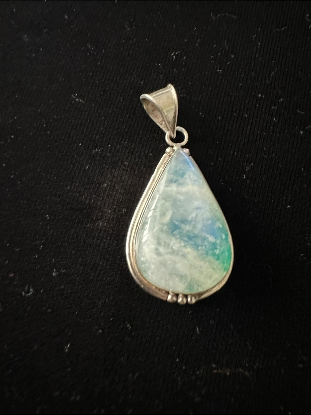 Selling a beautiful teardrop-shaped moonstone pendant! The stone has lovely blue and green hues. It's set on sterling silver. A lovely piece to add to your collection