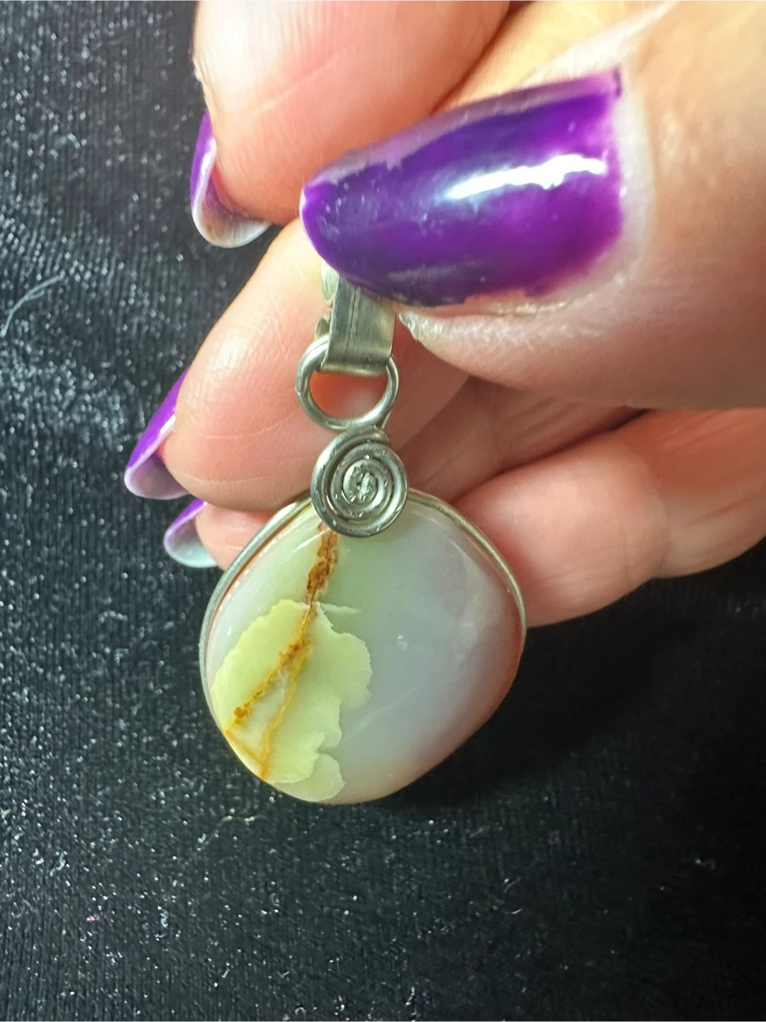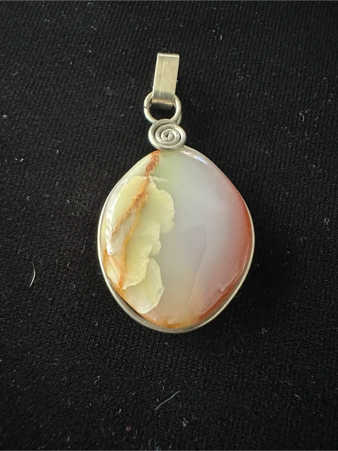 Selling a vintage pendant featuring a unique agate stone with a sterling silver bail. The stone has a lovely mix of colours. A beautiful addition to any jewellery collection!