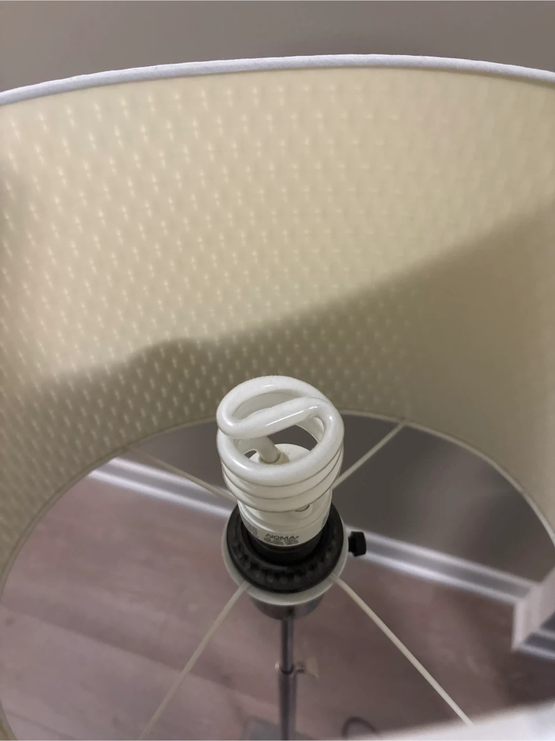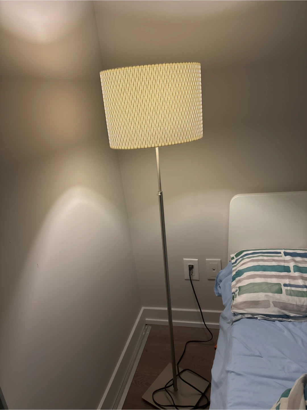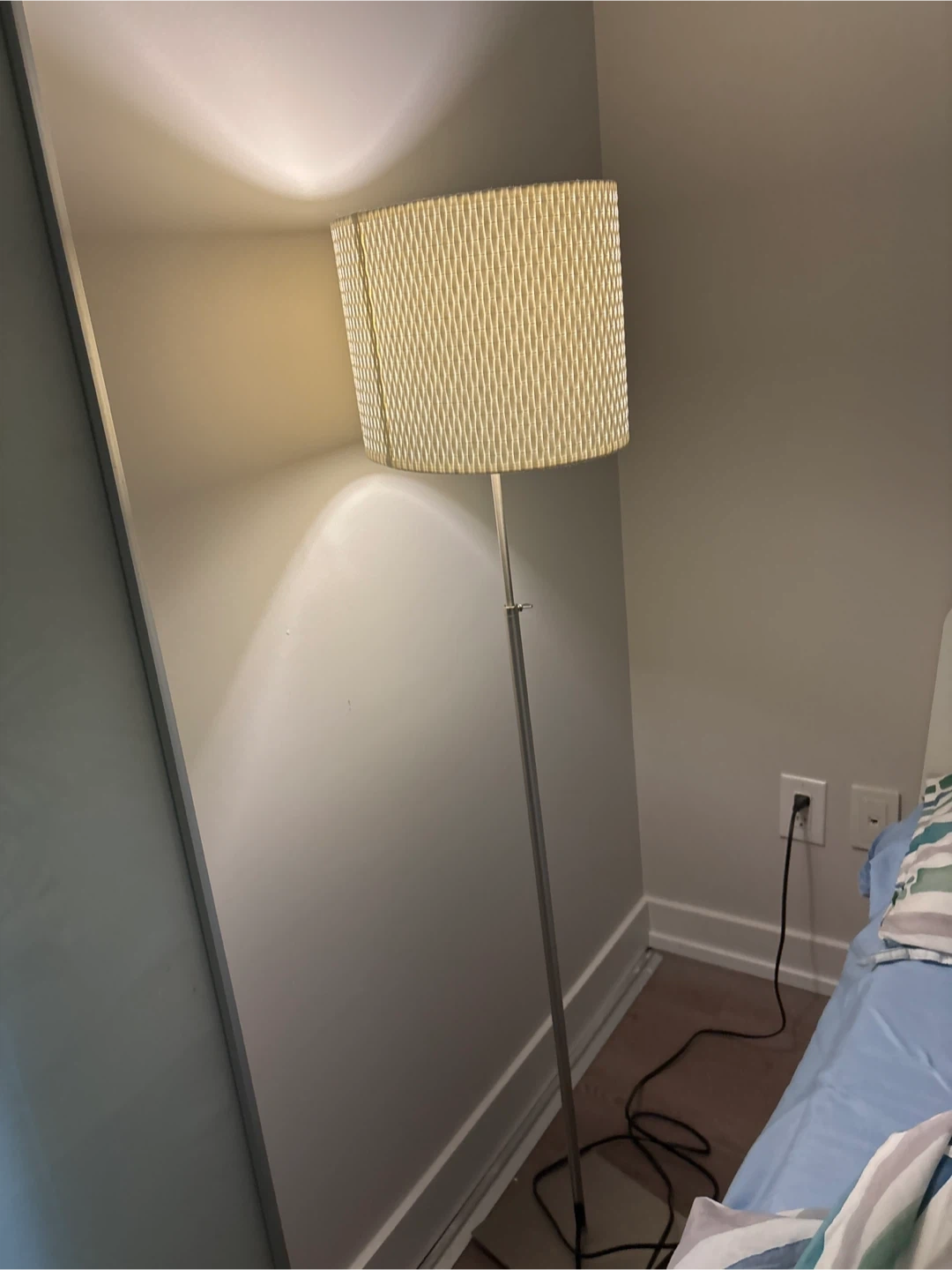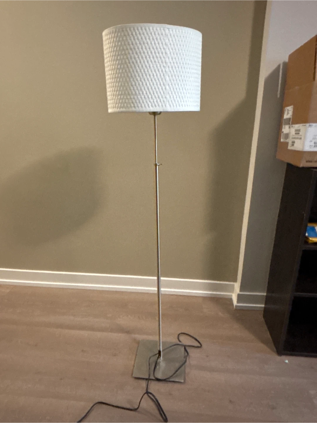 Selling a floor lamp with a white woven shade! It's in great condition and would look lovely in any room.