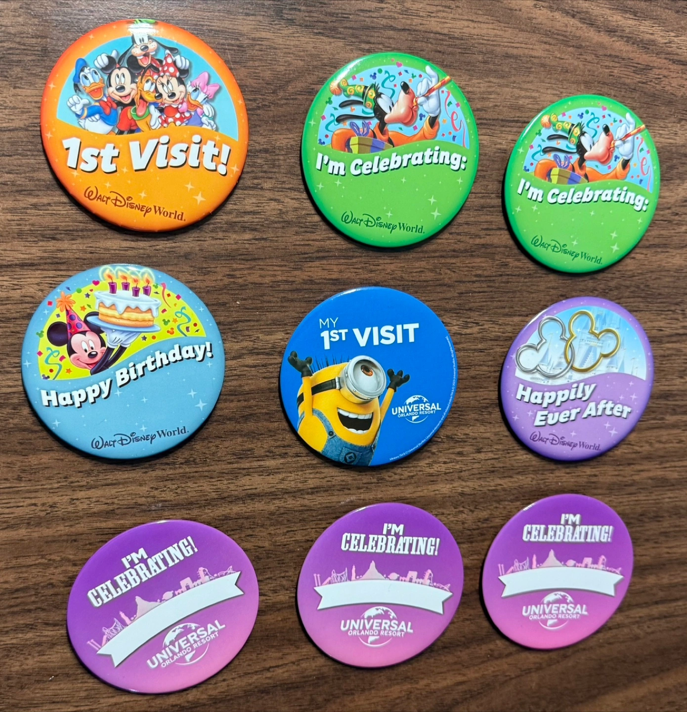 Selling a set of fun celebration buttons from Disney World and Universal Studios! There's a variety of designs, including '1st Visit', 'Happy Birthday', and 'Happily Ever After', 'I'm Celebrating' buttons. Great for adding some flair to your next trip or as a cute souvenir