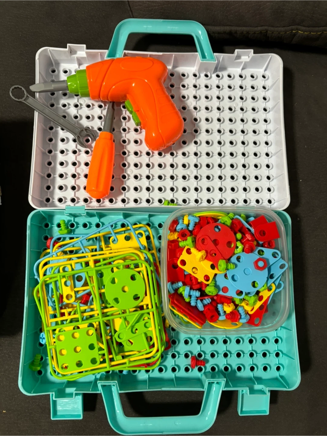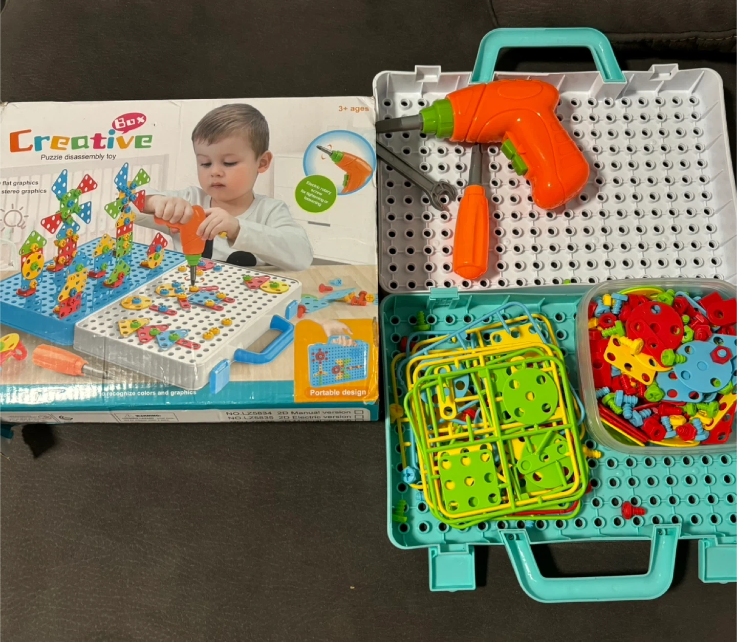 Creative Box puzzle disassembly toy for children 3+ years of age. This set comes with a portable design case and includes 2D flat graphics and 3D stereo graphics pieces. It also features an electric rotary screw for tightening or loosening the pieces. Multi-functional building blocks help children recognize colours and graphics