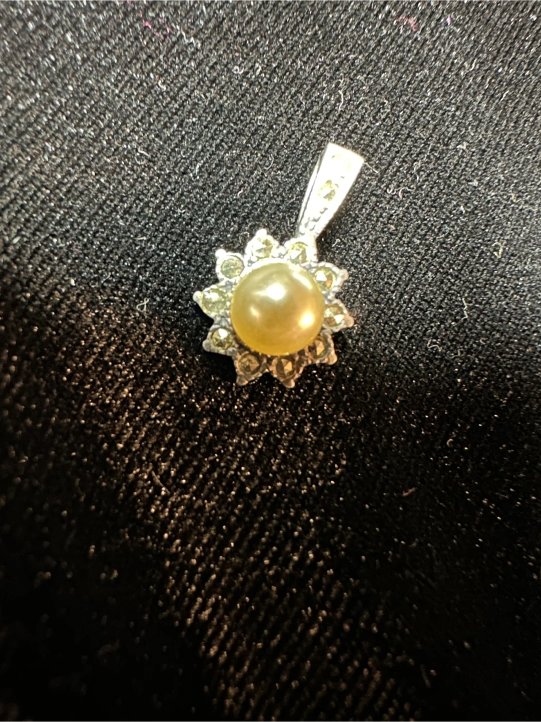 Beautiful pearl and marcasite pendant in excellent condition! This pendant features a luminous pearl centre surrounded by sparkling marcasite stones. Perfect for adding a touch of vintage charm to any outfit