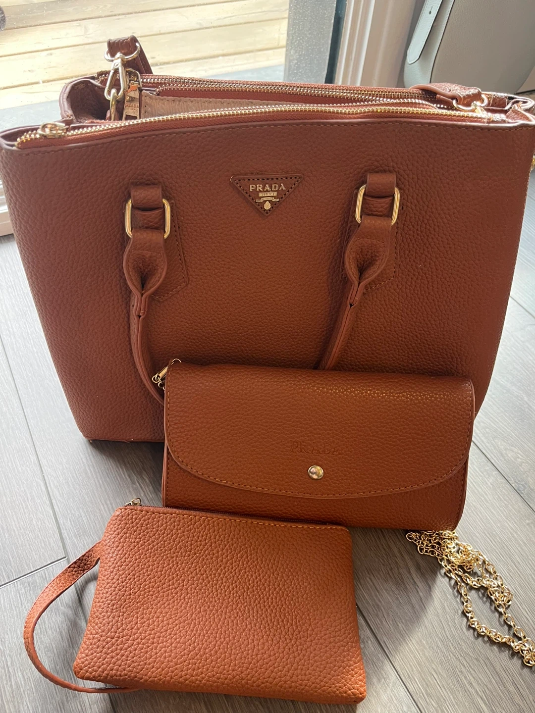 Selling a Prada handbag set in a beautiful brown leather. Includes a larger handbag, a wallet, and a small coin purse. Great for everyday use or special occasions!