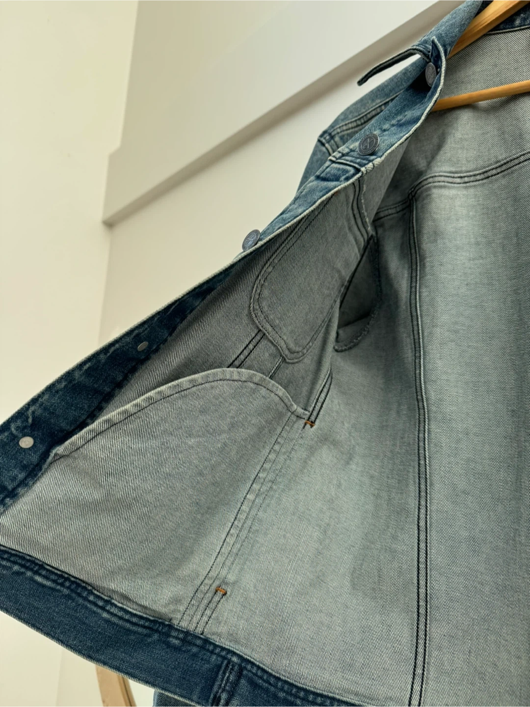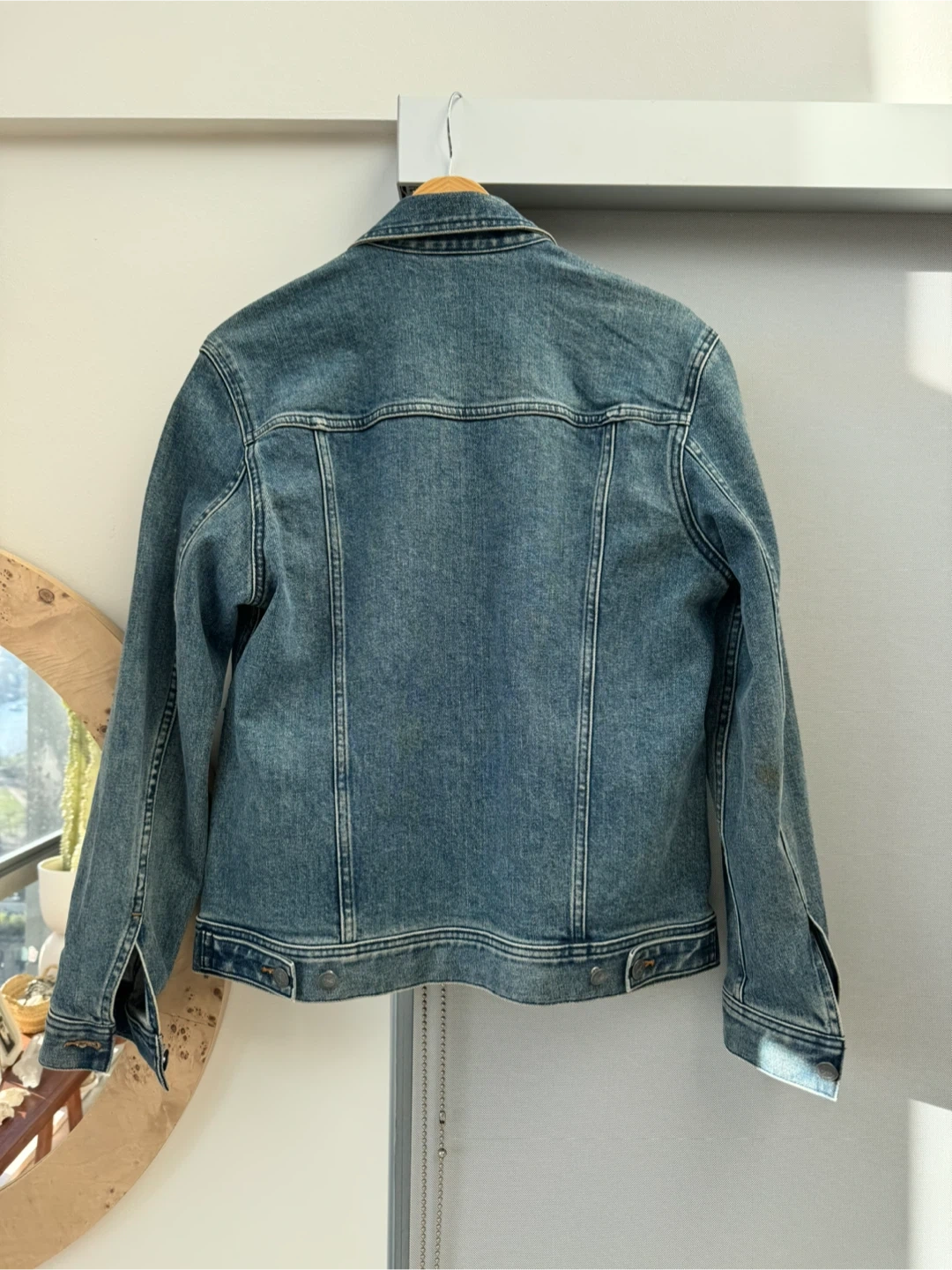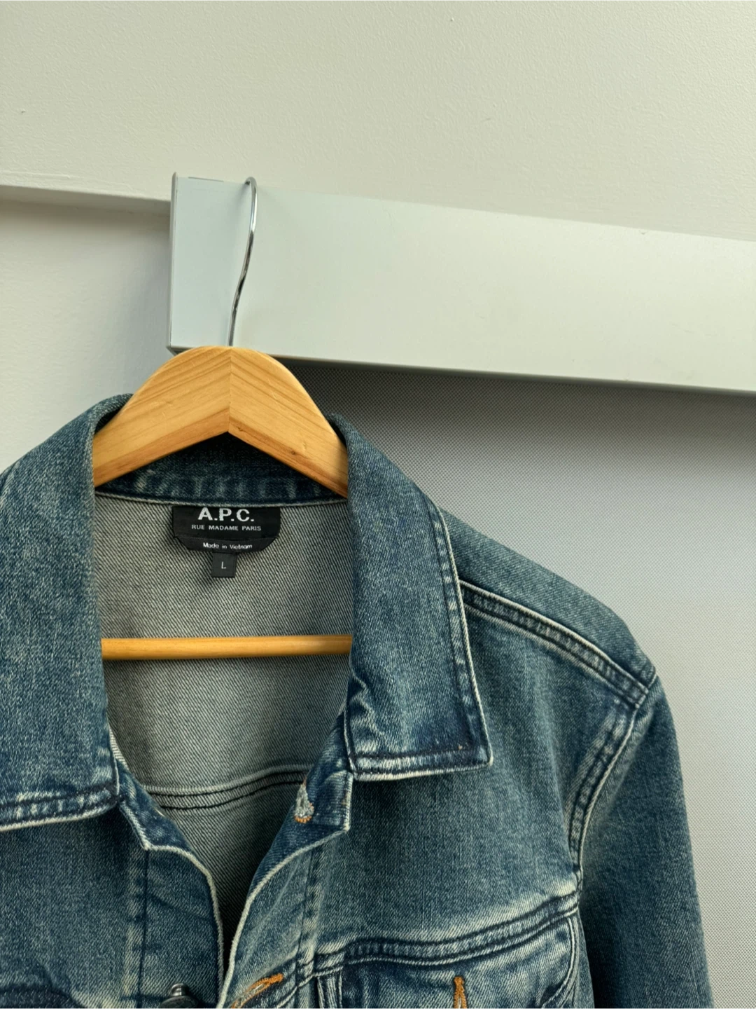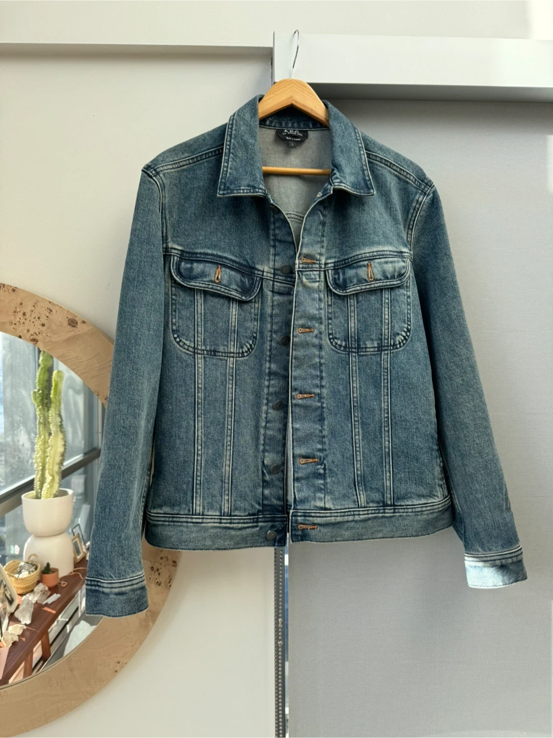 Men’s large A.C.P slim fit denim jacket. A man I dated gifted this to me because he purchased it for himself but was too fat to fit it. He repurchased it in XL and was still too chubby for it. Here I am.