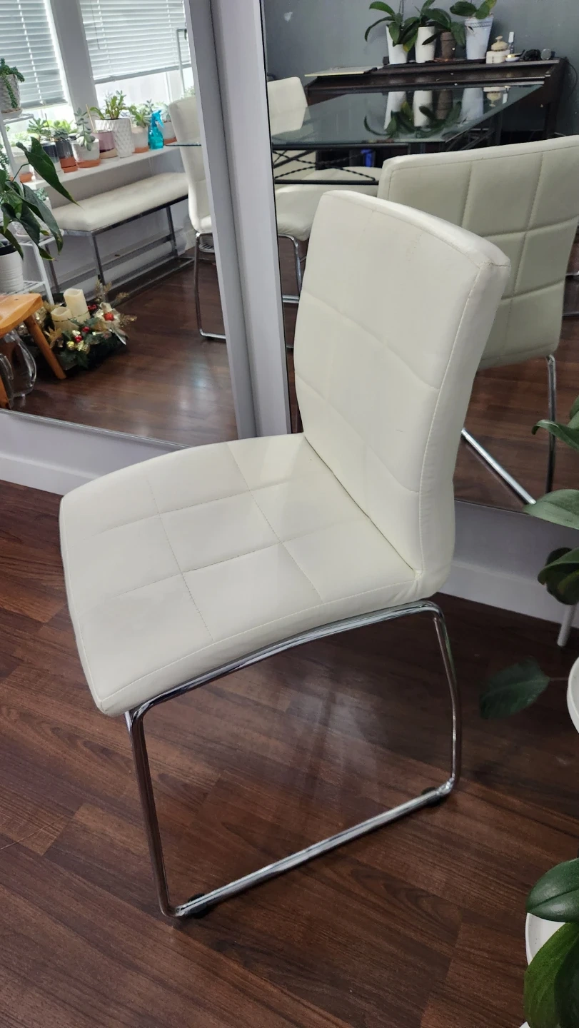 Selling 4 pcs. beautiful white leather dinning chairs, modern design with a quilted pattern on the backrest and a sleek chrome frame.