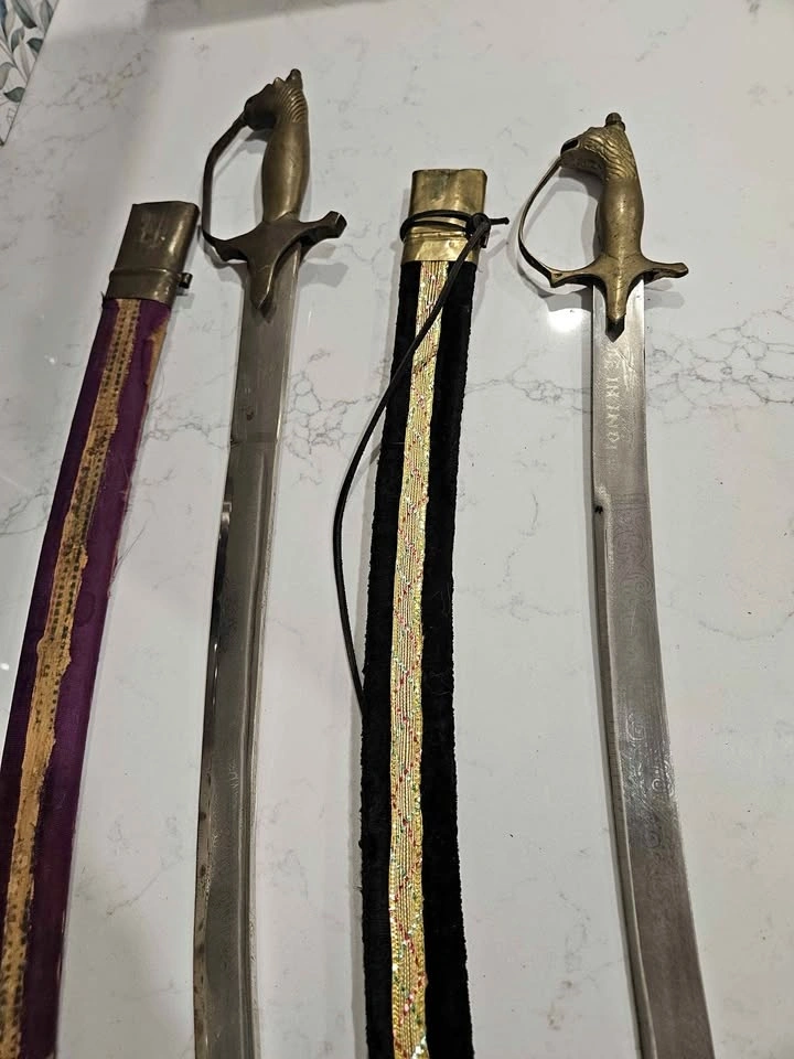 Pair of decorative ceremonial sabres with brass animal-head hilts and etched blades. Includes both matching scabbards with velvet covering. Solid, well-made display pieces with good weight and presence.
