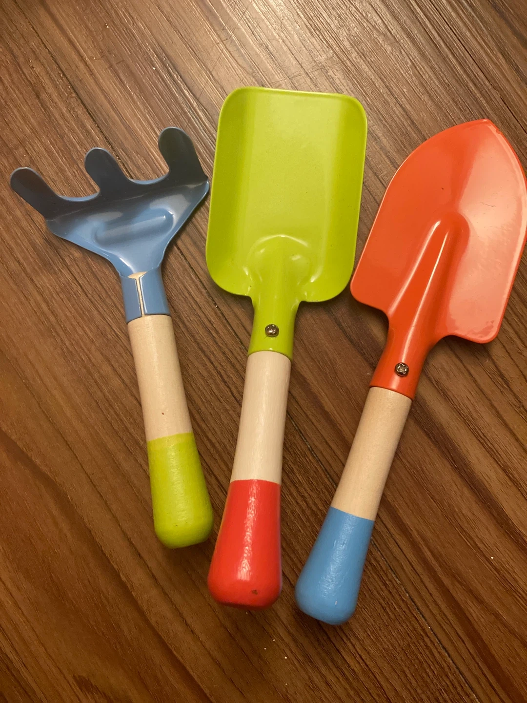 Giving away a set of colorful kids' gardening tools! Includes a blue rake, a green shovel, and an orange trowel. Perfect for little hands to help in the garden or play in the sand