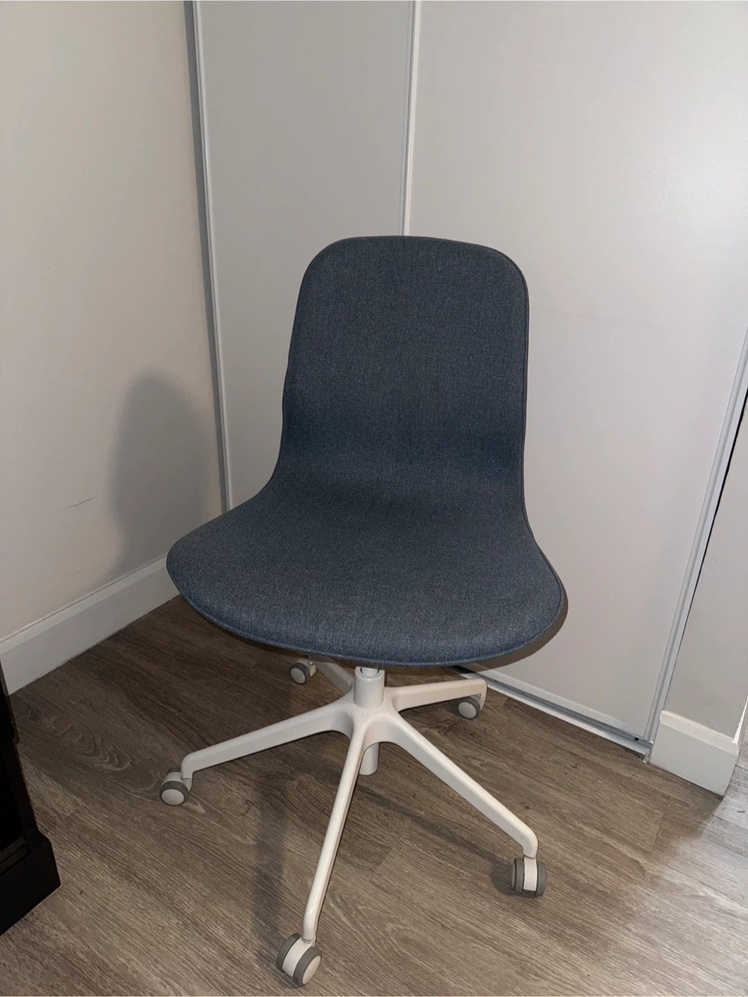 Selling an IKEA LÅNGFJÄLL office chair in Navy Blue. It's in good condition and ready to use for your home office or workspace. The chair features a comfortable seat and backrest, along with a sturdy base with wheels for easy movement. Perfect for long hours of work or study!