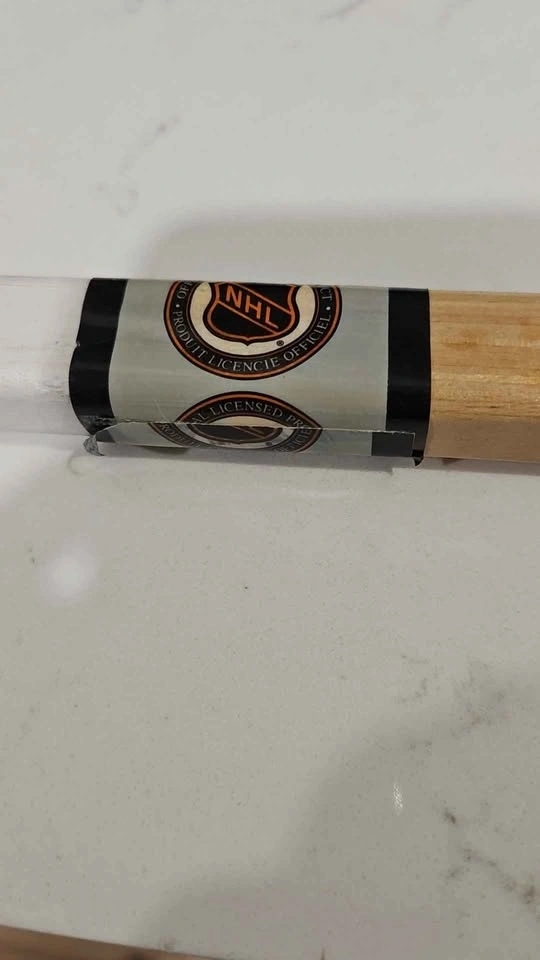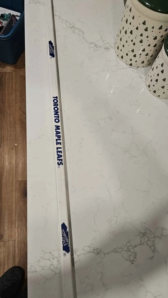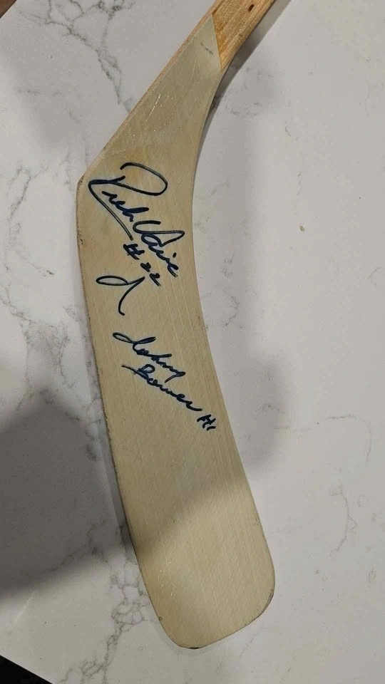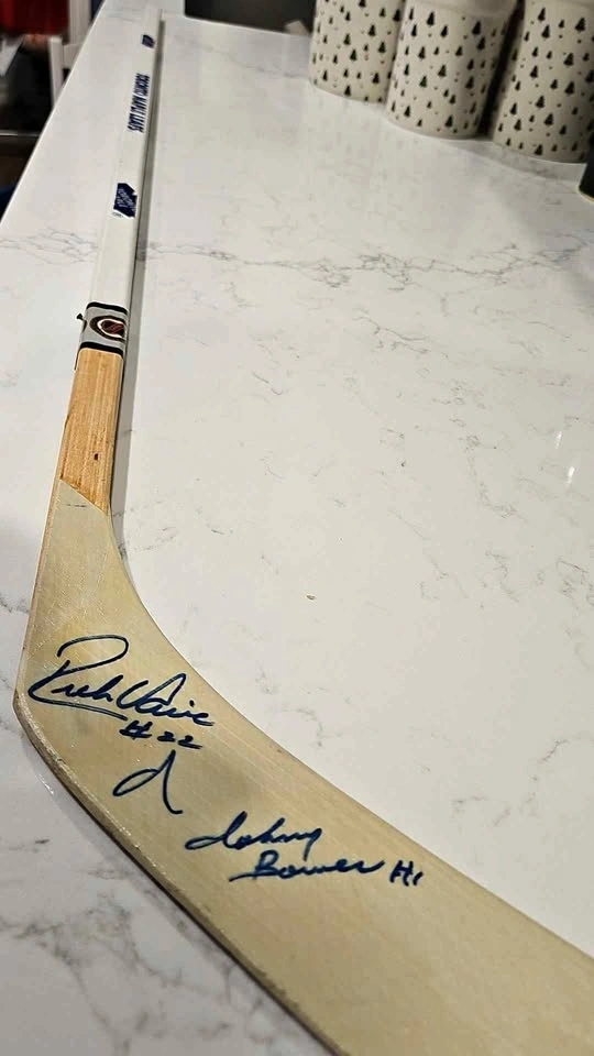 Wooden hockey stick signed by Johnny Bower (Hockey Hall of Fame) and Rick Vaive (#22). Signatures are clearly visible on the blade. This appears to be a display/collectible stick rather than game-used. Stick is in good overall condition with light wear consistent with age and display. A great piece of Toronto Maple Leafs memorabilia for a fan, collector, or sports room.