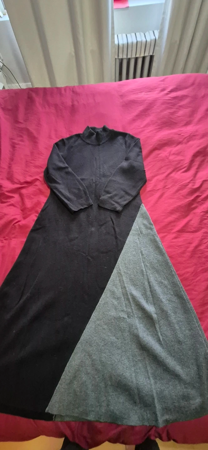 Selling a Calvin Klein dress in size M. It features a stylish colour block design with black on top and grey on the bottom. The dress is in great condition and ready for a new home!