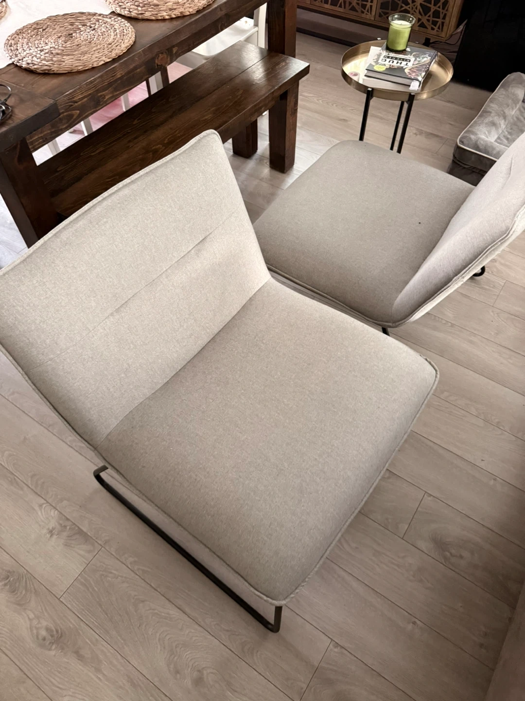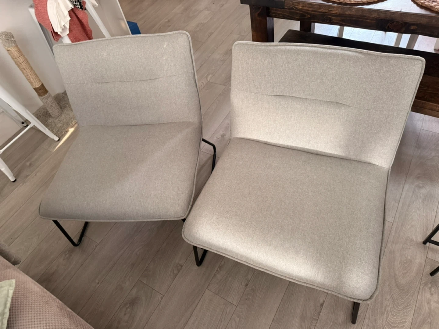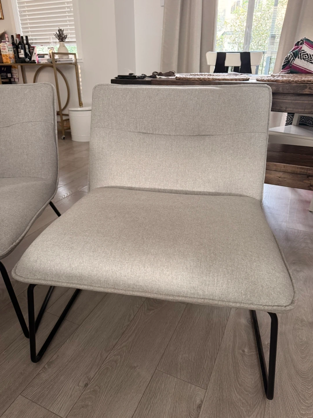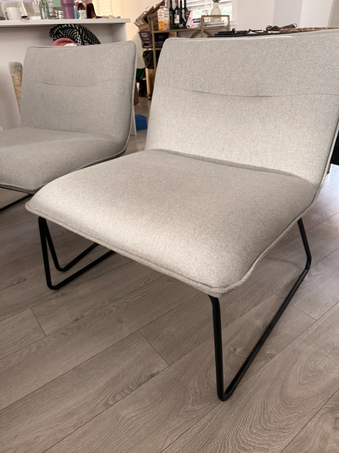 Selling 2 modern accent chairs in light grey. Price is for both. It's a stylish piece that would look great in any living space. Price is for both. The chair has a sleek design with black metal legs. There are some signs of wear on the back of the chair.