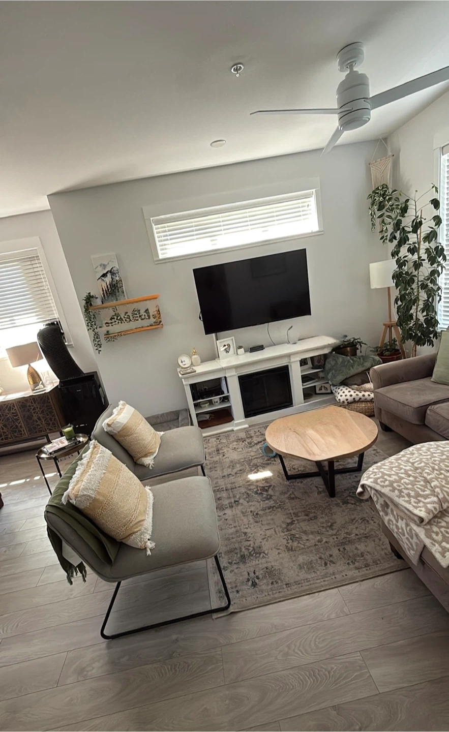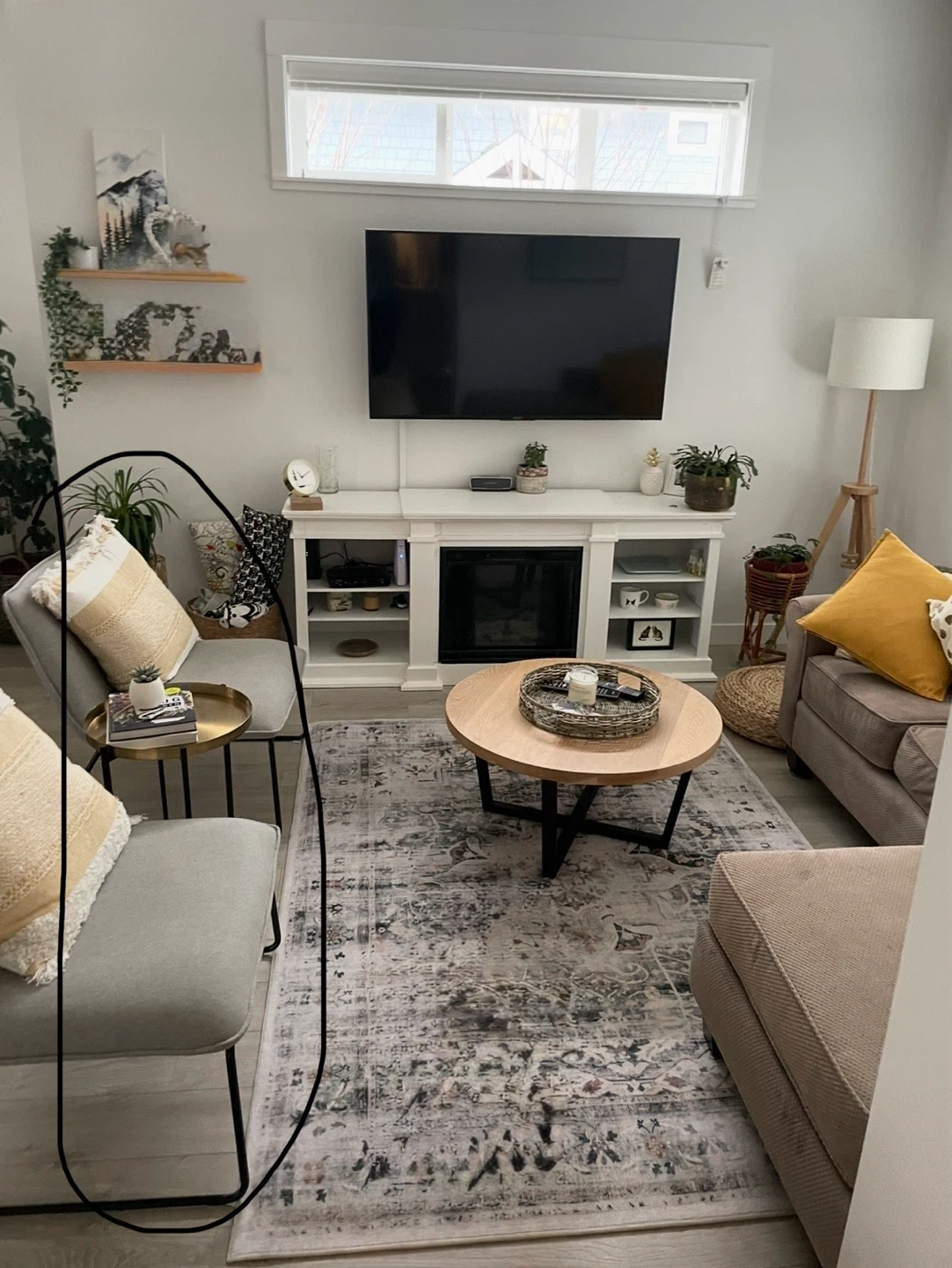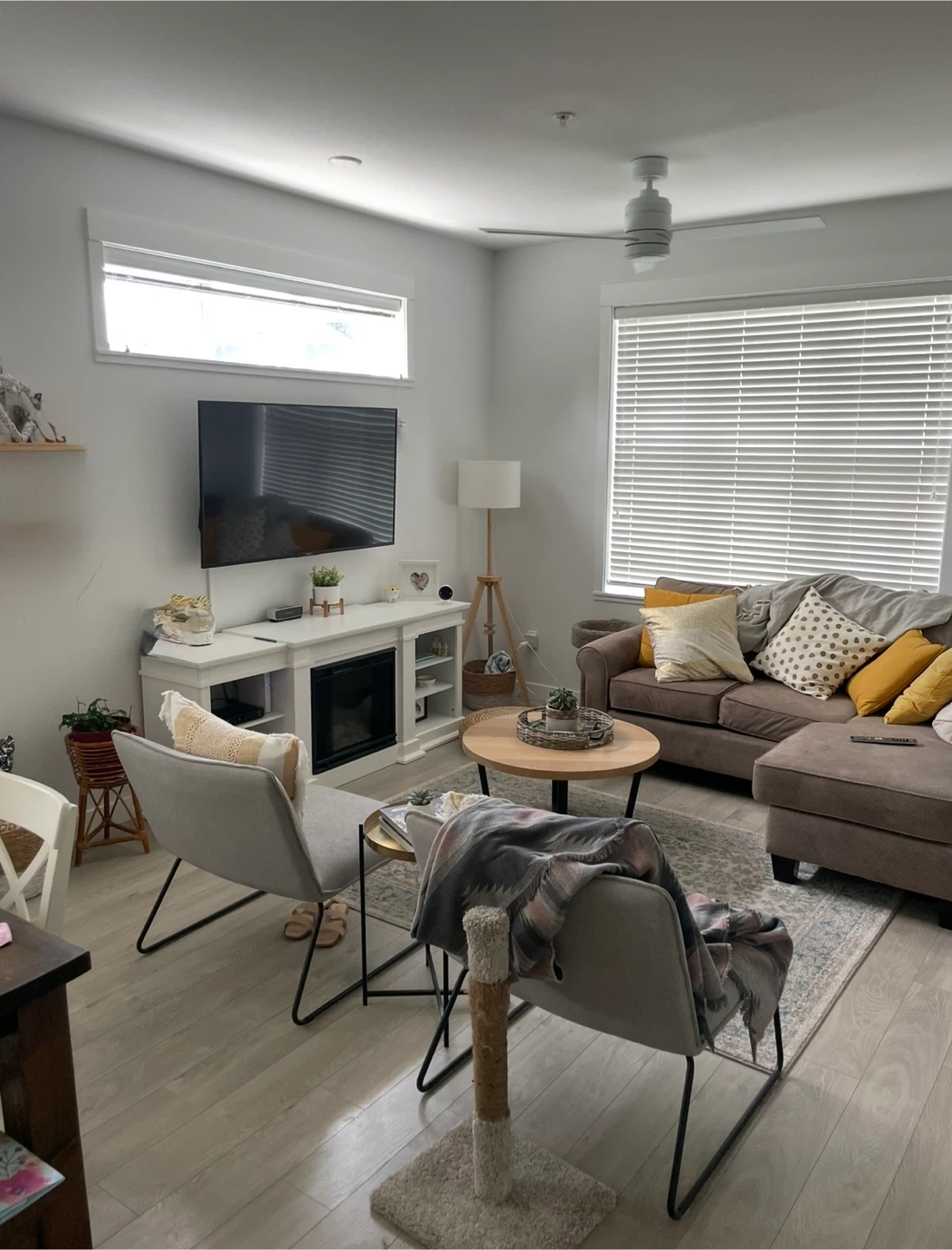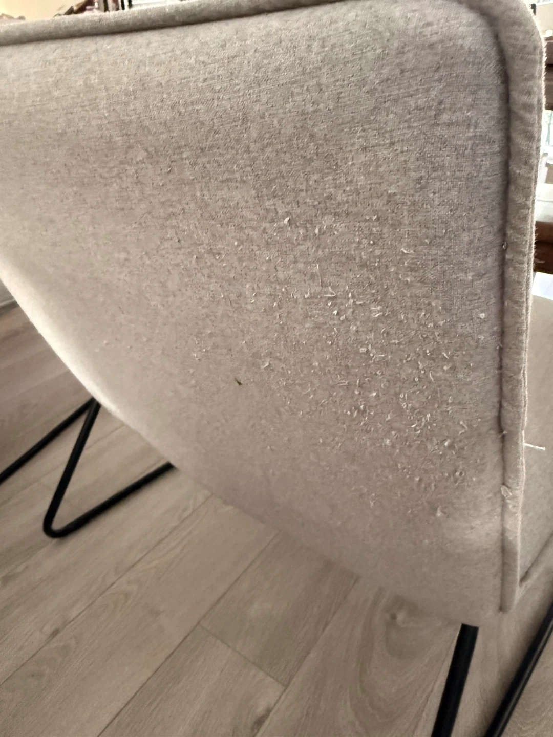 Selling 2 modern accent chairs in light grey. Price is for both. It's a stylish piece that would look great in any living space. Price is for both. The chair has a sleek design with black metal legs. There are some signs of wear on the back of the chair.