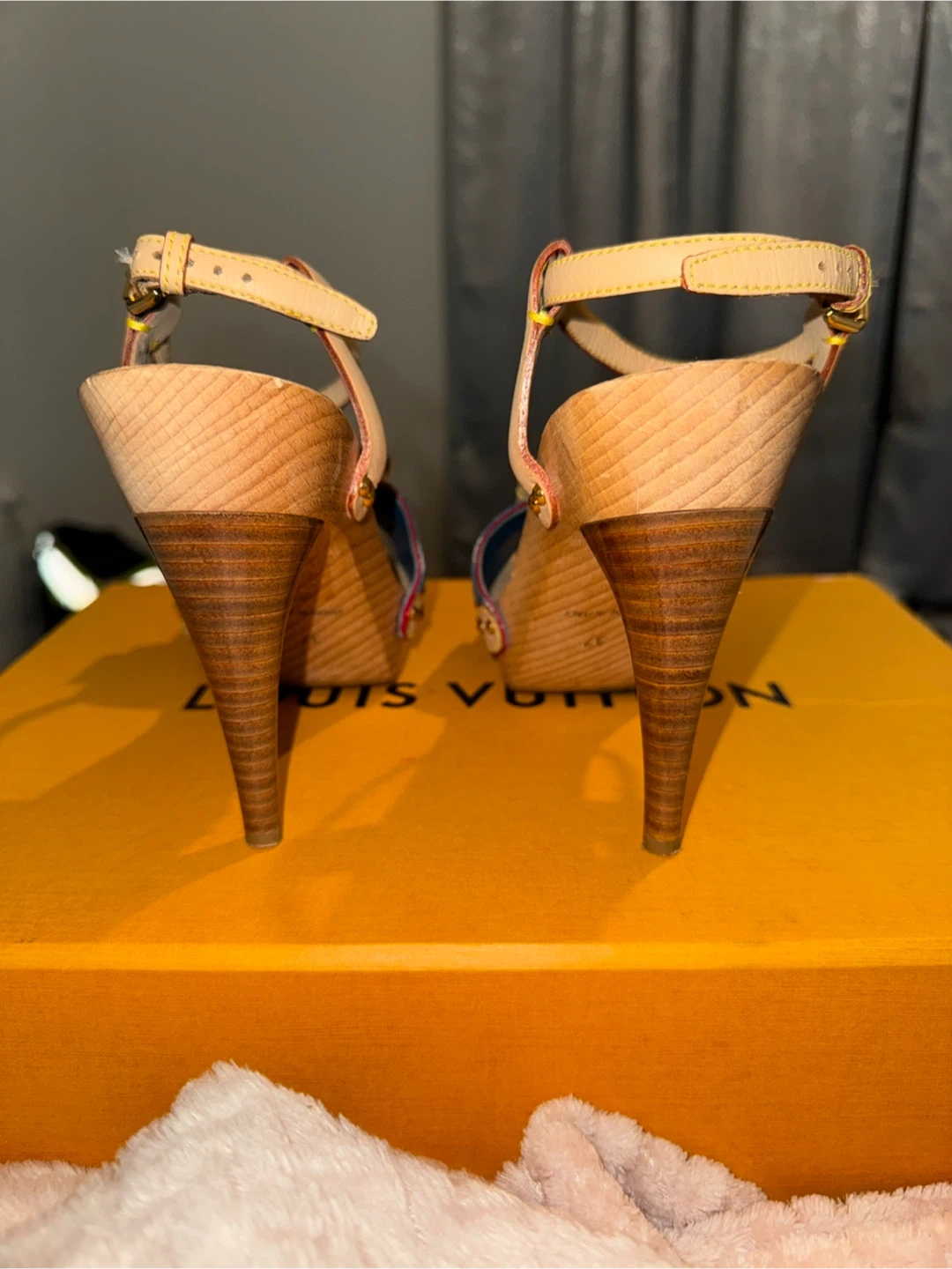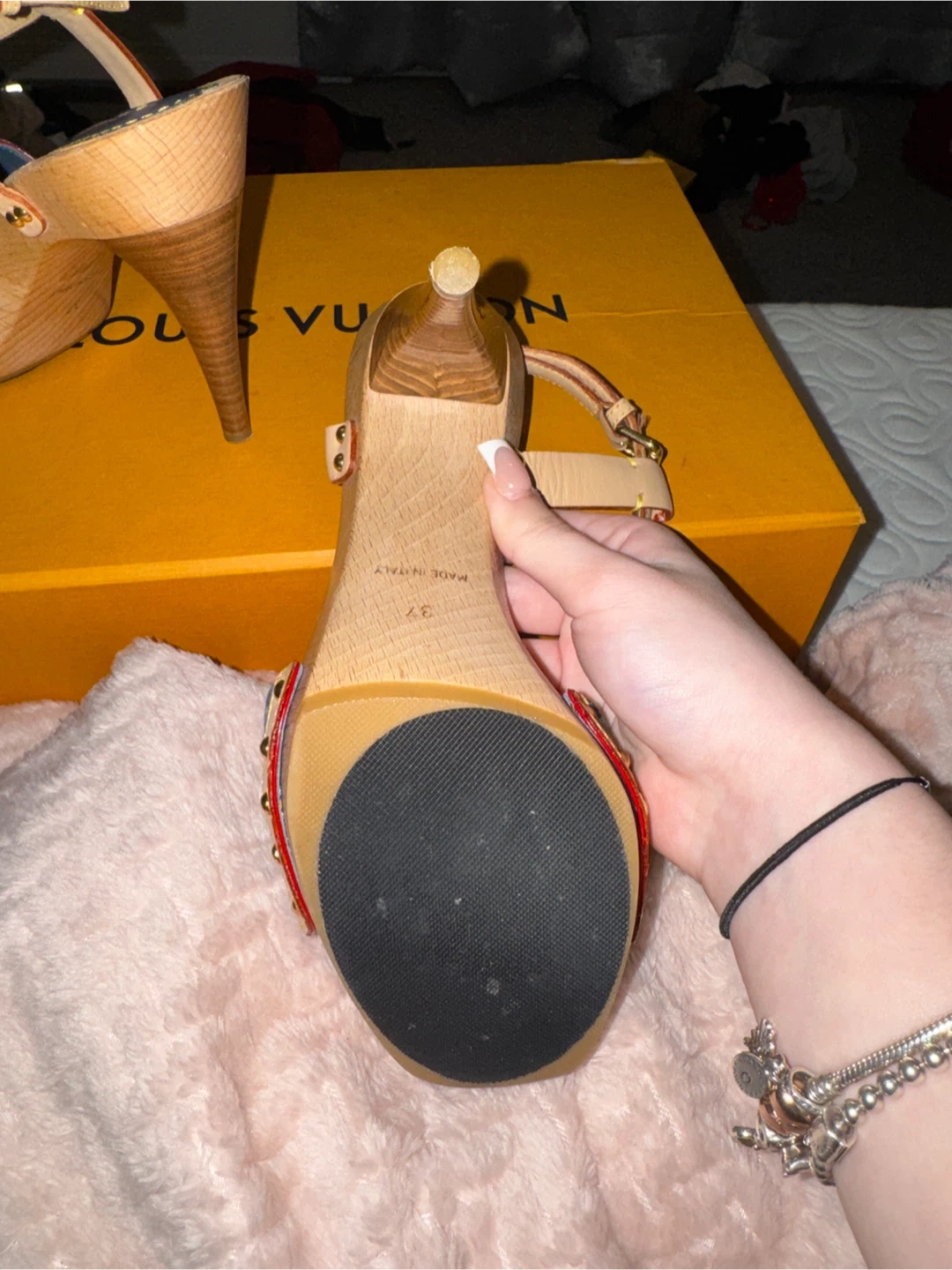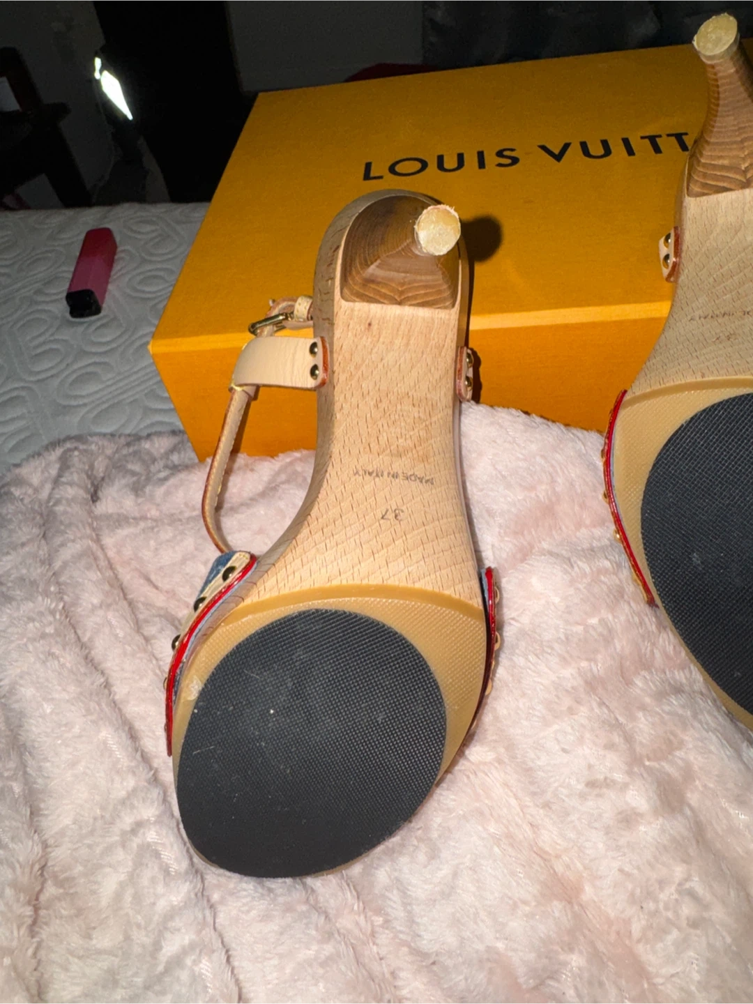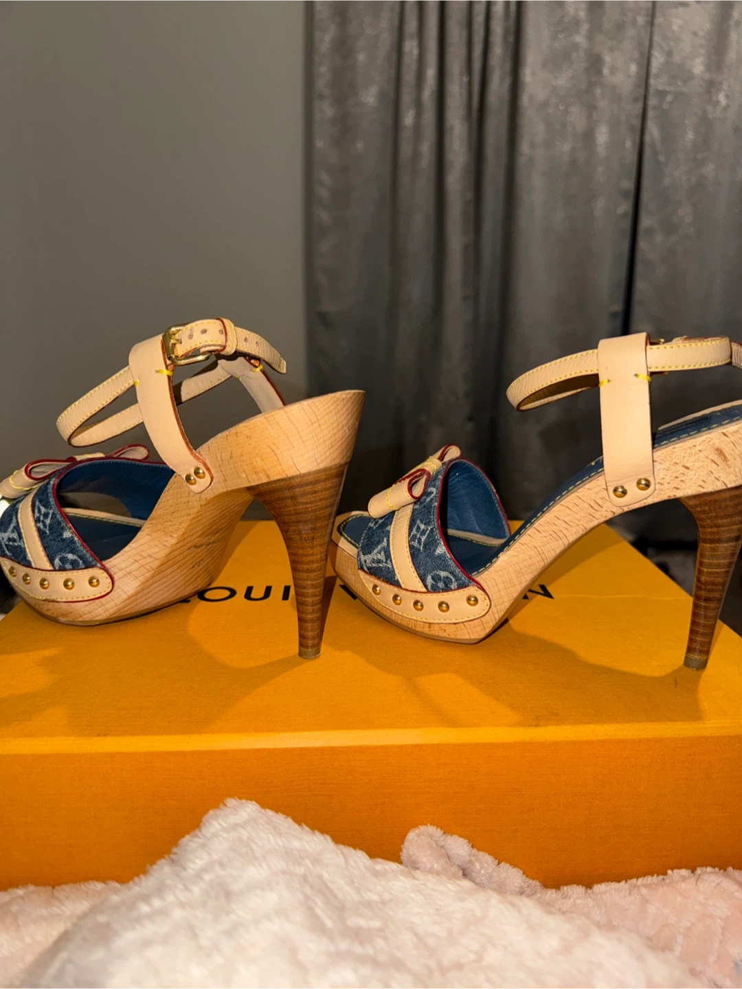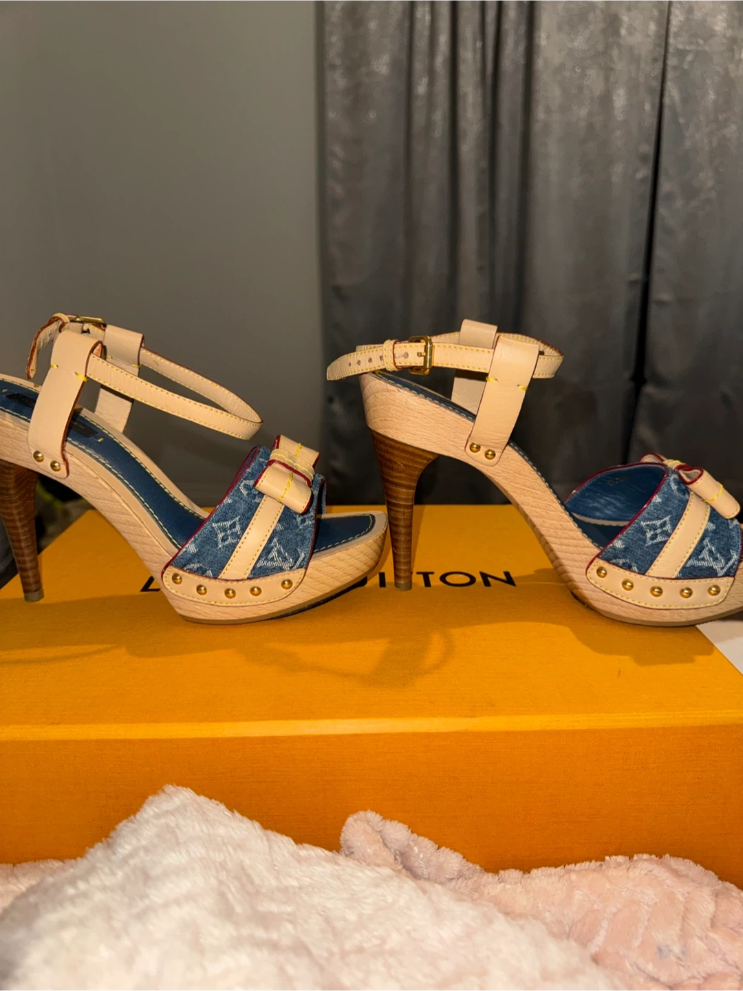 Selling a pair of Louis Vuitton platform sandals! They feature a denim and leather design with a wooden heel. Size 37 (European sizing). Comes with the original box and bag!