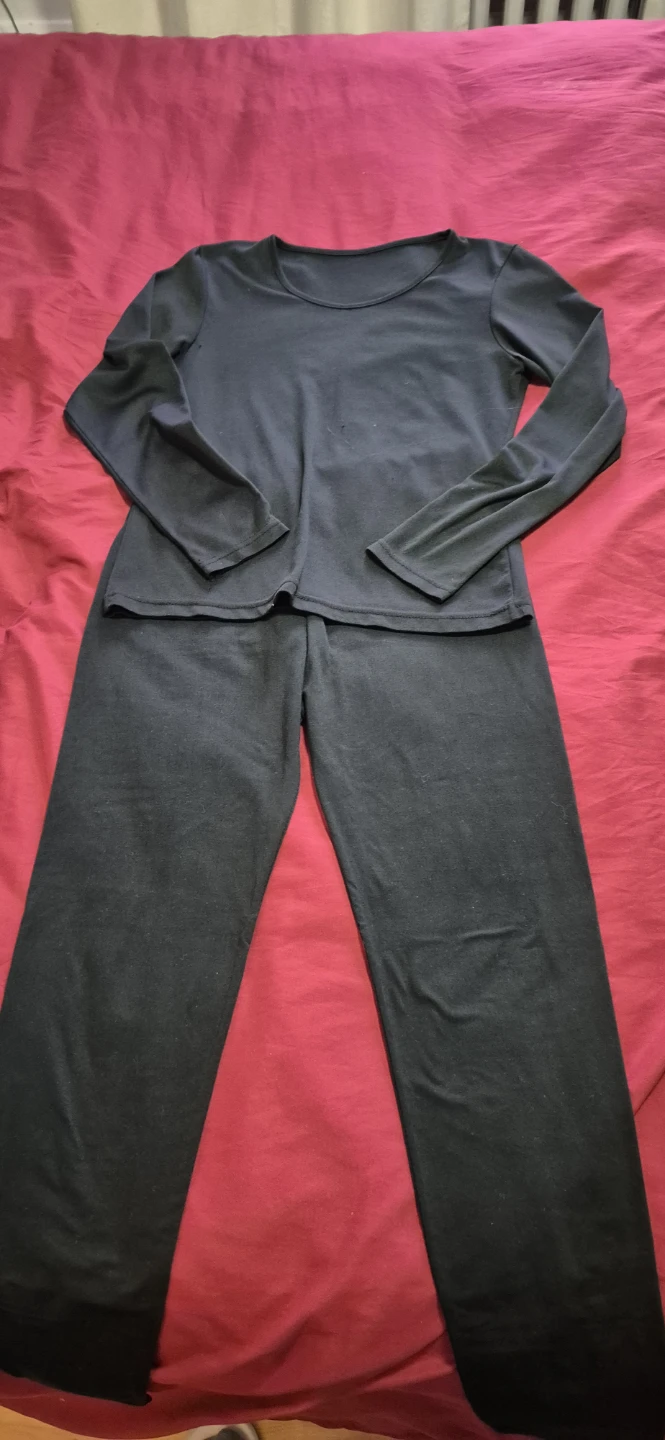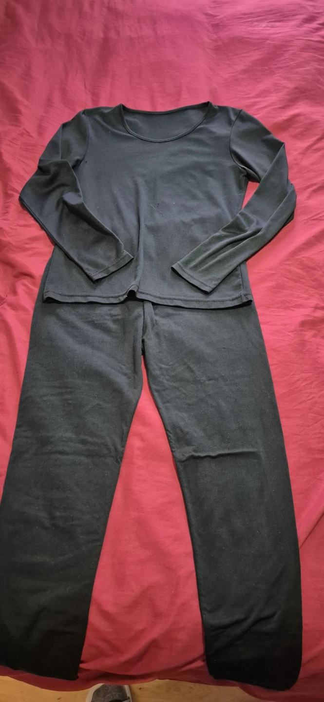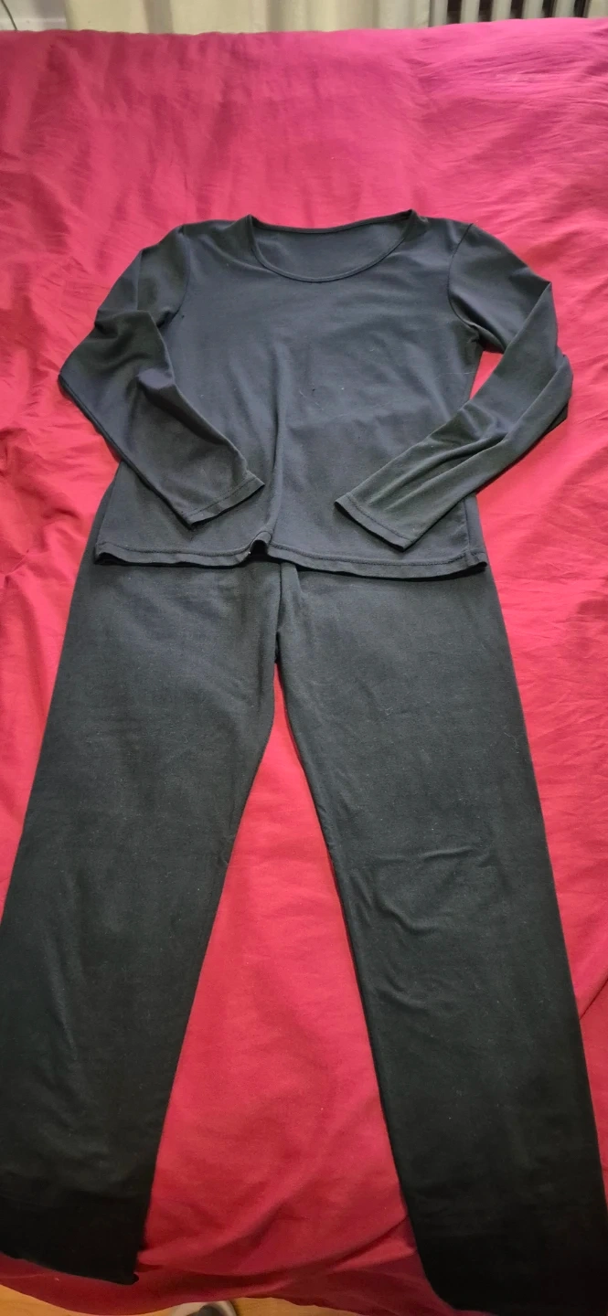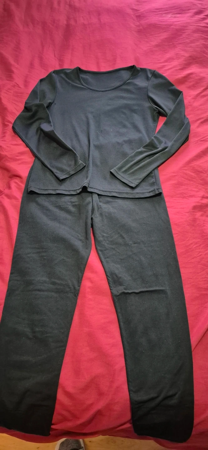 Here's a comfy black long sleeve pajama set! Perfect for lounging around the house or getting a good night's sleep. The set includes a long-sleeved top and matching pants. It's in great condition and ready for a new home
