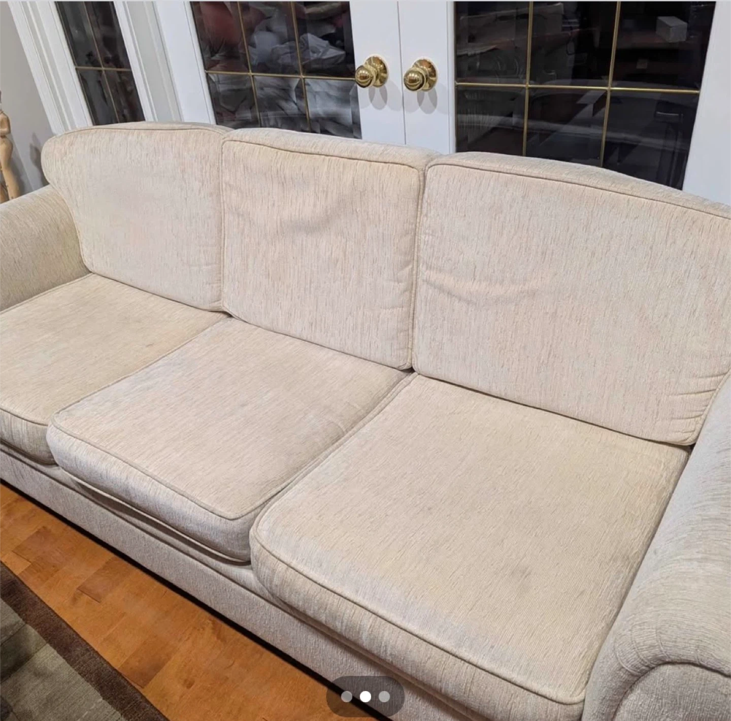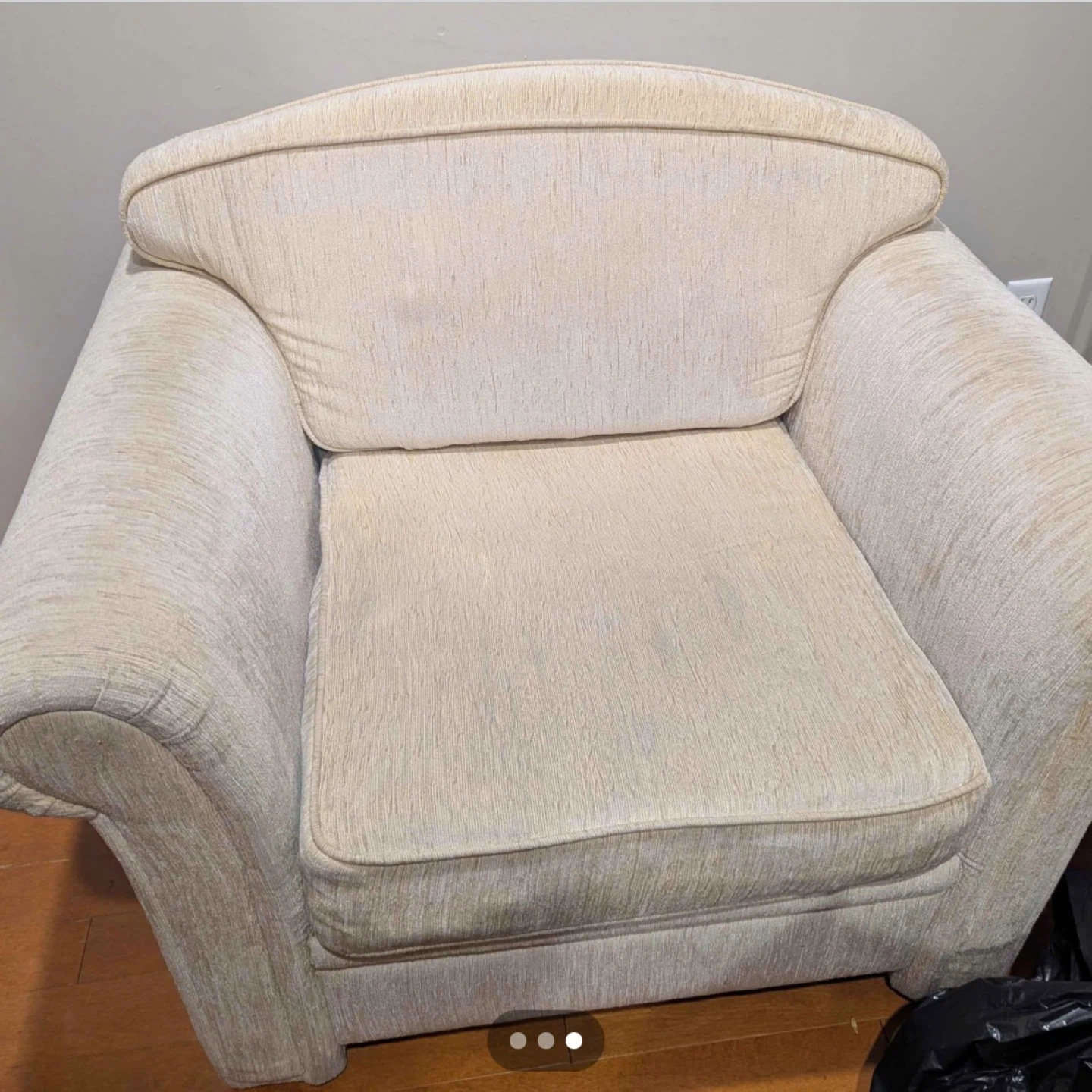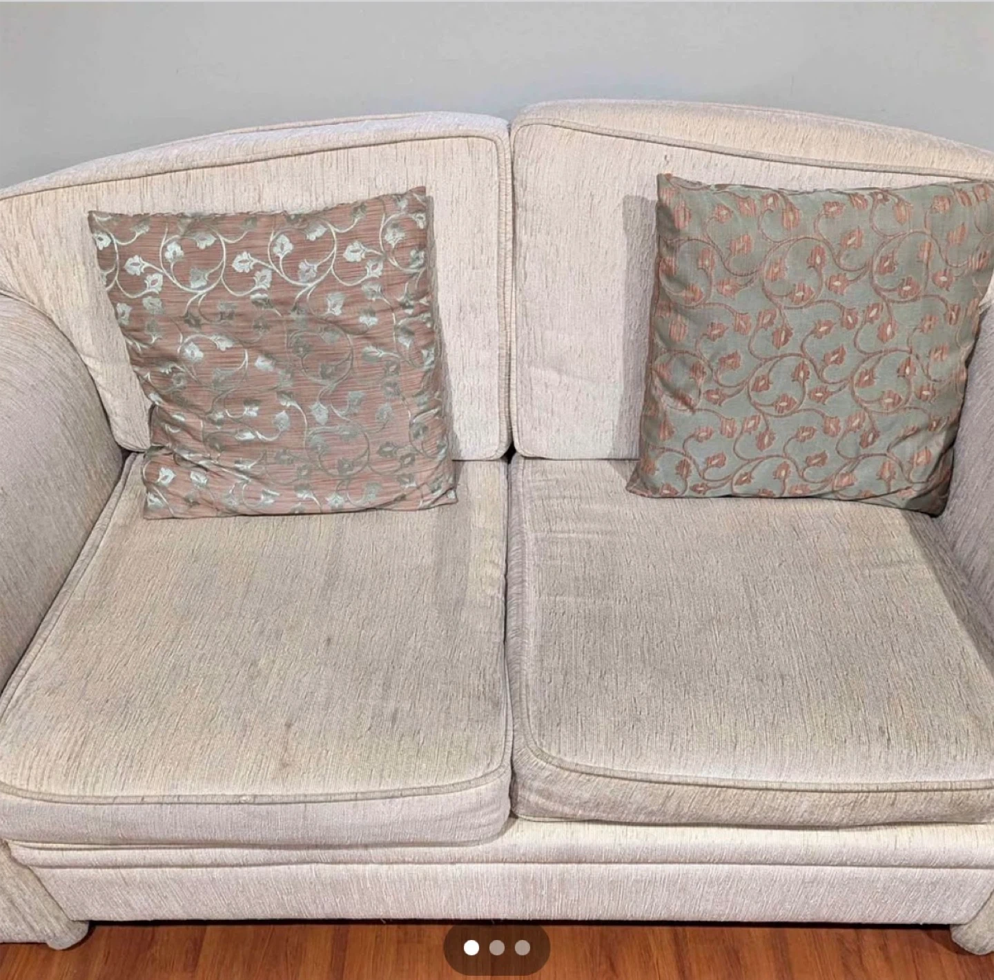 Selling a comfy sofa and armchair set! They're both in a beige colour and would be great for a living room or den. Perfect for relaxing and adding a cozy touch to your home