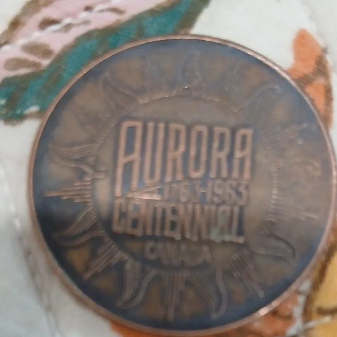 Selling a commemorative coin for the Aurora Centennial in Canada, marking the years 1763-1963. It's a unique piece of Canadian history!