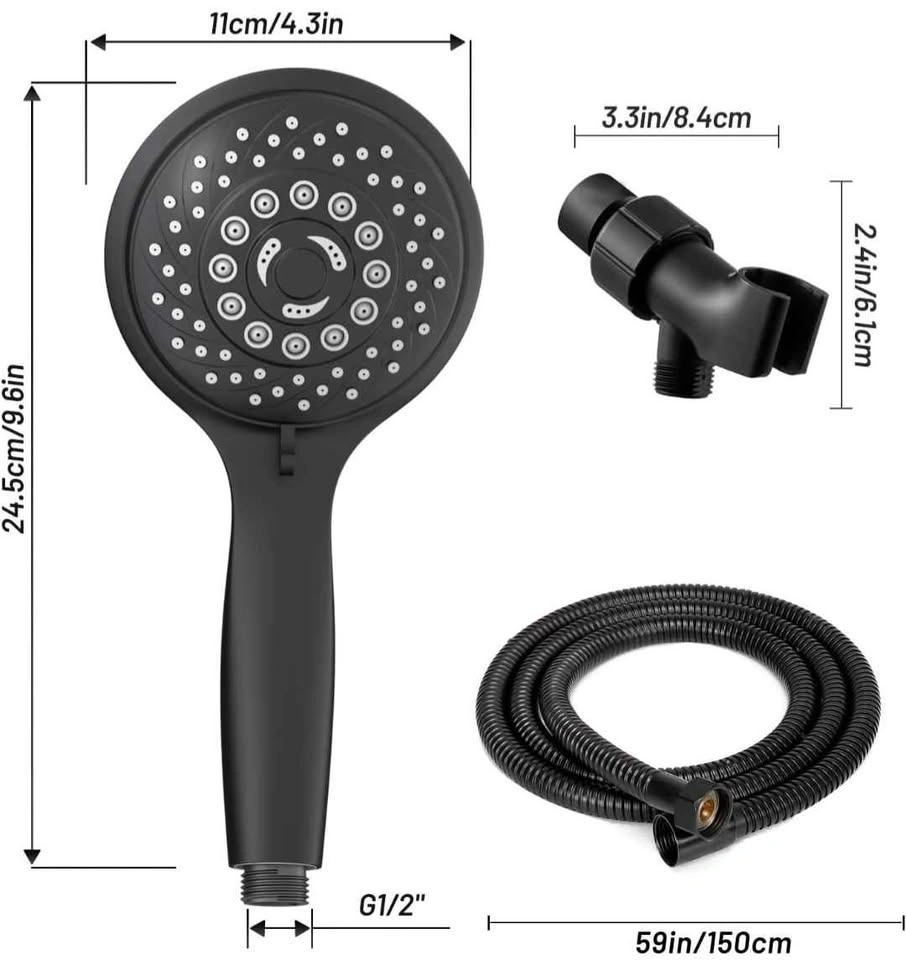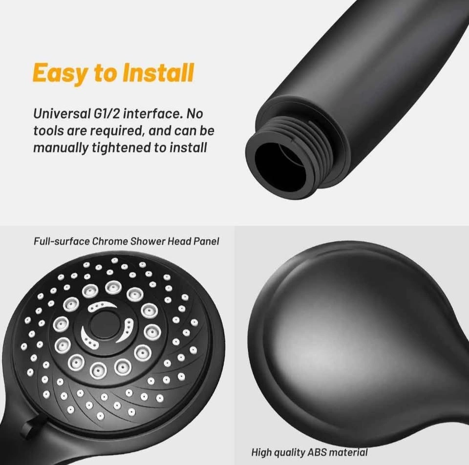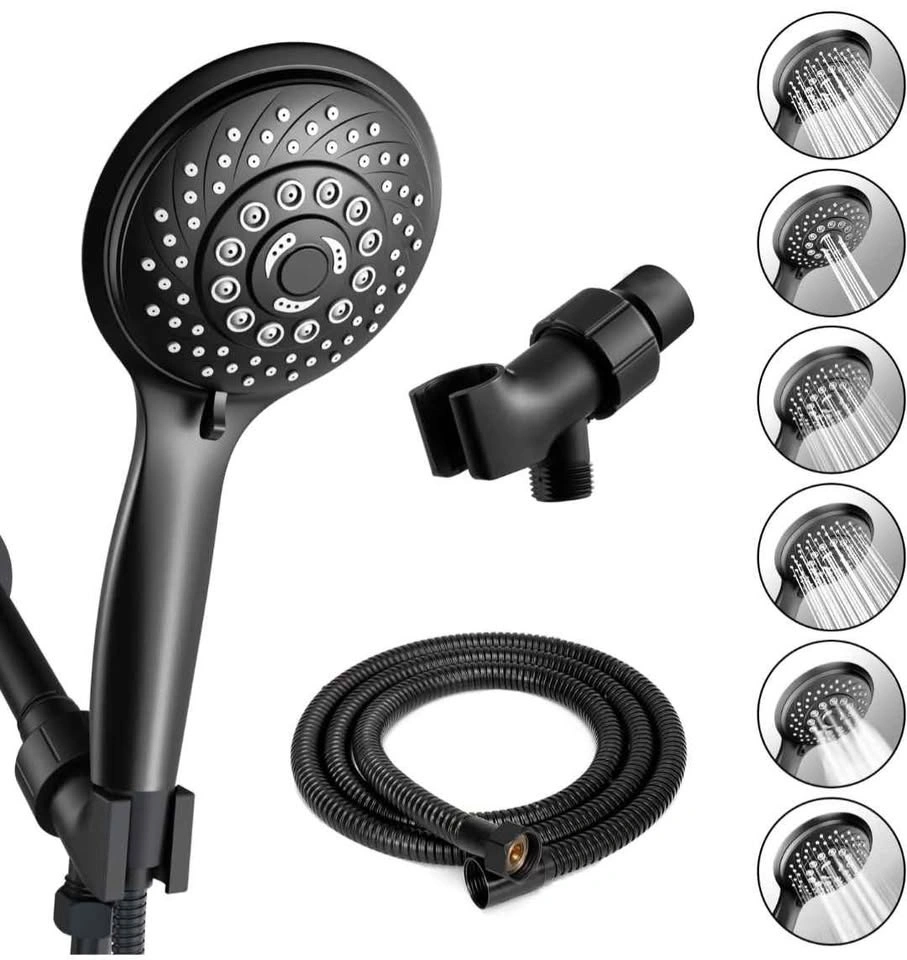 Modern handheld shower head set with multiple spray settings, designed to save water while providing strong and comfortable water pressure. Stylish black finish that suits any bathroom.