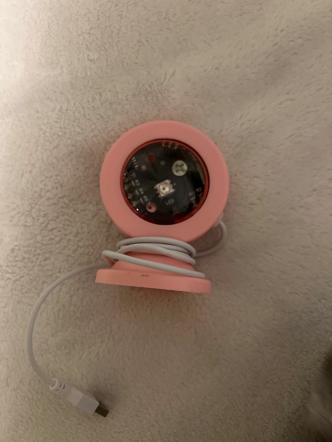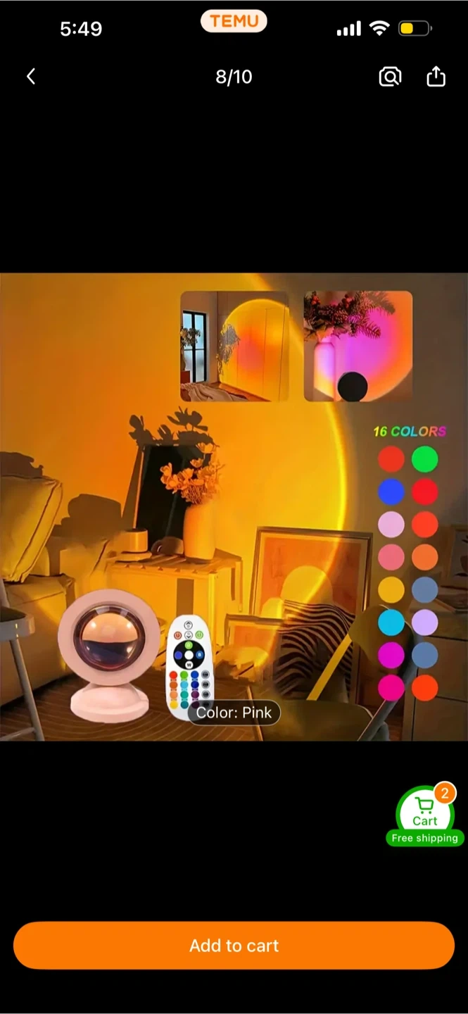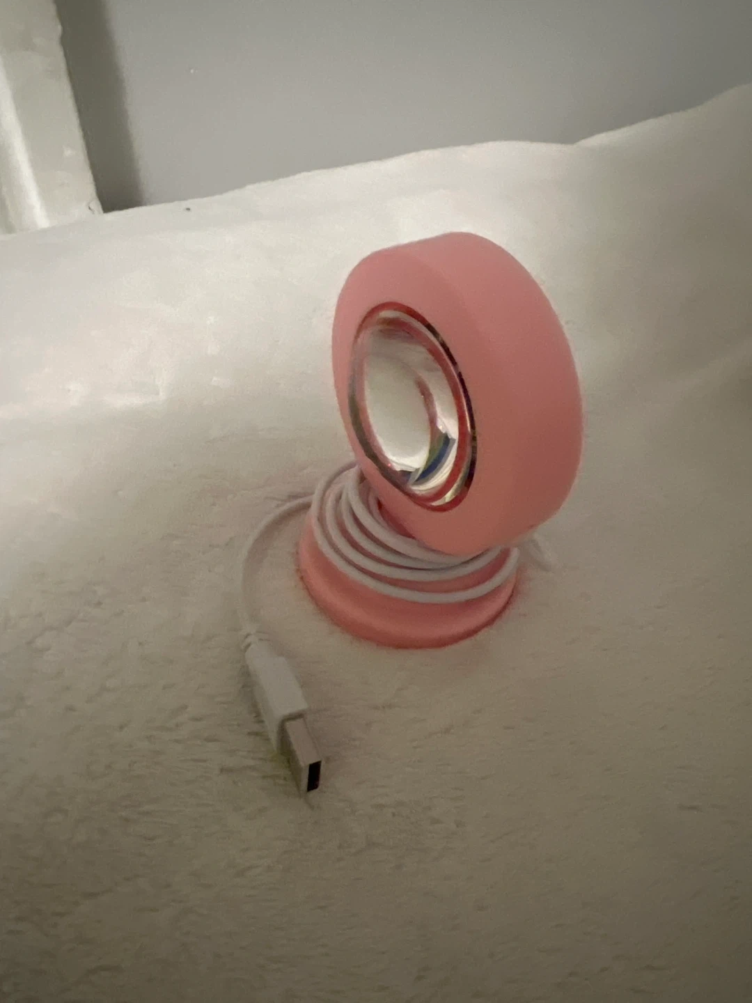 This is a pink sunset projection lamp. It has 16 colours and is lightweight and portable. It comes with a USB cable.
