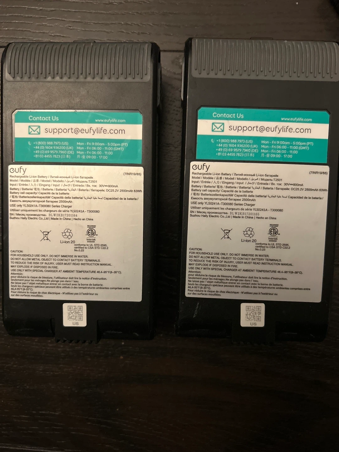 Selling two Eufy rechargeable Li-ion batteries, model T2501. They require a 30V 800mA input and have a battery capacity of DC25.2V 2500mAh 63Wh. Only use YLS0241A-T300080 series chargers with these batteries