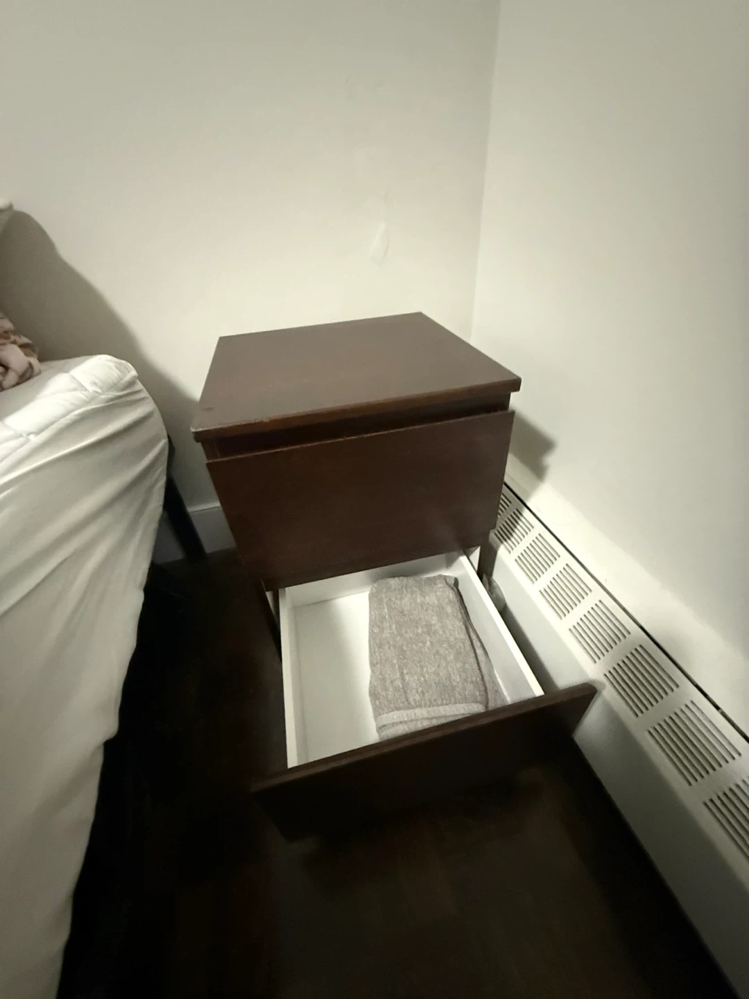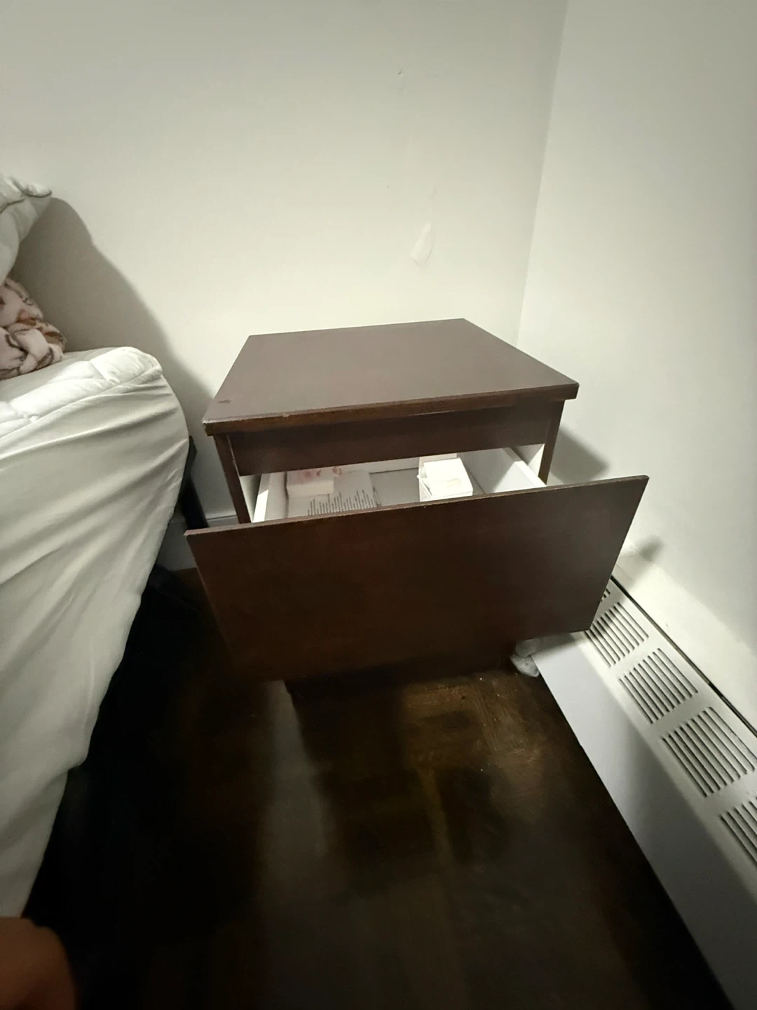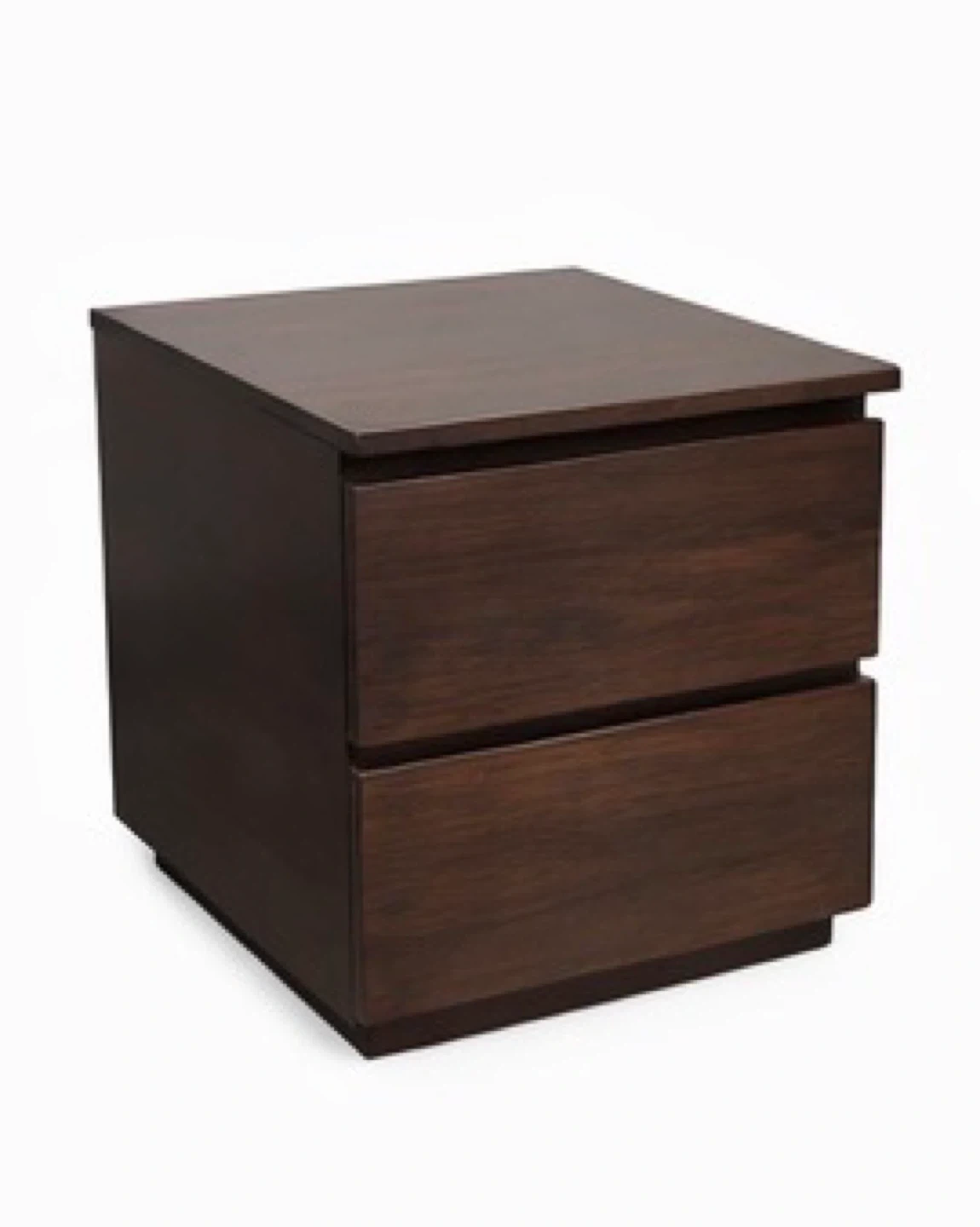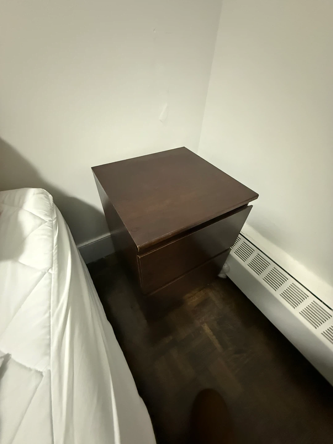 Here's a lovely brown wood nightstand, perfect for adding some storage beside your bed. It features two drawers, offering ample space for your nighttime essentials. It's in great condition and ready to be a functional and stylish addition to your bedroom!
