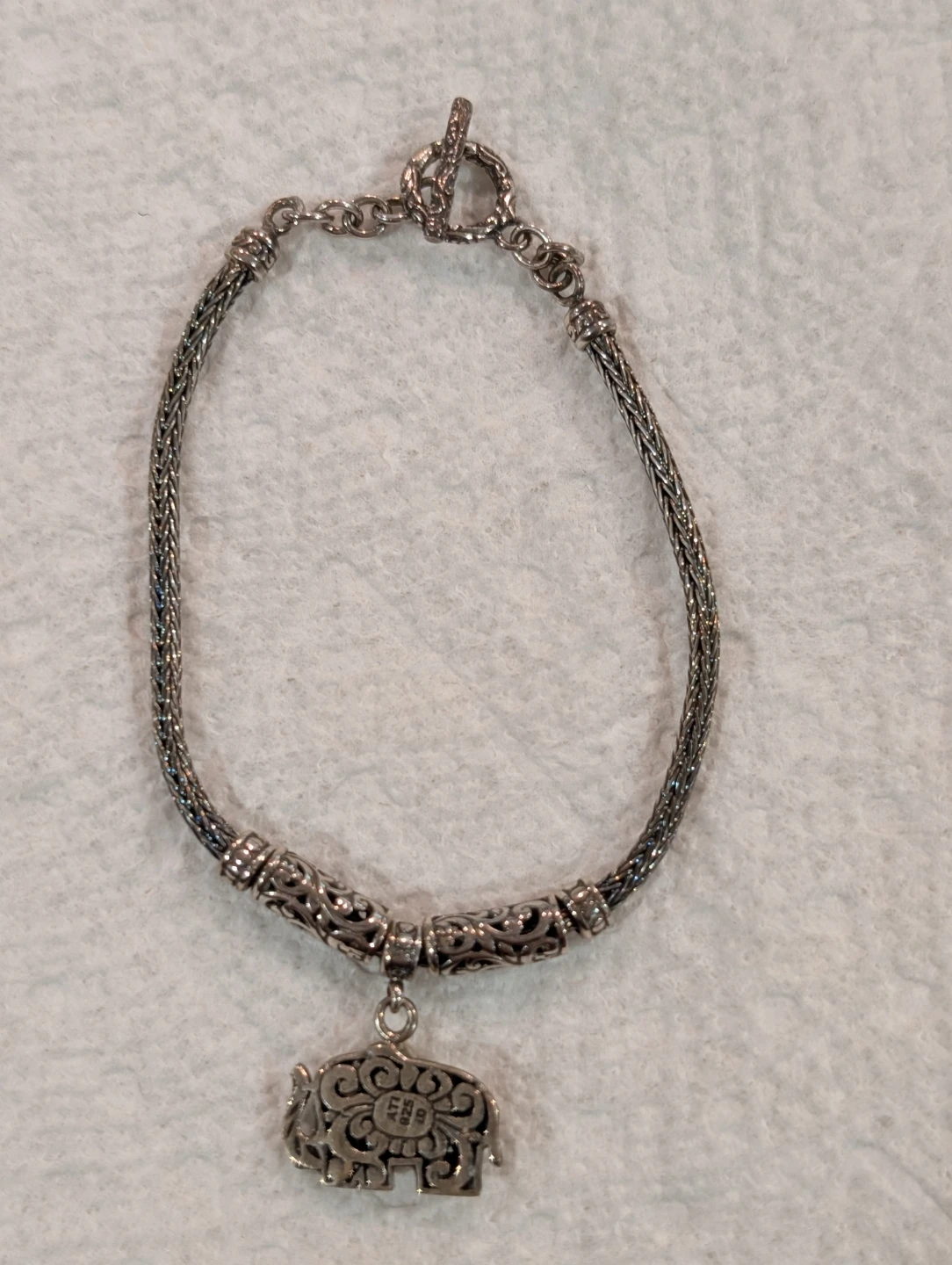 This is a sterling silver bracelet with an elephant charm. The elephant charm has an intricate design. The bracelet has a toggle closure and is marked "925". The charm is also marked "925". This gorgeous bracelet has Byzantine design on either side of the elephant charm, and the rest of the bracelet is wheat chain. Weight is 10.60 grams.