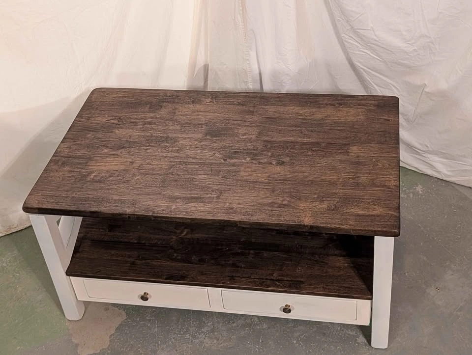 Just finished! This is a stunning, high-quality solid hardwood coffee table. It is an incredibly solid and heavy piece (weighing around 200 lbs)—built to last a lifetime.