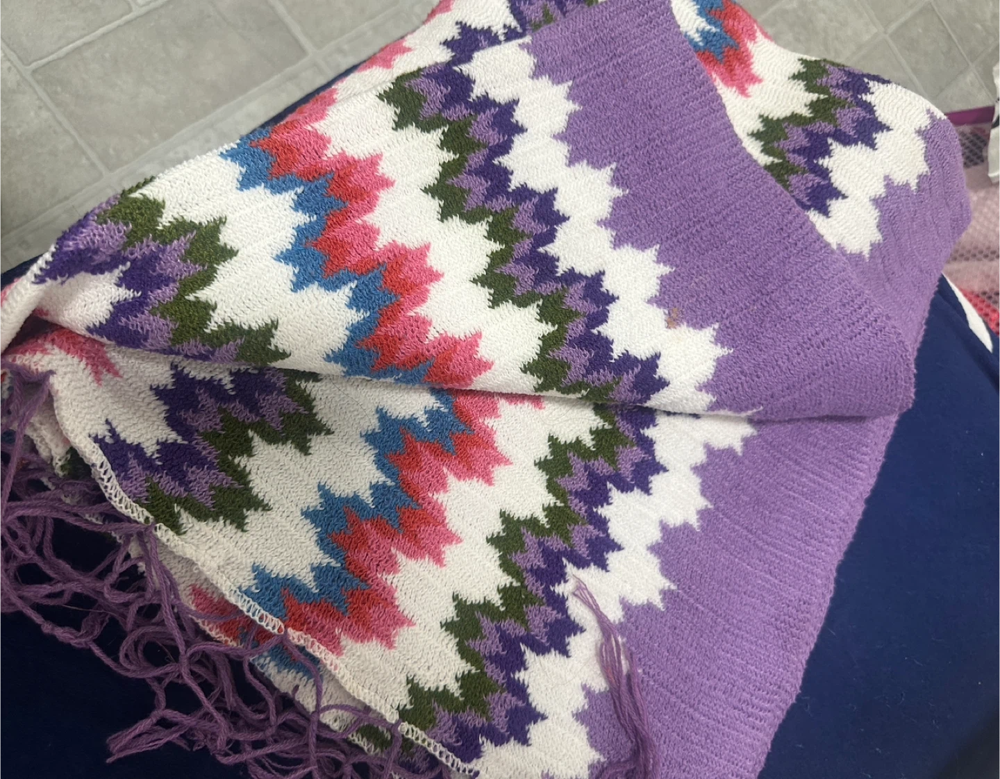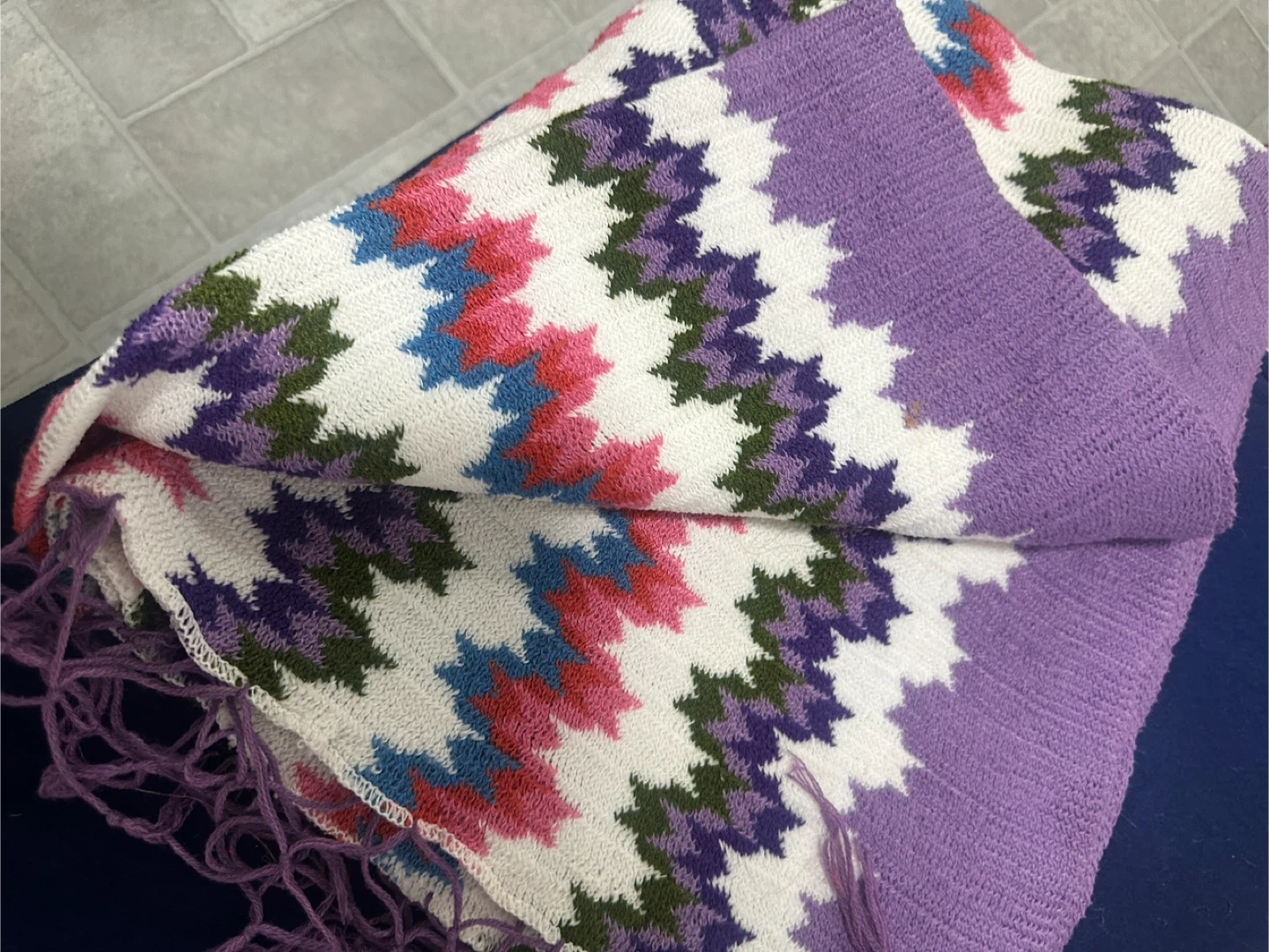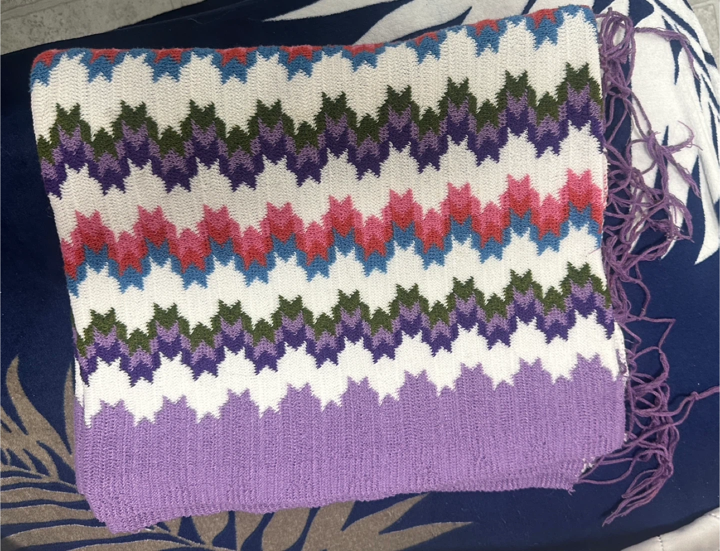 Selling a cozy scarf with a fun zigzag pattern! The colours are mostly purple and white, with hints of pink, blue, and green. It also has cute fringe detailing.